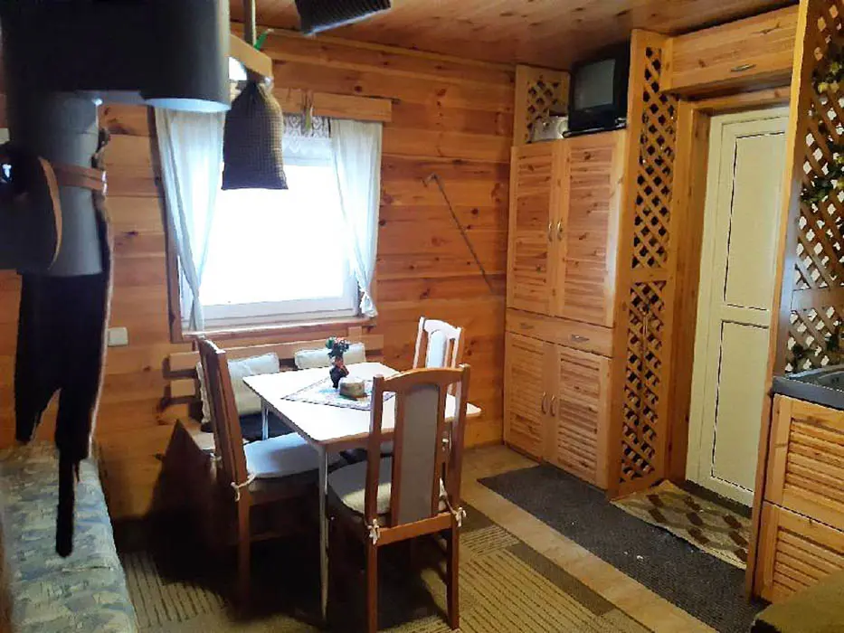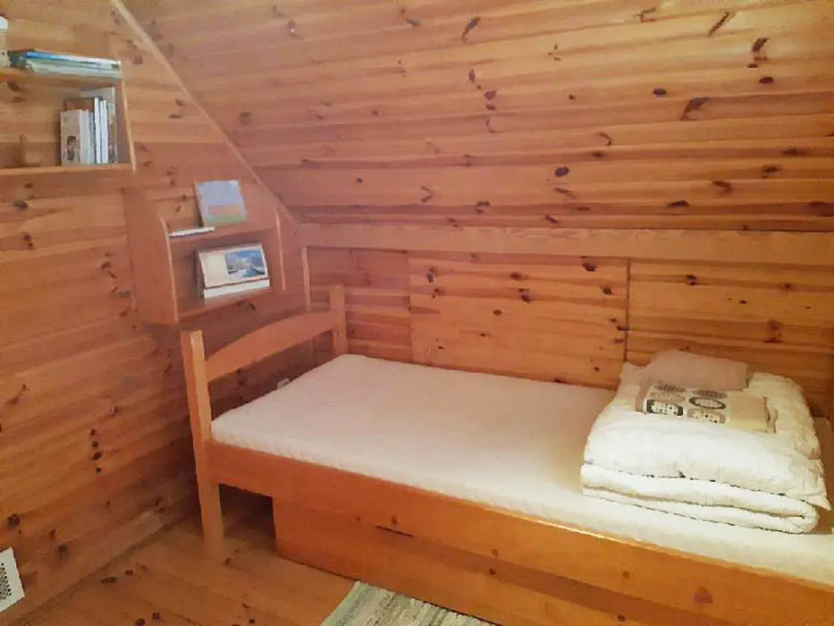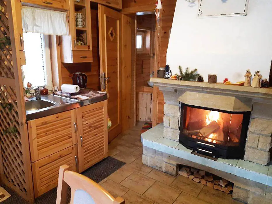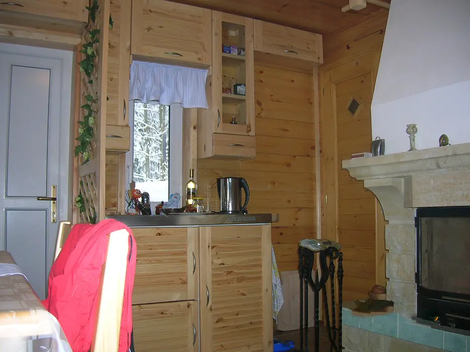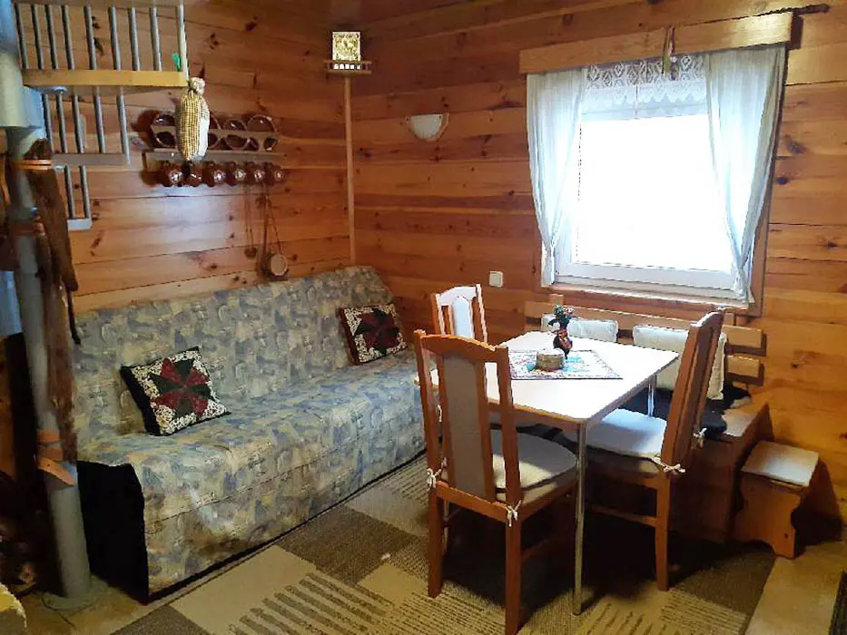 Obytná část spojená s kuchyňkou - rozkládací sedačka ( 1 přistýlka ), krb, TV, jídelní stůl a židle, vybavení kuchyně - varná konvice, nádobí, lednice. V patře 2 ložnice - 1x2, 1x3 lůžka ( zde je menší postel pro děti do 10 let ). Sociální zařízení - koupelna se sprchovým koutem, WC, pračka. Topení - krb, el.přímotop. PITNÁ VODA NENÍ, POUZE UŽITKOVÁ !