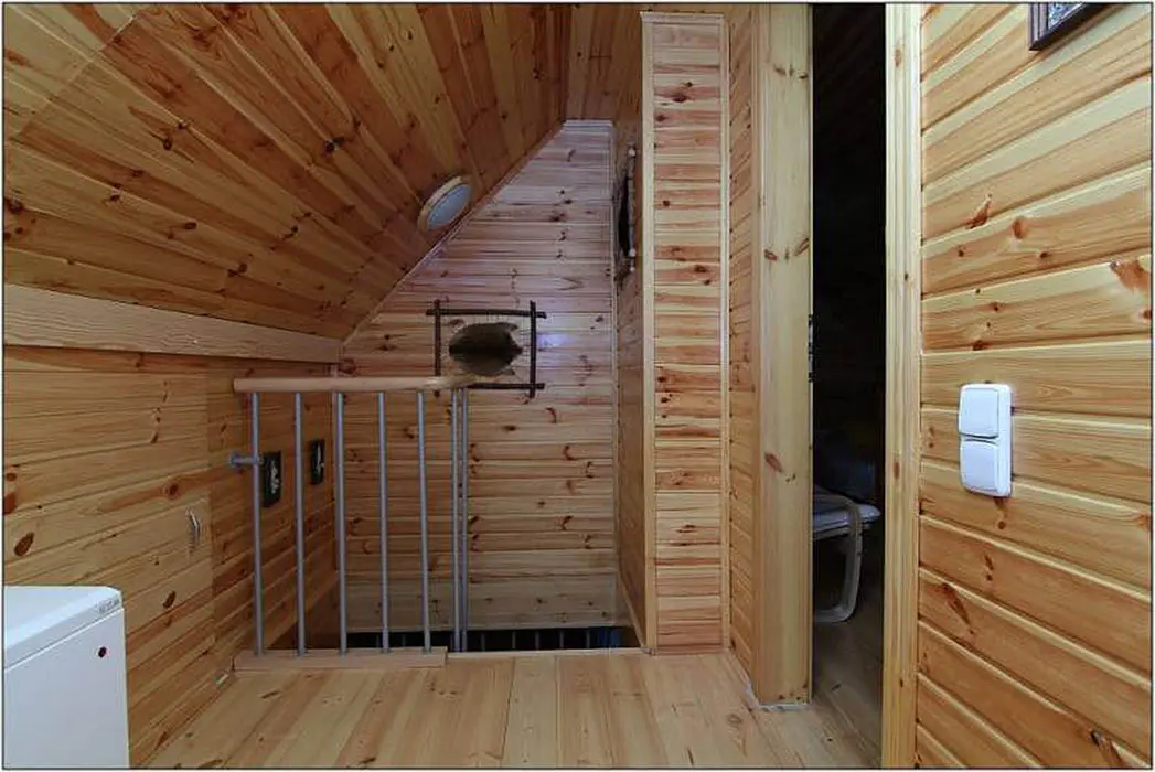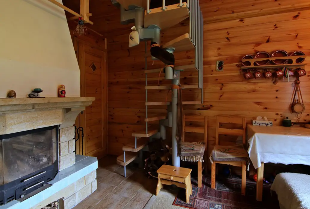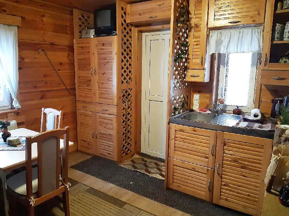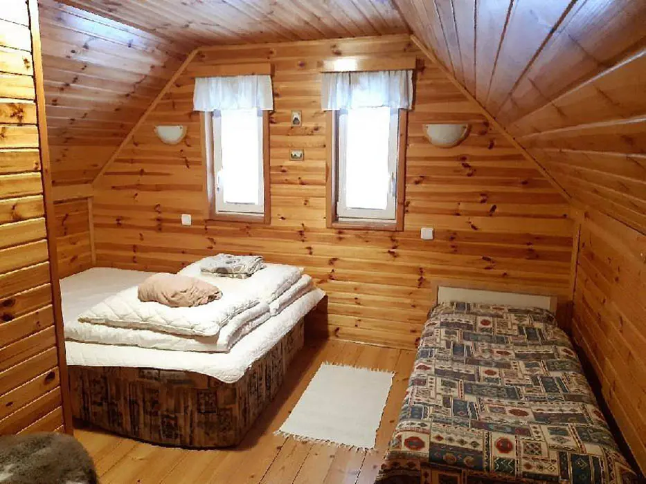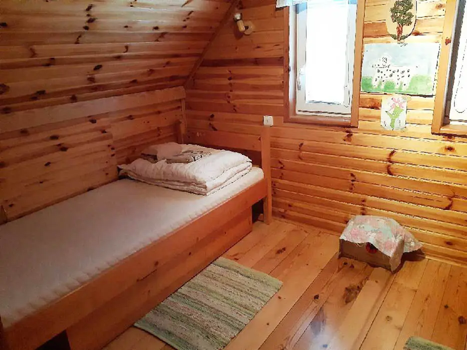 Obytná část spojená s kuchyňkou - rozkládací sedačka ( 1 přistýlka ), krb, TV, jídelní stůl a židle, vybavení kuchyně - varná konvice, nádobí, lednice. V patře 2 ložnice - 1x2, 1x3 lůžka ( zde je menší postel pro děti do 10 let ). Sociální zařízení - koupelna se sprchovým koutem, WC, pračka. Topení - krb, el.přímotop. PITNÁ VODA NENÍ, POUZE UŽITKOVÁ !