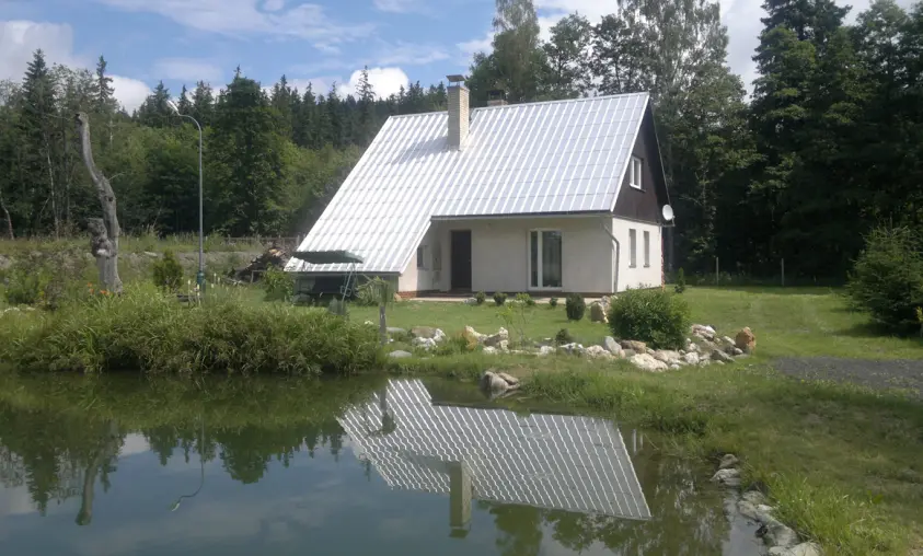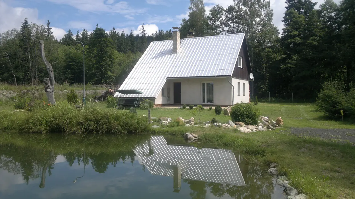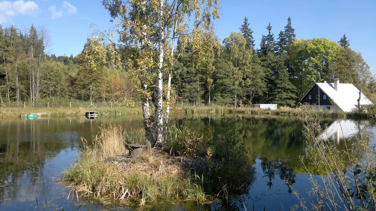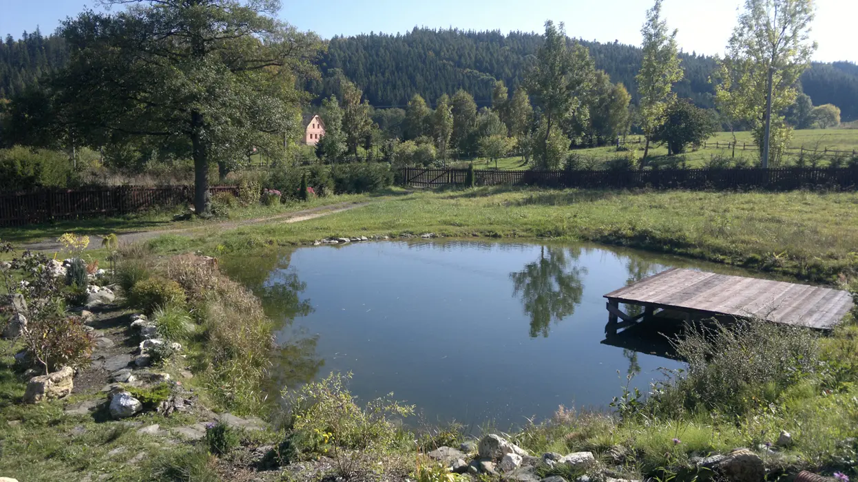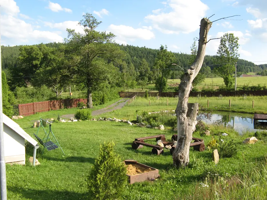 Výhled na vodní plochu s čistou vodou z prameniště, ohniště s posezením, zahradní nábytek, gril,slunečník, zahradní houpačka, volejbalová síť, velký basketbalový koš, malé fotbalové branky, pískoviště, k objektu patři 2 rybníky s ostrůvkem a čistou vodou - vhodné ke koupání, projížďkám po vodě s pramicí, na pozemku je horský potok