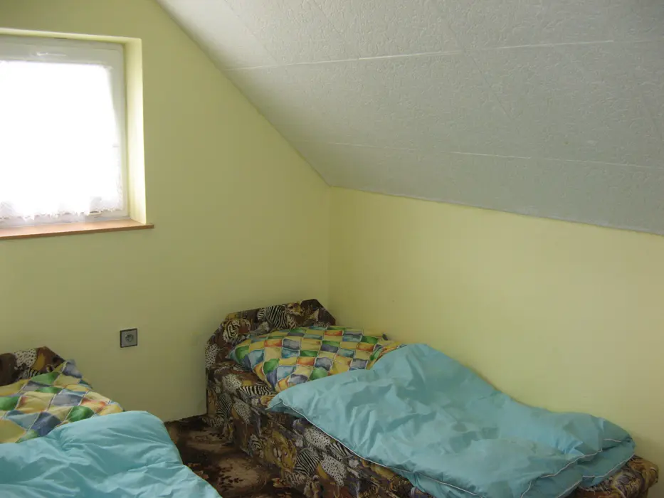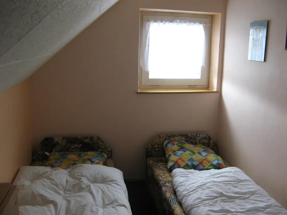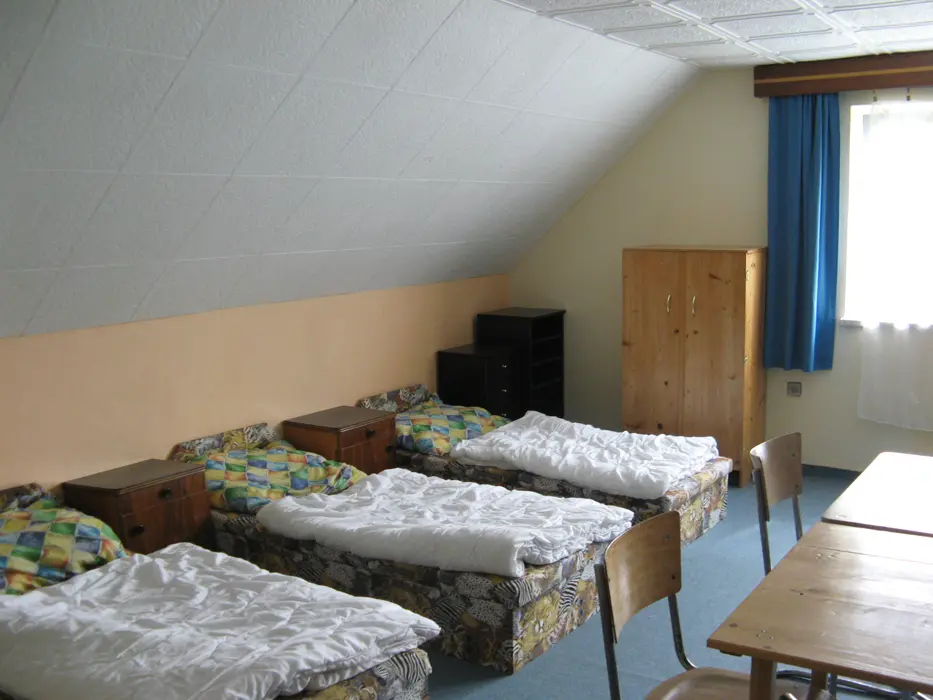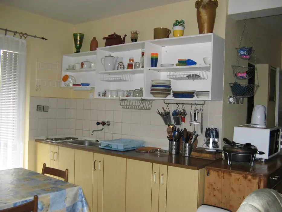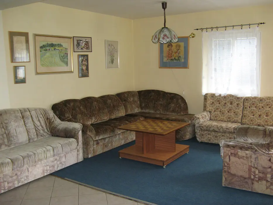 V přízemí - společenská místnost s posezením u krbu, TV, SAT. Kuchyně - el. sklokeramický dvoukolový vařič, mikrovlnná trouba, pečící trouba, remoska, varná konvice, lednice s mrazákem. V patře 3 ložnice - 2x2, 1x4 lůžka. Sociální zařízení - koupelna s vanou, samostatné WC. Topení - výkonná kamna nebo elektrické přímotopy ve všech místnostech