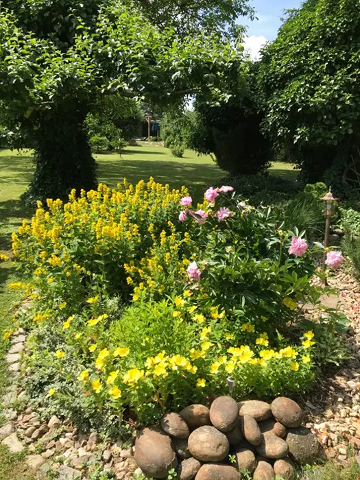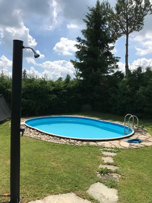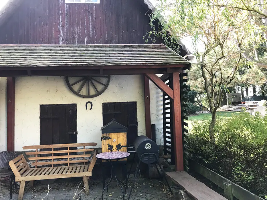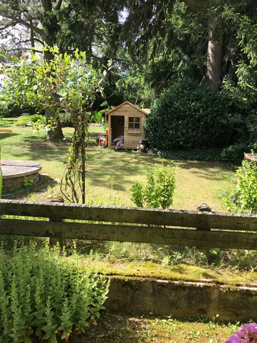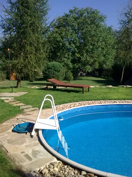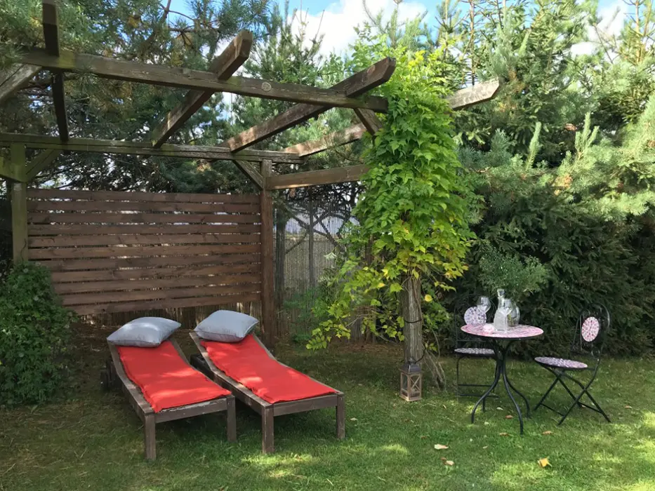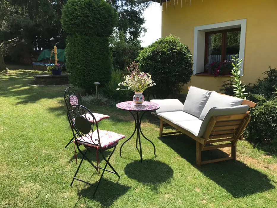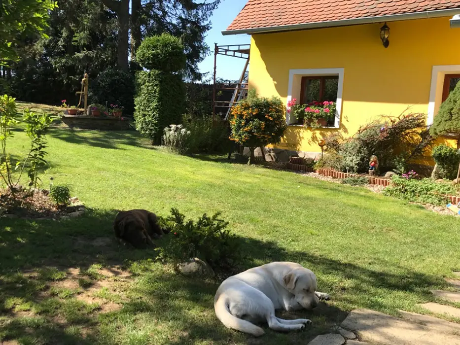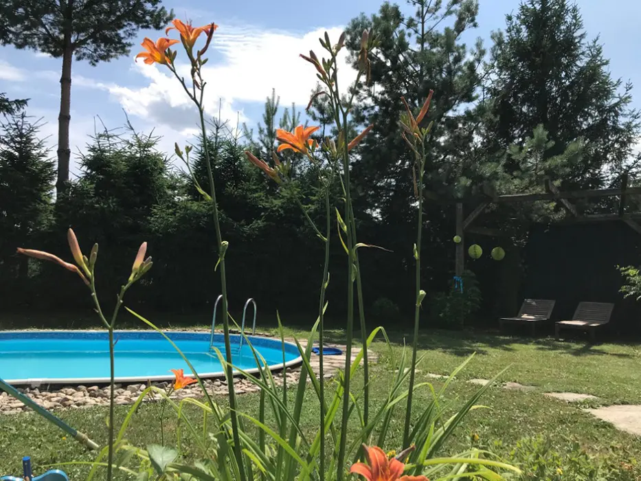 Na veliké oplocené zahradě - 2x posezení - pod slunečníkem a pod krytou pergolou - zahradní nábytek, gril, koutek pro děti - domeček, pískoviště, velký zapuštěný bazén - cca 3 x 6 x 1,2 m, lehátka, solární sprcha