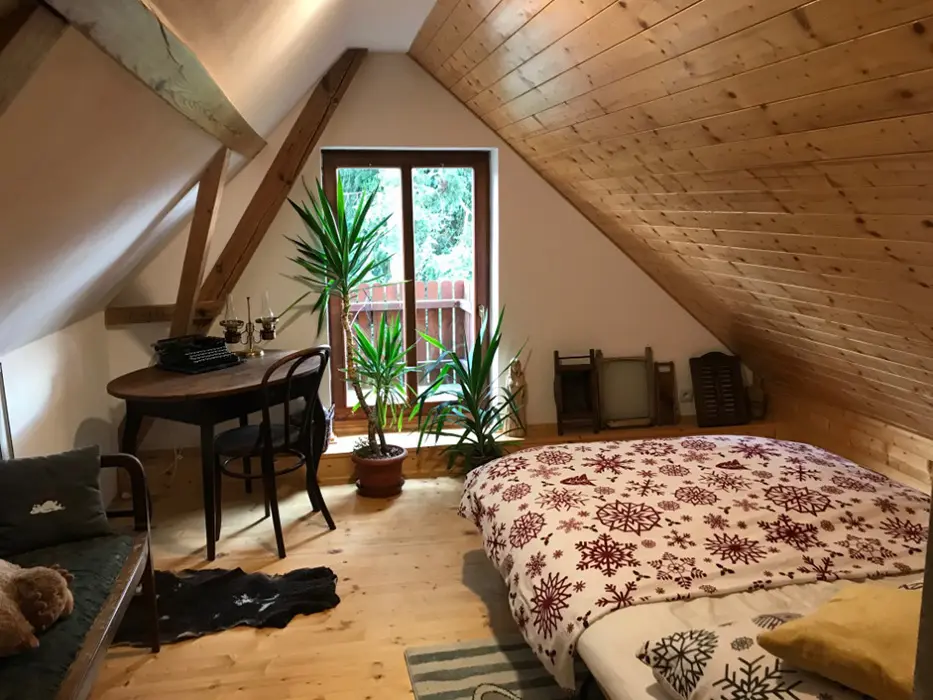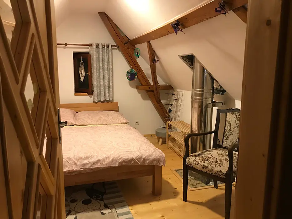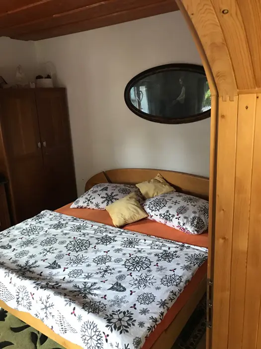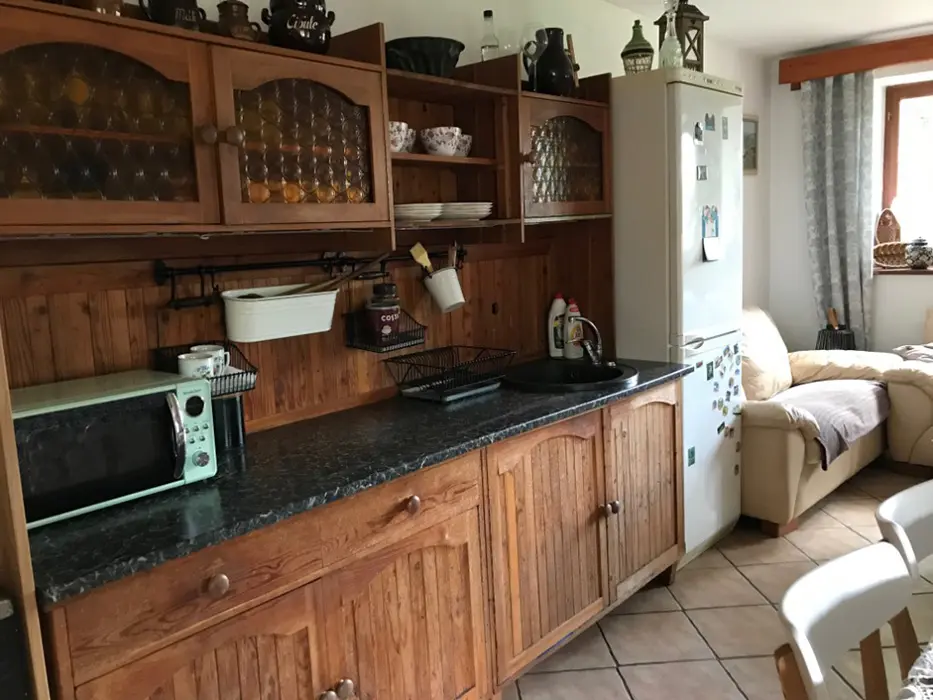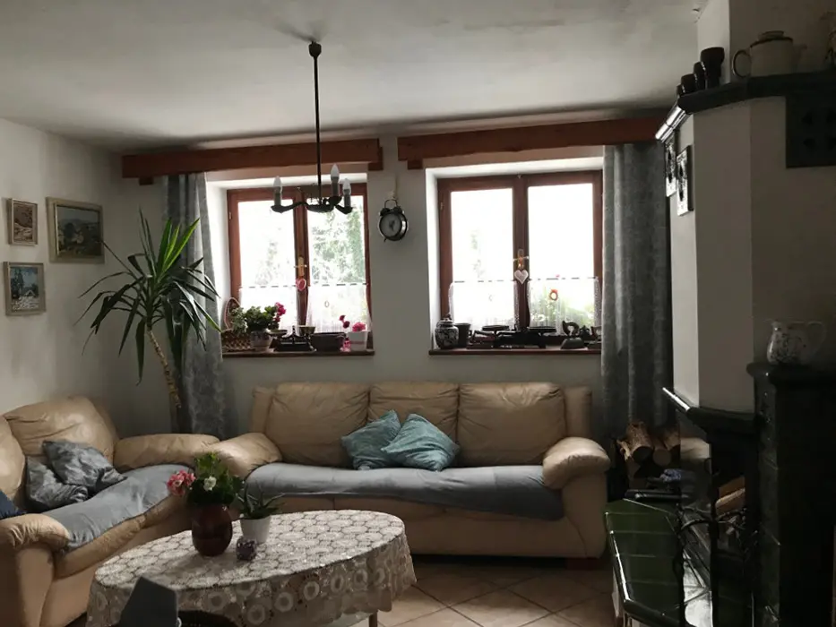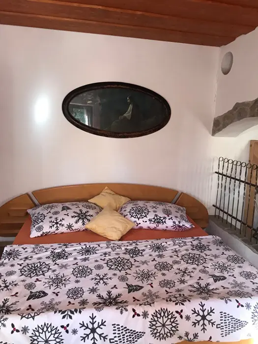 V přízemí - vstupní chodba, kuchyně spojená s posezením - velká rohová sedačka, krbová kamna, LCDTV, jídelní stůl a židle, vybavení kuchyně - varná deska, velký pečící hrnec - 4l remoska, lednice, mikrovlnka, varná konvice, nádobí. 3 ložnice - v přízemí - 1x2, v patře - vedou pohodlné schody - uzavřená 1x2 lůžka, další 2 lůžka ( 140x200 cm ) - v otevřeném prostoru - odděleno paravánem. Soc. zařízení - koupelna se sprchou, umyvadlo, WC v koupelně. Topení - krbová kamna. V objektu je klimatizace.
