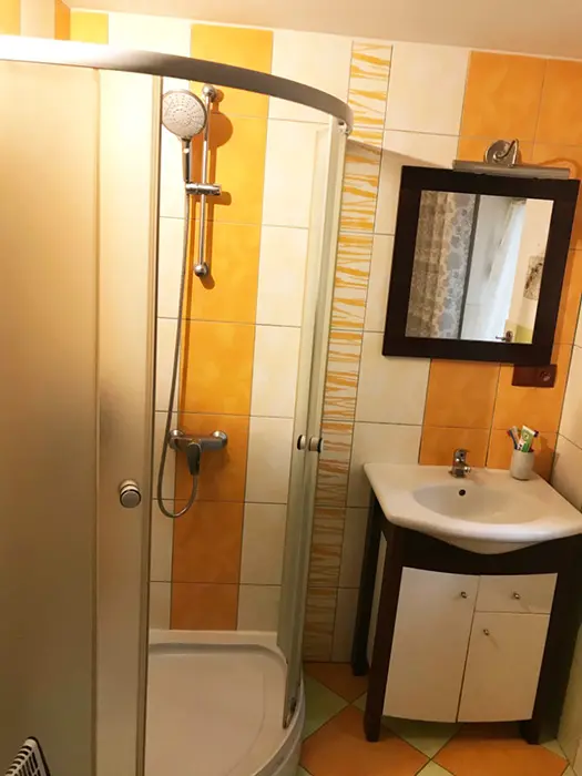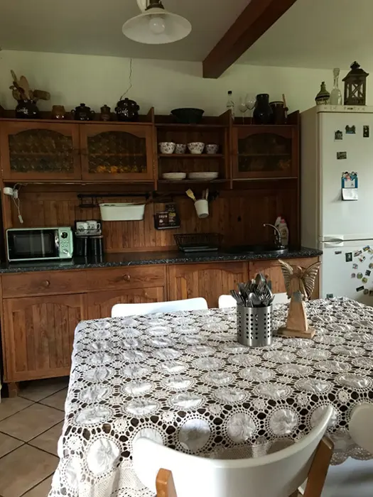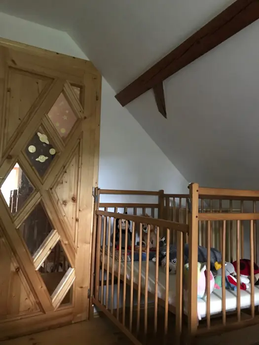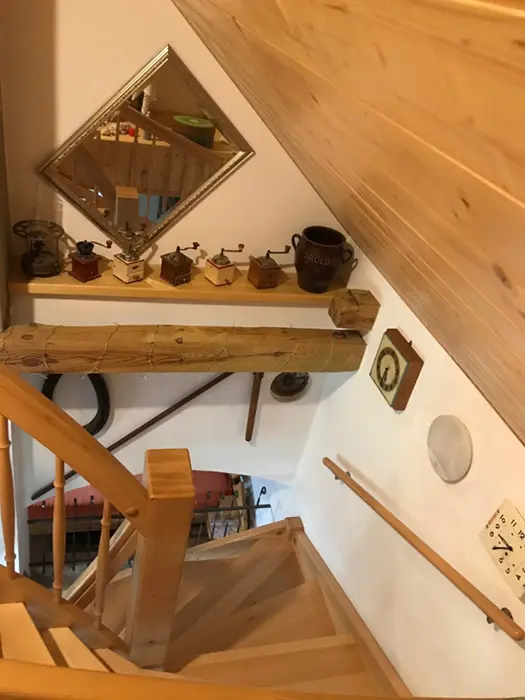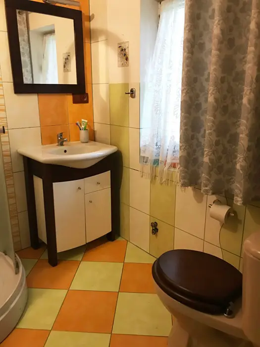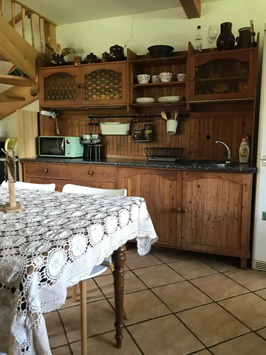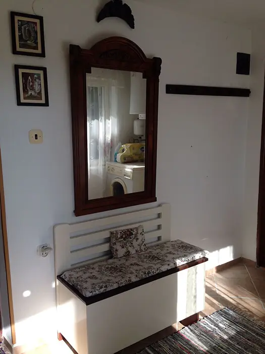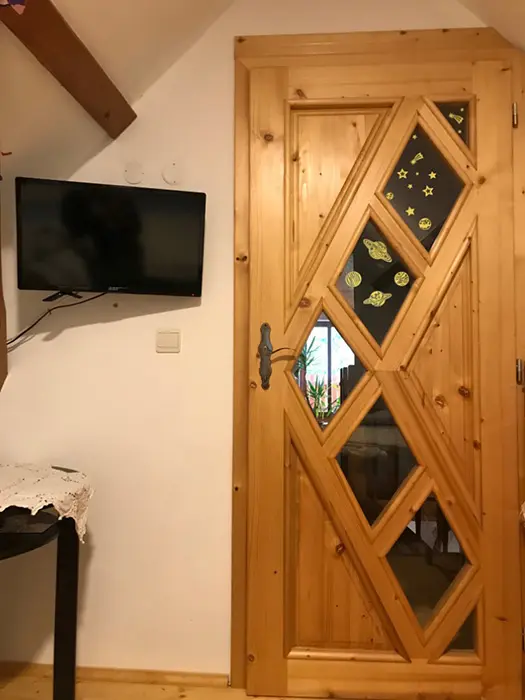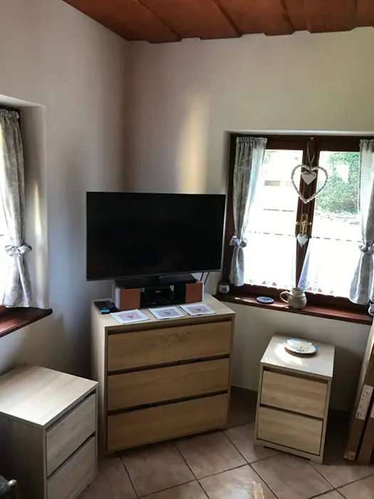 V přízemí - vstupní chodba, kuchyně spojená s posezením - velká rohová sedačka, krbová kamna, LCDTV, jídelní stůl a židle, vybavení kuchyně - varná deska, velký pečící hrnec - 4l remoska, lednice, mikrovlnka, varná konvice, nádobí. 3 ložnice - v přízemí - 1x2, v patře - vedou pohodlné schody - uzavřená 1x2 lůžka, další 2 lůžka ( 140x200 cm ) - v otevřeném prostoru - odděleno paravánem. Soc. zařízení - koupelna se sprchou, umyvadlo, WC v koupelně. Topení - krbová kamna. V objektu je klimatizace.