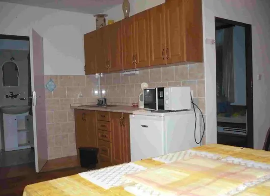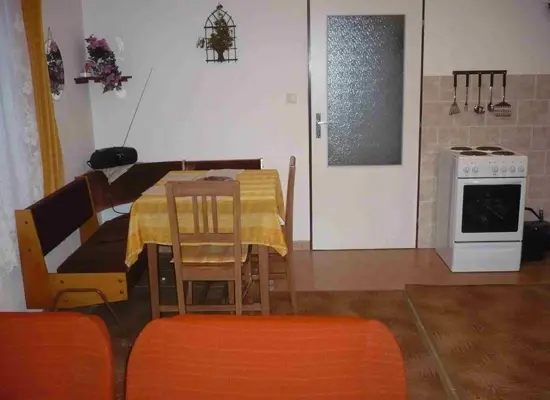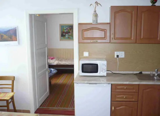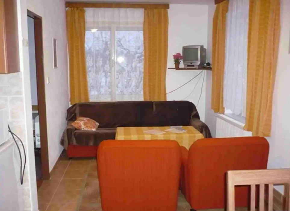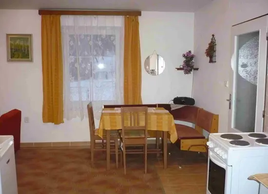 Chalupa je rozdělená na 2 shodné části - v každé obývací pokoj spojený s kuchyní - stůl a židle, BTV, sedací souprava - možnost 2 přistýlek, el. sporák, lednice, varná konvice, mikrovlnka, nádobí. 2 ložnice 2x4 lůžka. Koupelna se sprchou + WC. Topení el. přímotop + tuhá paliva