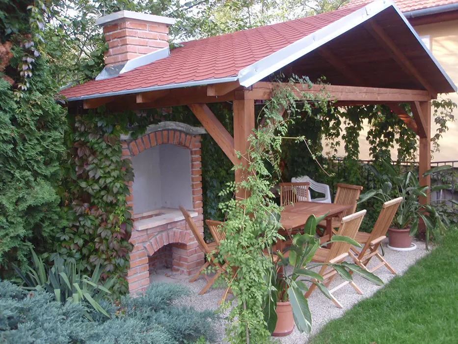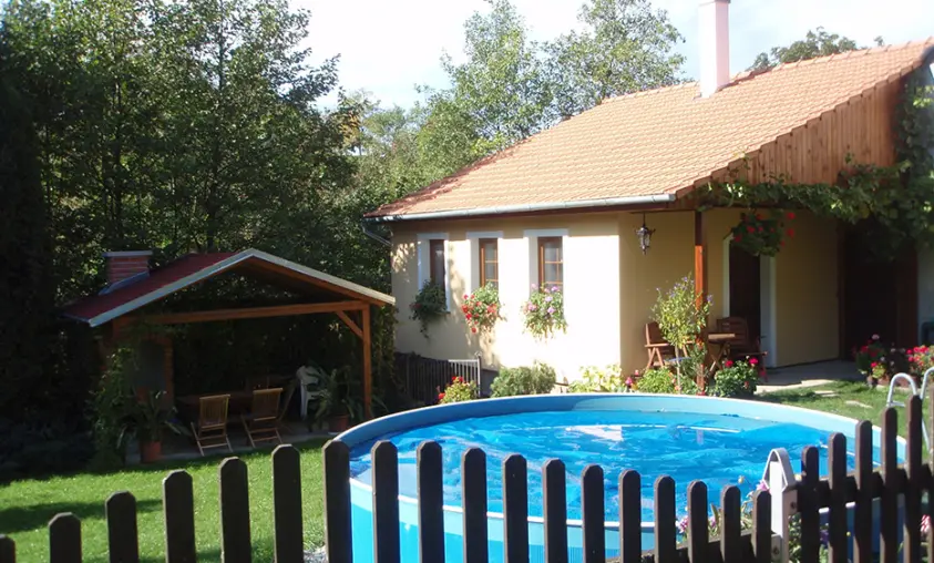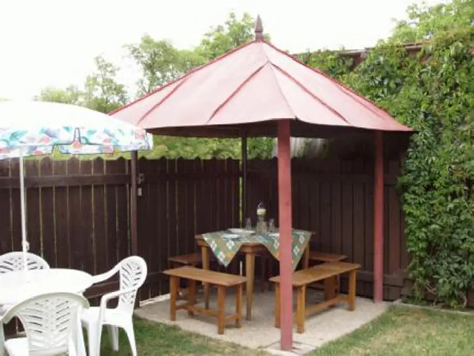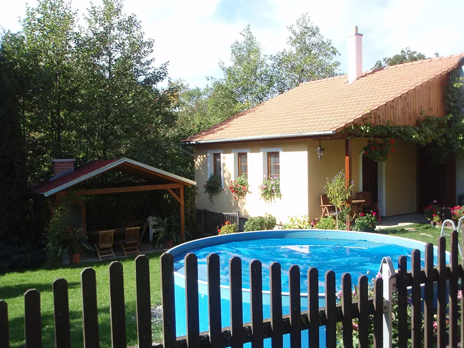 Posezení na uzavřeném dvorku - viz foto č. 4, v osvětleném zastřešeném altánu, zahradní krb, k dispozici je přenosný gril, nadzemní bazén