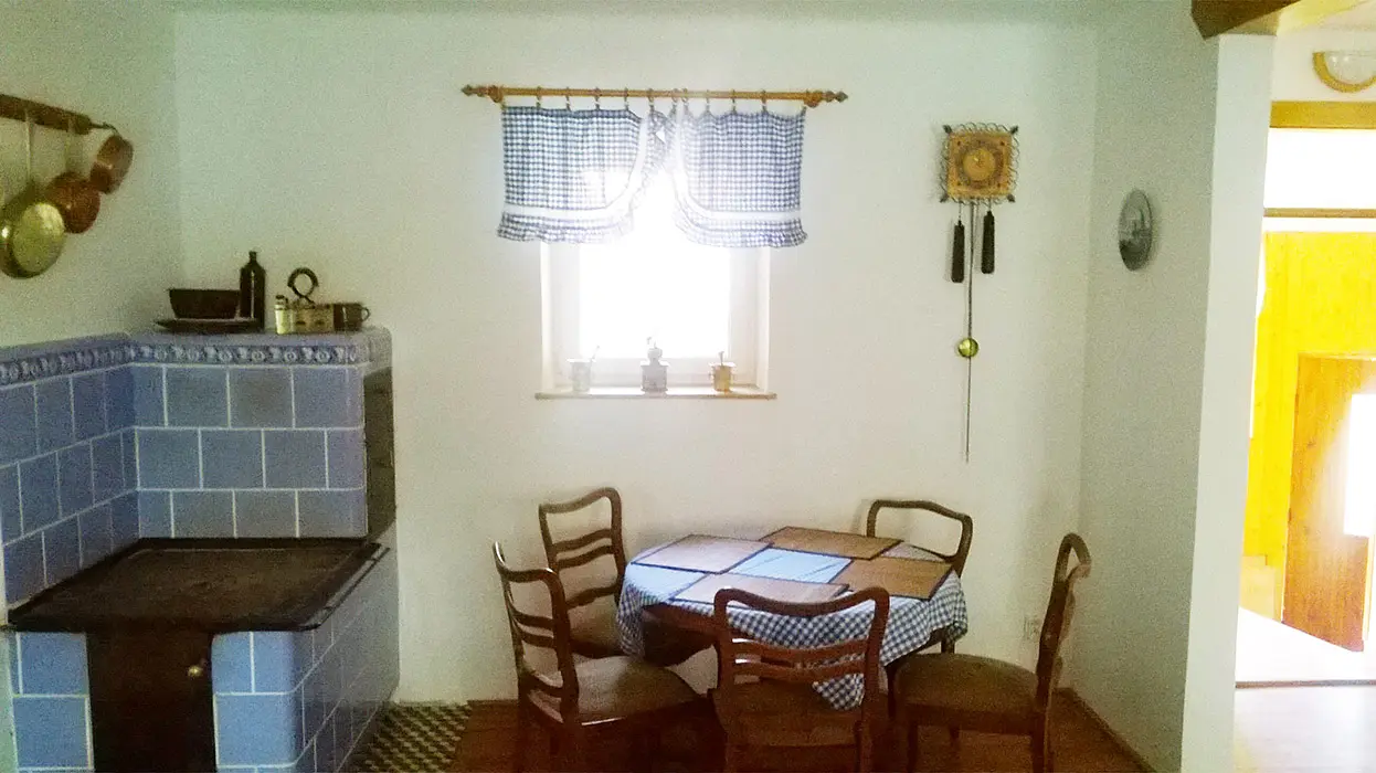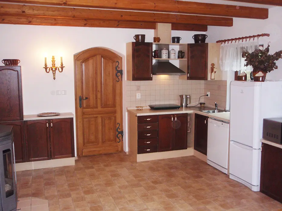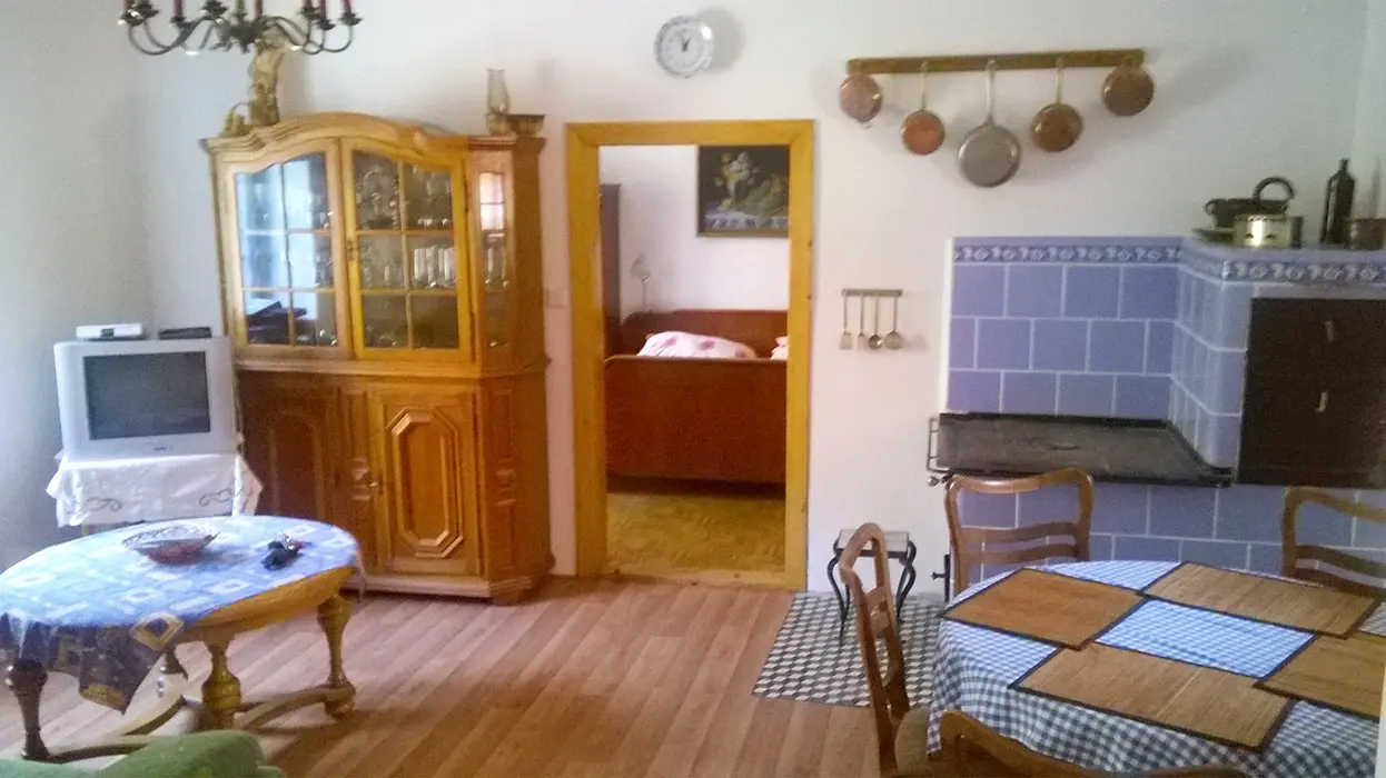 Obytná kuchyně s kachlovou pecí, TV, sedačka, jídelní stůl a židle, vybavení kuchyně - lednice s mrazákem, dvouplotýnkový vařič, varná konvice, mikrovlnná trouba a základní nádobí. 1 ložnice 1x4 - manželská postel + rozkládací dvoulůžko. Soc. zařízení - sprchový kout, samostatné WC. Topení na tuhá paliva kachlovými kamny - VIZ FOTO Č. 5-11