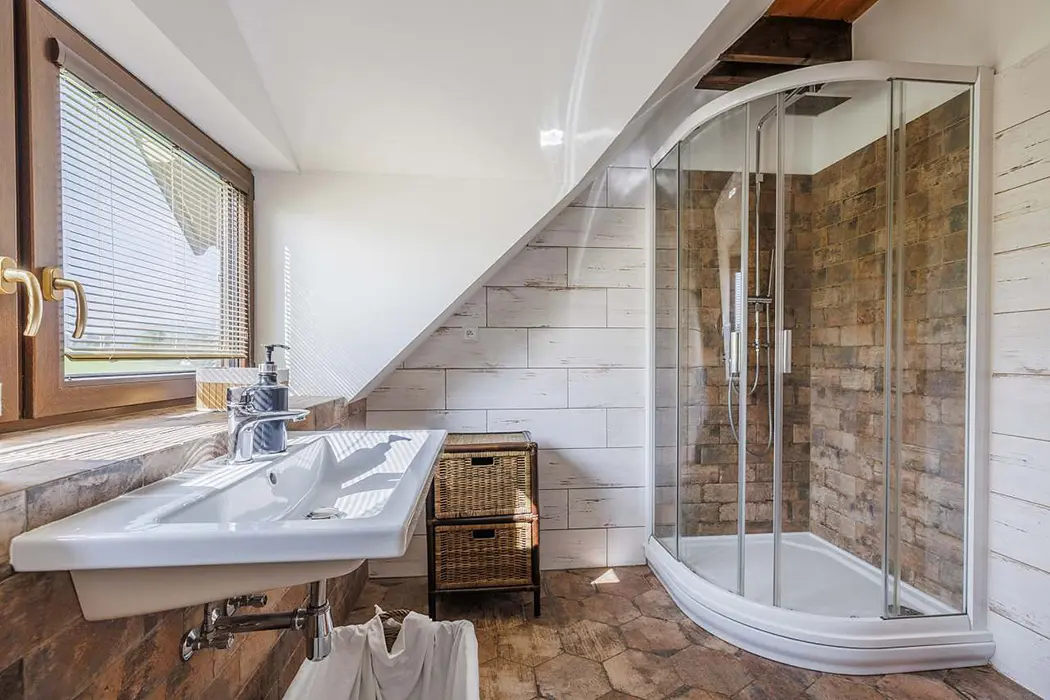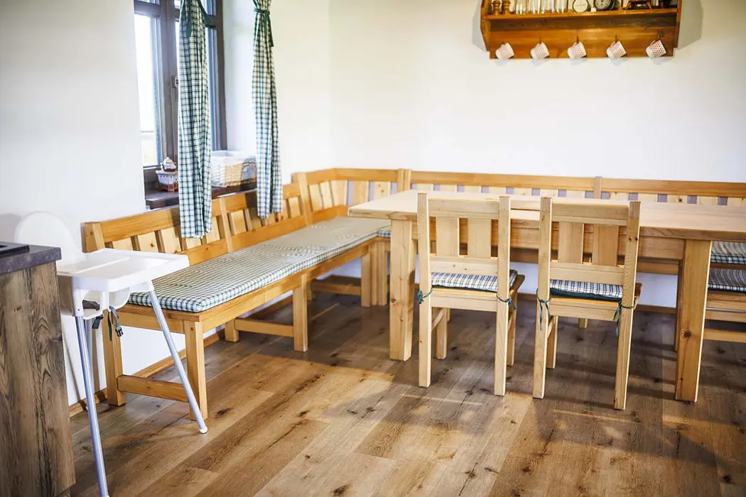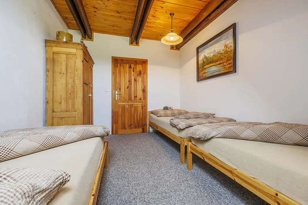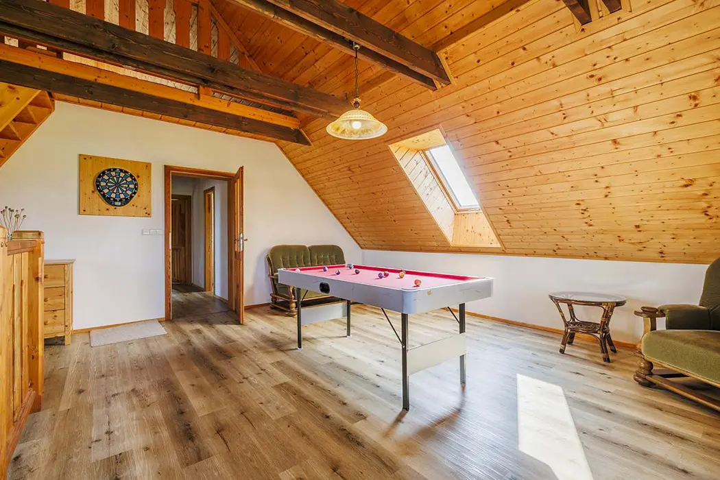 Společenská místnost je propojená s kuchyní, je s posezením a LED TV a vstupem na venkovní terasu přes francouzské dveře. Kuchyně je plně vybavená nádobím, lednice, mikrovlnka, myčka, el. trouba, sklokeramická varná deska, kávovar a rohová lavice. pro 12 osob. V patře je k dispozici herna (kulečník, šipky, odpočinková zóna). 5 ložnic: v přízemí 1x3 lůžka, v patře 1x3 lůžka + 2x2 lůžka. V podkroví ve špici 2 lůžka - viz foto. K dispozici dětská postýlka. 2x koupelny: v přízemí je koupelna se 2 sprchami + samostatné WC, v patře sprchový kout, umyvadlo, WC. Topení centrální, v přízemí a koupelnách je podlahové vytápění elektrickým kotlem, v patře jsou radiátory
