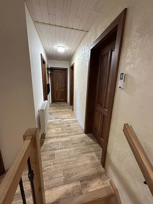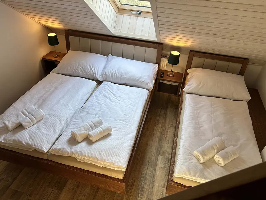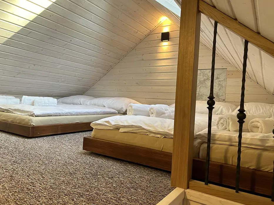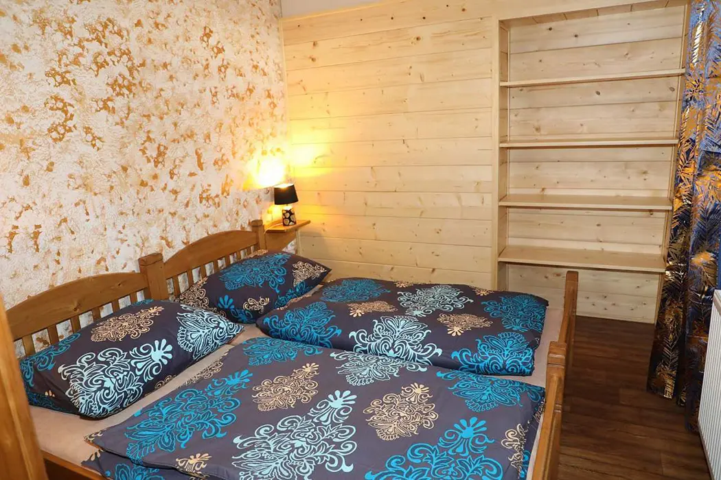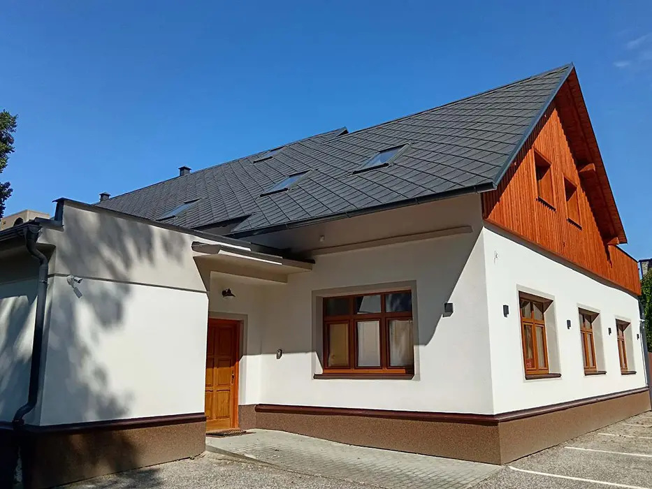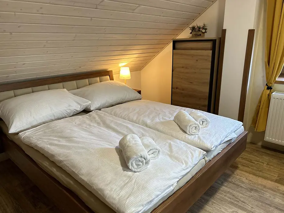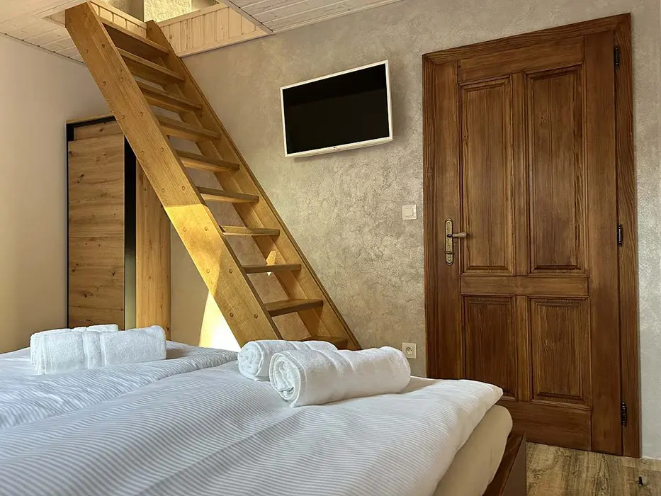 V přízemí - vstupní chodba, 1 ložnice - 1x2 lůžka, prostorný obývací pokoj (2 lůžka + rozkládací pohovka - 1-2 lůžka), vybavená kuchyně + další kuchyňka v jednom pokoji v podkroví, soc. zařízení - koupelna, WC. V patře - 5 ložnic - 1x4, 2x2 , 1x3 + 1x4 ( tato lůžka jsou v dalším patře - přístup po prudších schodech ). Soc. zařízení - 2 koupelny, sprchy, 2 x WC. Topení - tepelné čerpadlo, teplota je řízena pokojovými termostaty