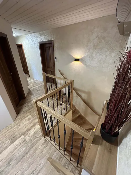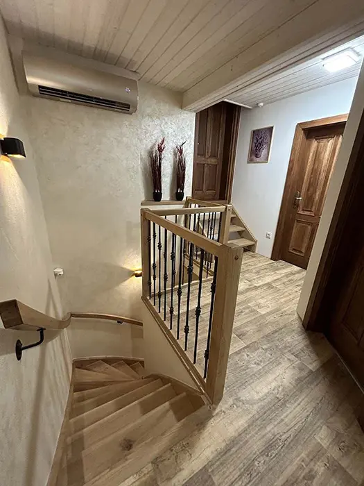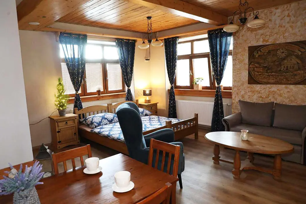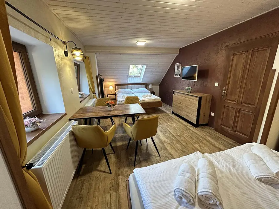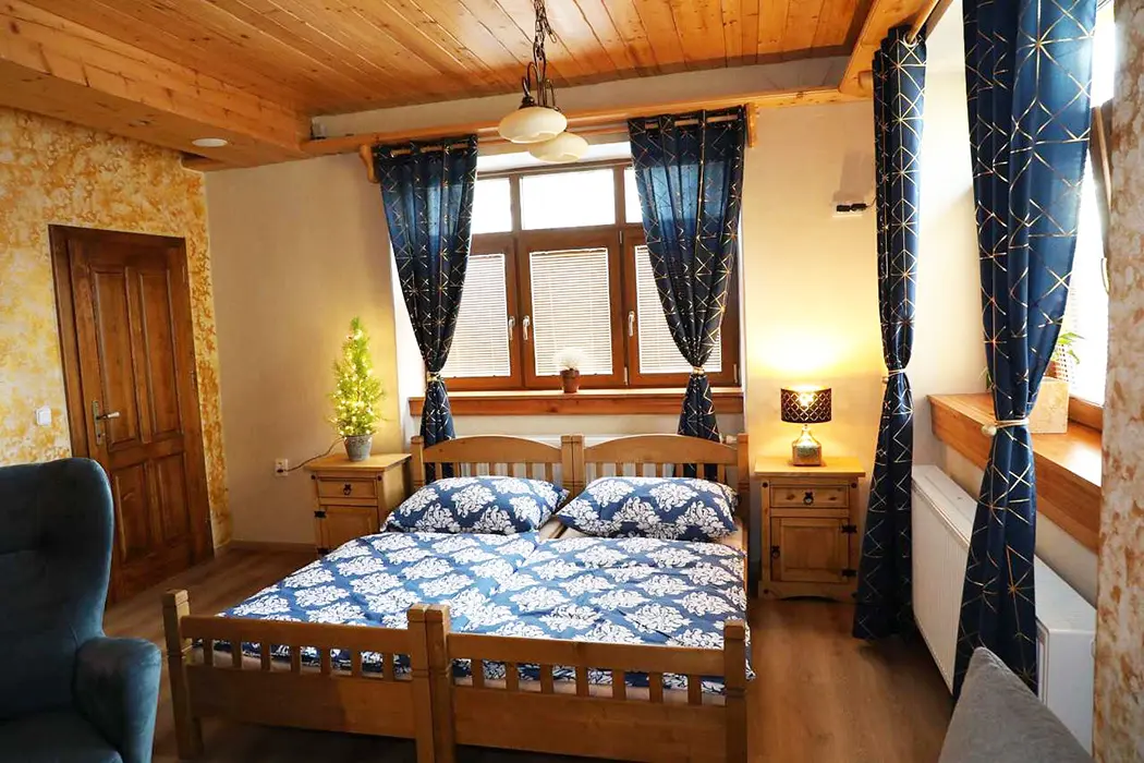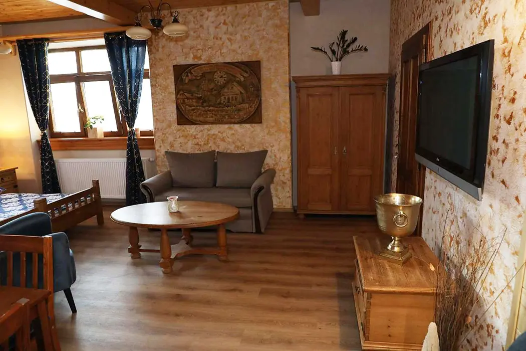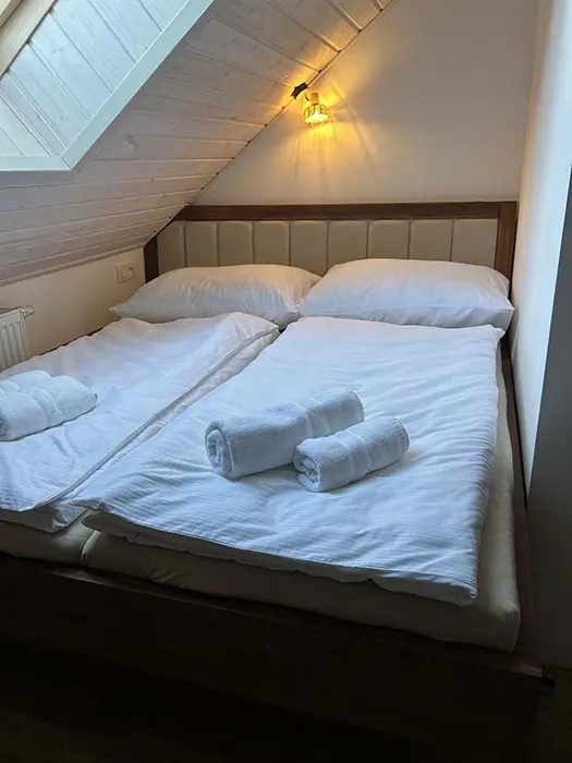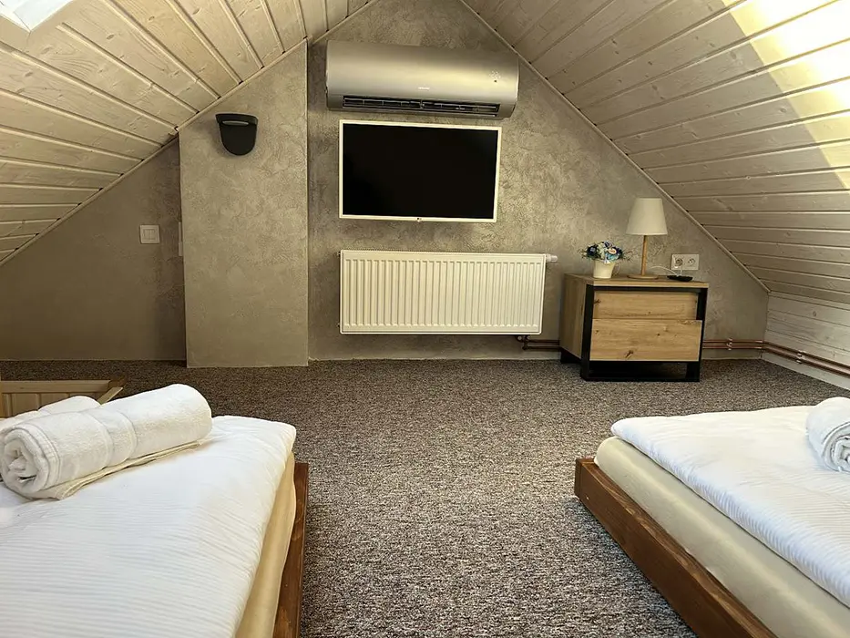V přízemí - vstupní chodba, 1 ložnice - 1x2 lůžka, prostorný obývací pokoj (2 lůžka + rozkládací pohovka - 1-2 lůžka), vybavená kuchyně + další kuchyňka v jednom pokoji v podkroví, soc. zařízení - koupelna, WC. V patře - 5 ložnic - 1x4, 2x2 , 1x3 + 1x4 ( tato lůžka jsou v dalším patře - přístup po prudších schodech ). Soc. zařízení - 2 koupelny, sprchy, 2 x WC. Topení - tepelné čerpadlo, teplota je řízena pokojovými termostaty