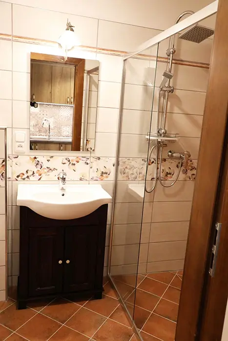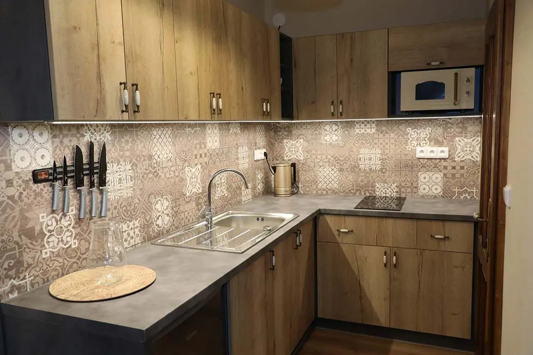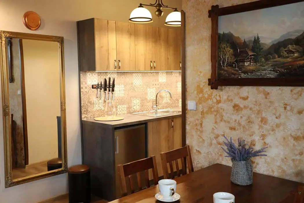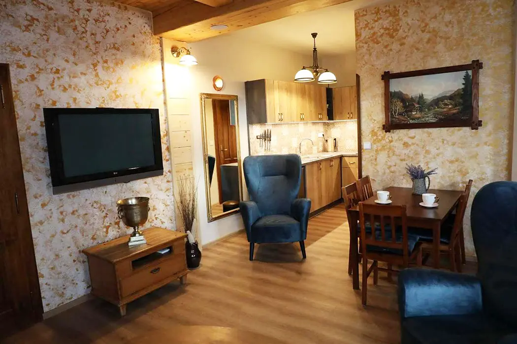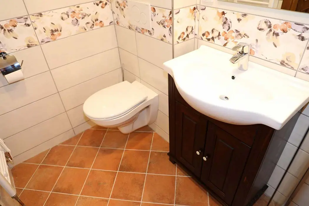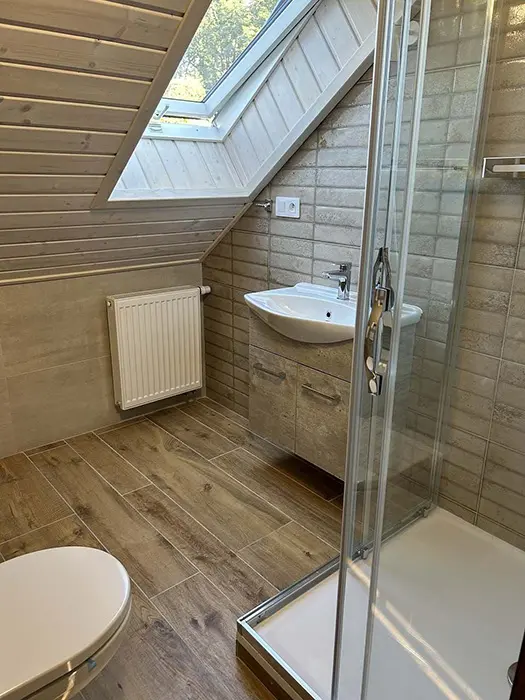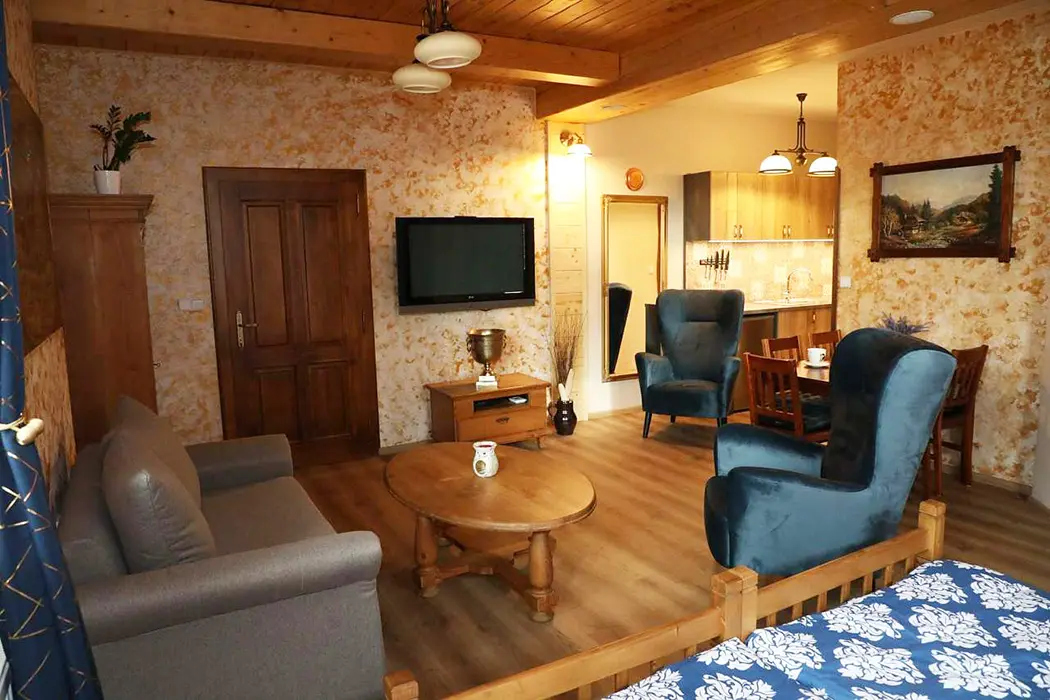 V přízemí - vstupní chodba, 1 ložnice - 1x2 lůžka, prostorný obývací pokoj (2 lůžka + rozkládací pohovka - 1-2 lůžka), vybavená kuchyně + další kuchyňka v jednom pokoji v podkroví, soc. zařízení - koupelna, WC. V patře - 5 ložnic - 1x4, 2x2 , 1x3 + 1x4 ( tato lůžka jsou v dalším patře - přístup po prudších schodech ). Soc. zařízení - 2 koupelny, sprchy, 2 x WC. Topení - tepelné čerpadlo, teplota je řízena pokojovými termostaty