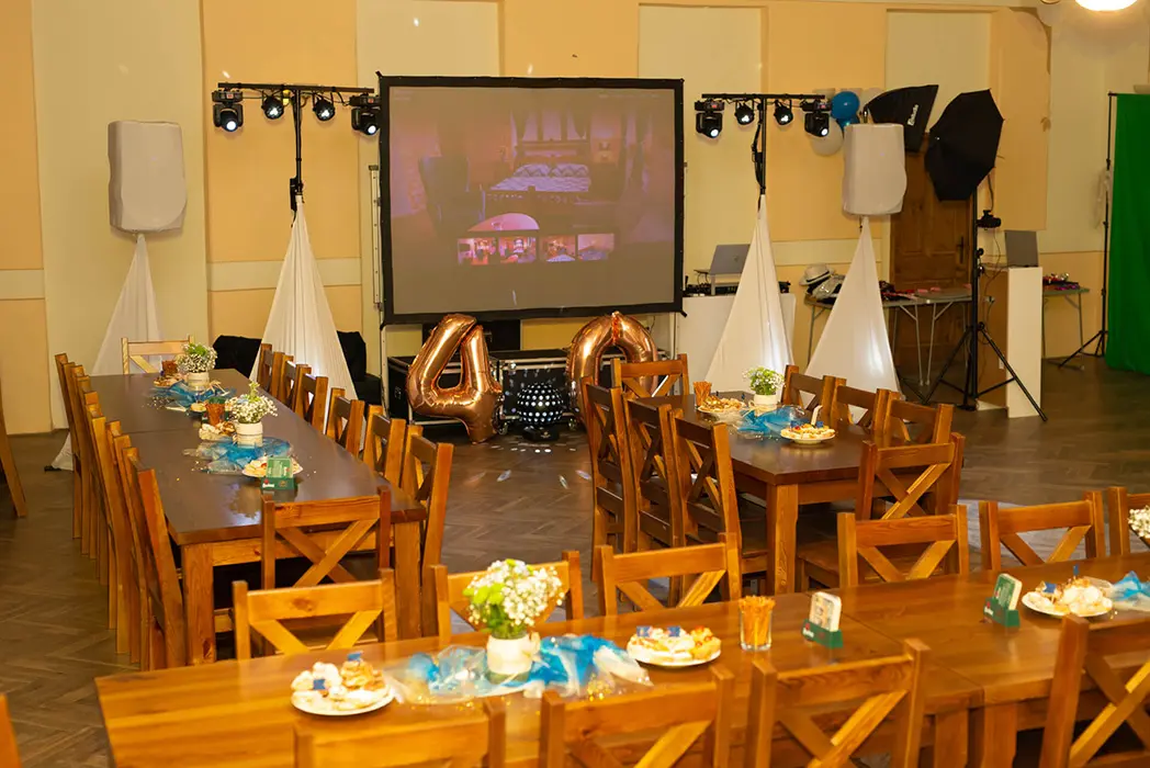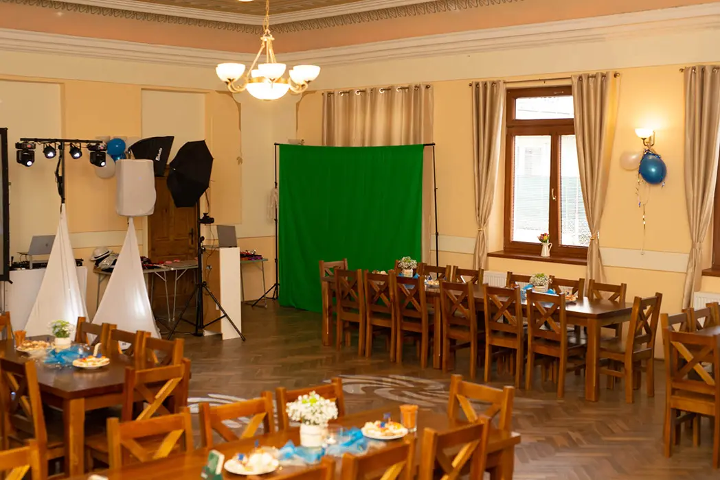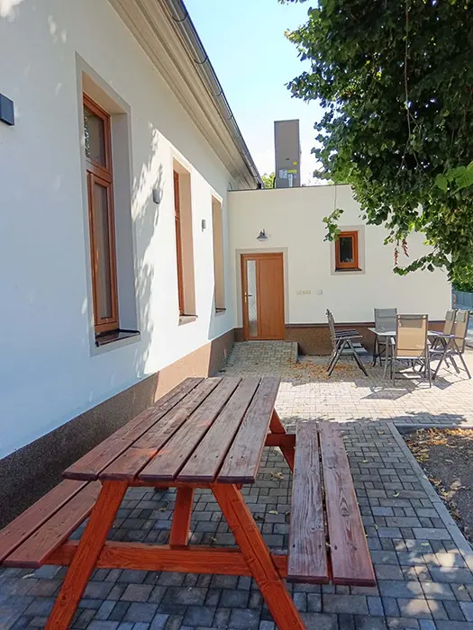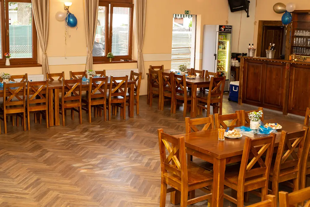 V přízemí - sál o kapacitě 80 míst - pro oslavy, svatby, soukromé i firemní akce, večírky, školení, srazy, s možností tance (parkety cca 120m2), s navazujícím menším přísálím, vhodným pro catering a hudbu, vybavený výčep, kuchyně - součástí sálu je bar s výčepním pultem (2 mosazné hlavy Pilsner Urquell, 3 kohouty nostalgie), dřez, odkap, ostřik a myčka skla, kávovar, varná konvice, velká prosklená lednice na nápoje, kompletní sklo na pivo, víno, sekt, likéry, kávu, nealko. Toalety k sálu - 1x WC dámy, 1x WC + 3x pisoár pro pány