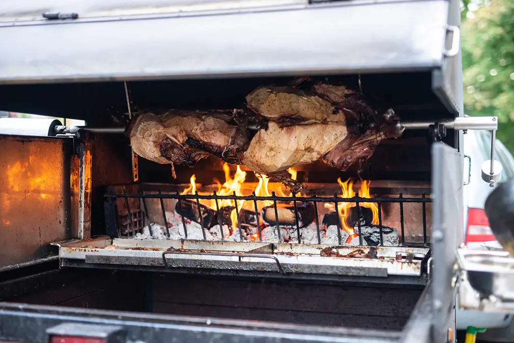 Letní oplocená zahrádka, venkovní posezení, slunečník, gril, ohniště