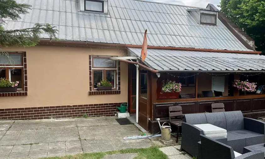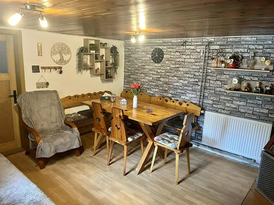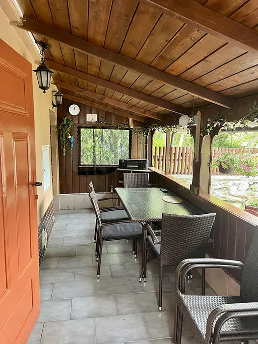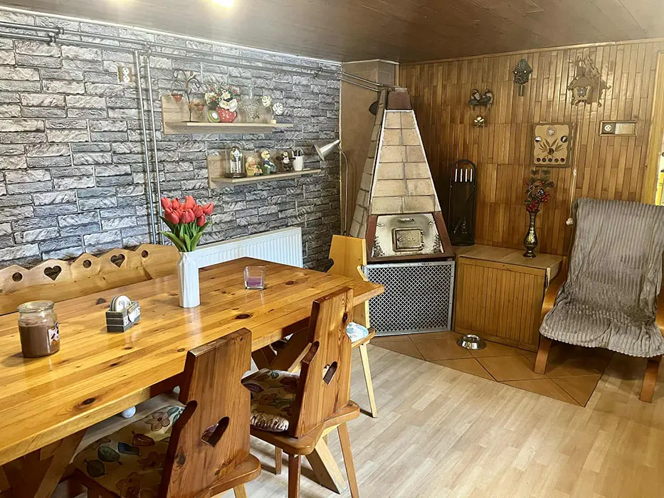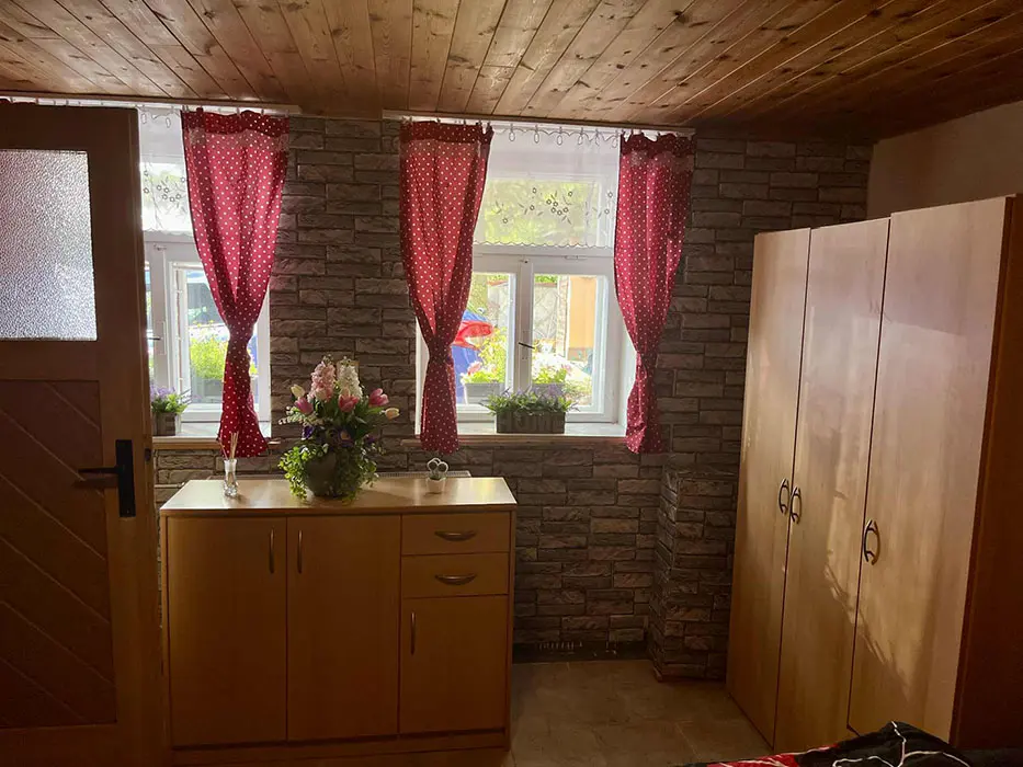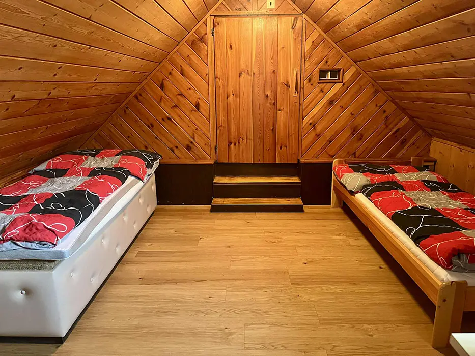 Obývací pokoj spojený s kuchyní - posezení u krbu, TV, rozkládací pohovka - 2 lůžka, jídelní stůl a židle, vybavení kuchyně - pl. sporák s el. troubou, mikrovlnka, lednice s mrazákem, varná konvice, nádobí, toustovač, mixér. 3 ložnice - v přízemí 1x4, v patře 2x4 lůžka. Soc. zařízení - koupelna s vanou, teplá voda, pračka, WC - má přístup z venku. Topení - v krbu na tuhá paliva nebo plynové