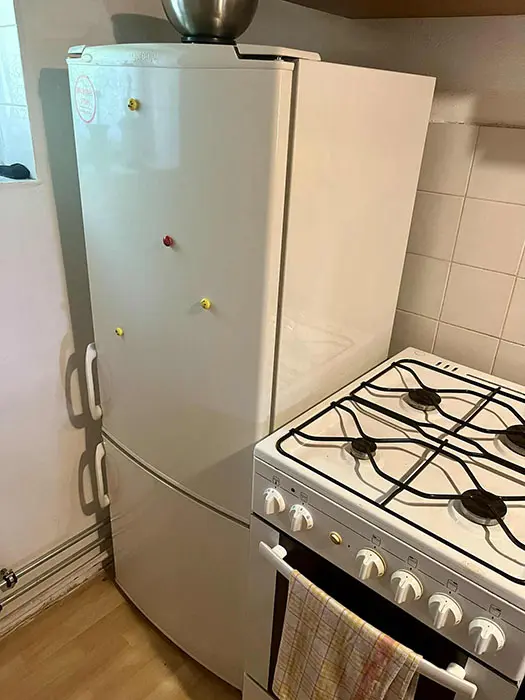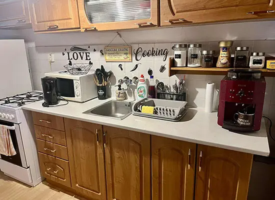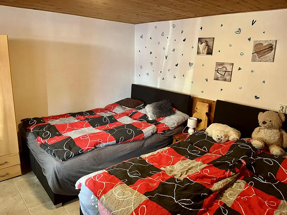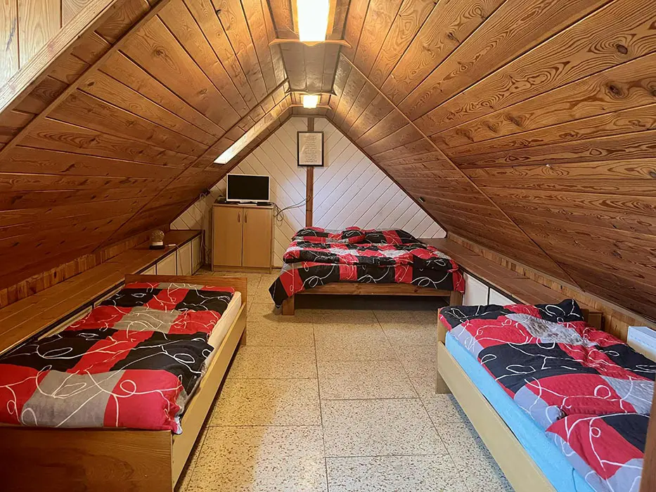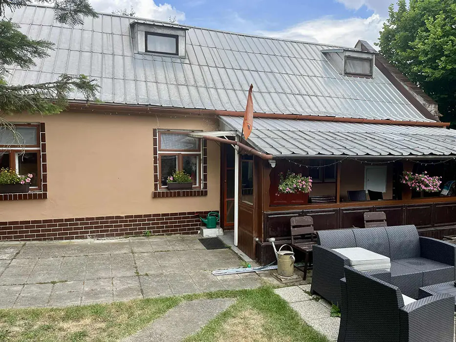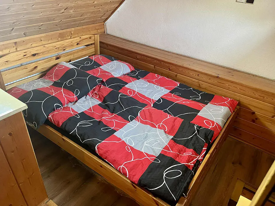 Obývací pokoj spojený s kuchyní - posezení u krbu, TV, rozkládací pohovka - 2 lůžka, jídelní stůl a židle, vybavení kuchyně - pl. sporák s el. troubou, mikrovlnka, lednice s mrazákem, varná konvice, nádobí, toustovač, mixér. 3 ložnice - v přízemí 1x4, v patře 2x4 lůžka. Soc. zařízení - koupelna s vanou, teplá voda, pračka, WC - má přístup z venku. Topení - v krbu na tuhá paliva nebo plynové