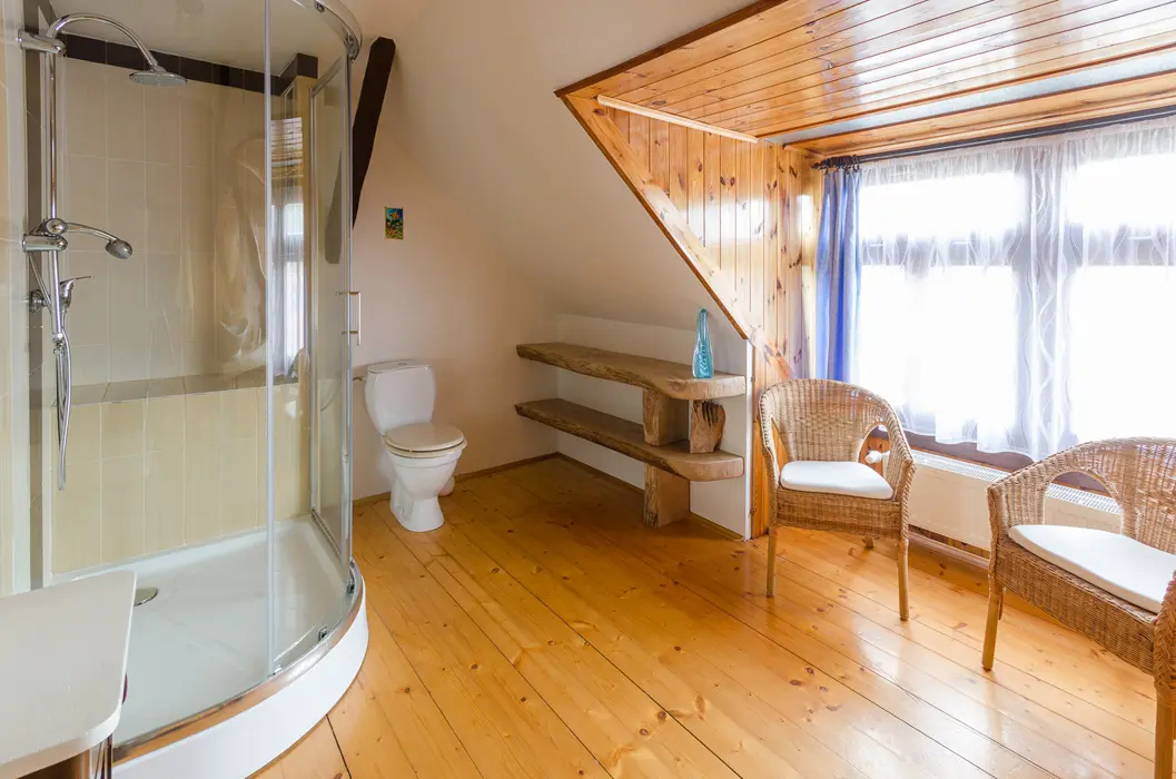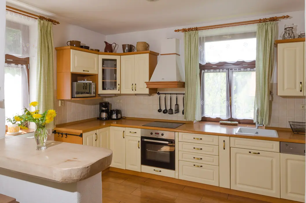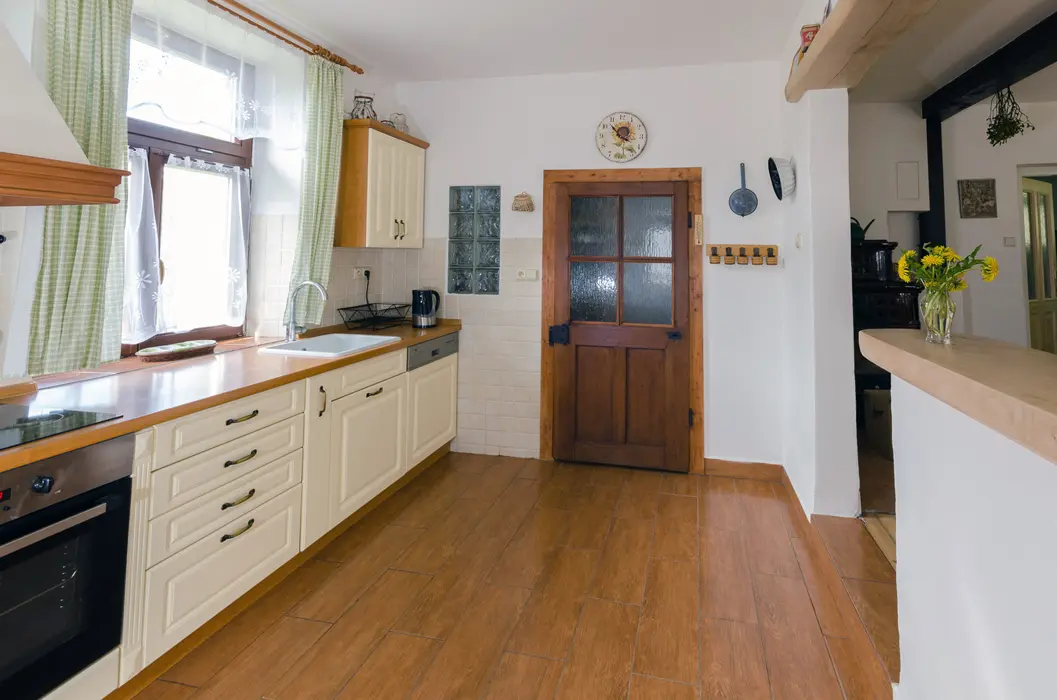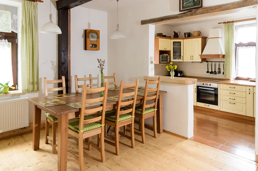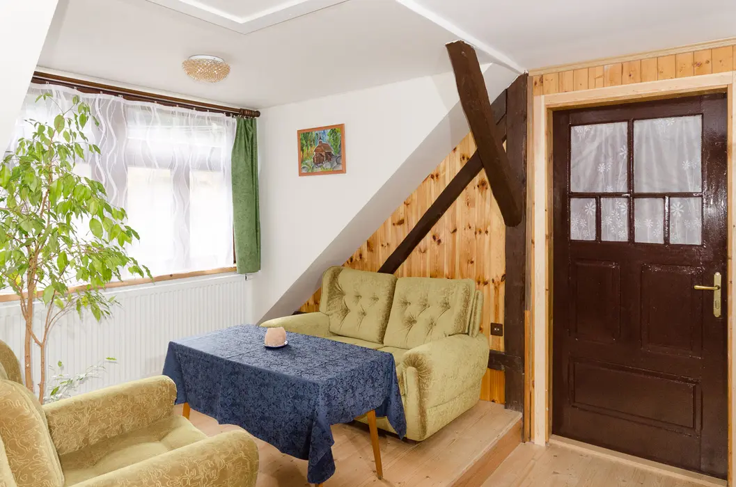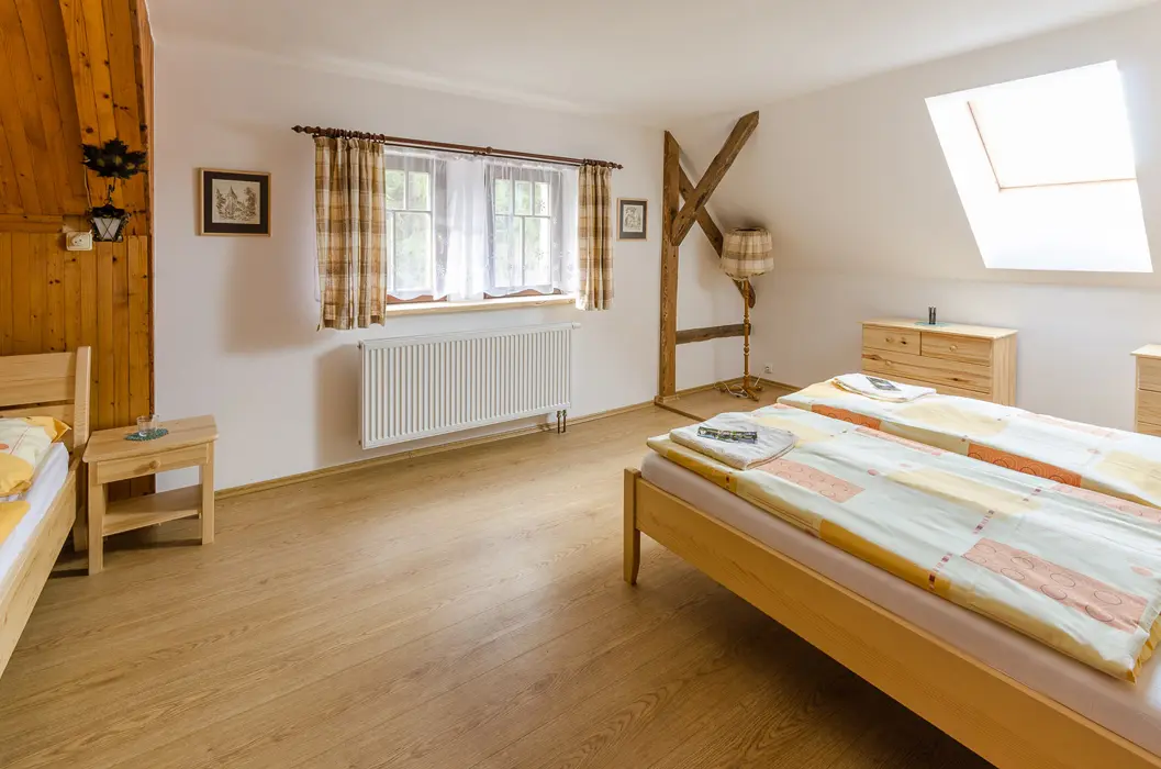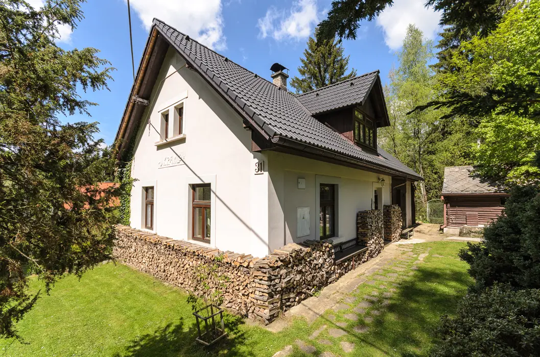 Obývací pokoj s rozkládací soupravou (s možností provizorního přespání dvou osob), TV, jídelní stůl s židlemi, kachlová kamna. Kuchyně - čtyřplotýnkový sporák, trouba, mikrovlnná trouba, lednice s mrazákem, myčka, rychlovarná konvice, kávovar (na překapávanou kávu), topinkovač, základní nádobí (hrnce, hrnečky, skleničky, talíře, příbory. 3 ložnice - v přízemí 1x1, v patře 2x3 lůžka, dětská postýlka. Sociální zařízení - pračka, v přízemí koupelna s WC, v patře sprchový kout, WC. Topení - tuhá paliva.