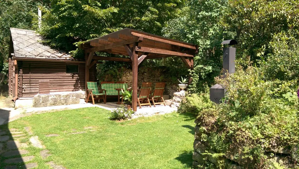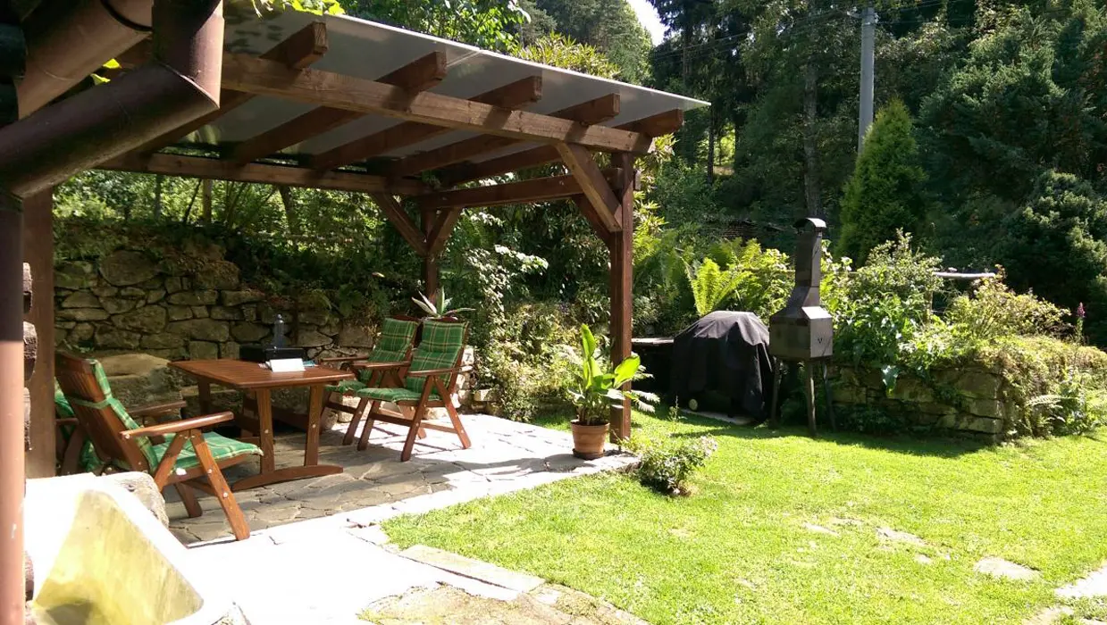 Na prostorné a oplocené zahradě kryté posezení pergola se zahradním nábytkem, plynový gril, klasické ohniště s posezením, malý nafukovací bazének pro děti
