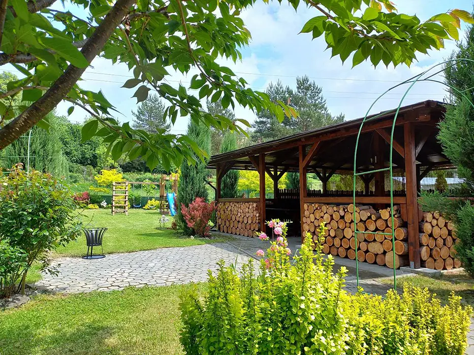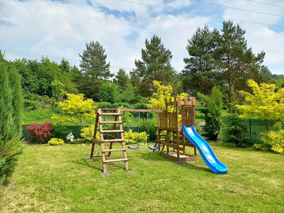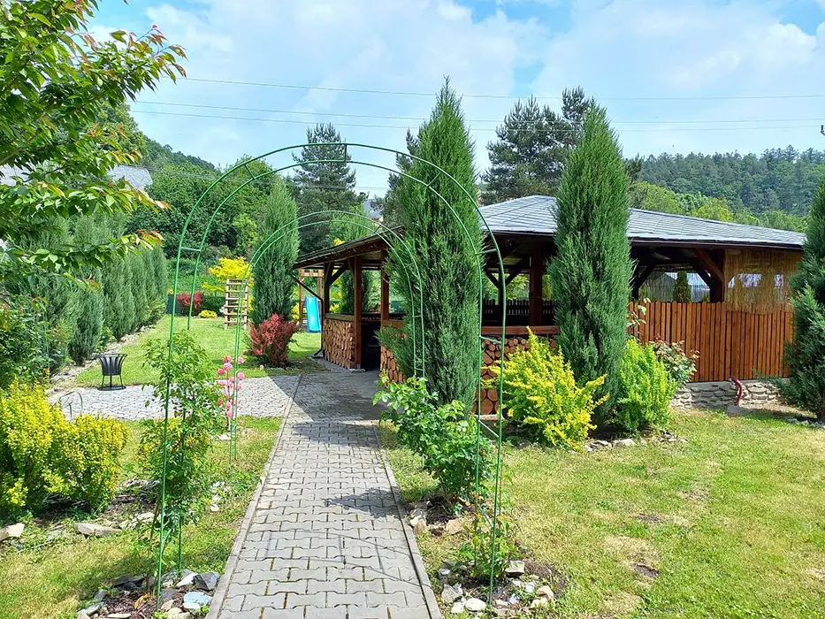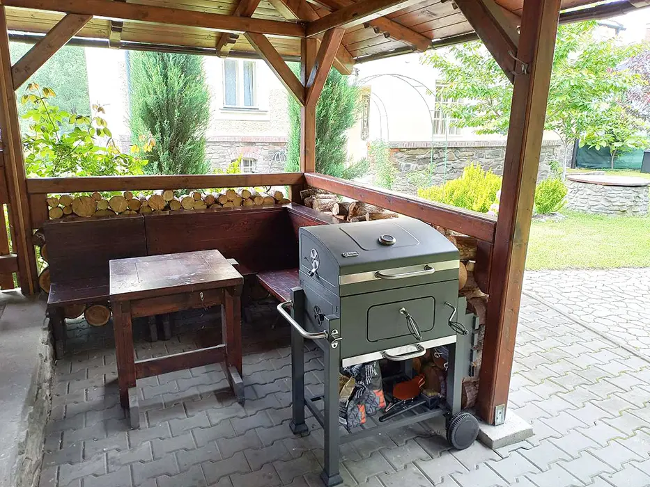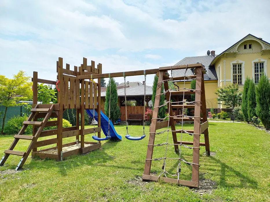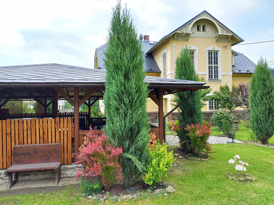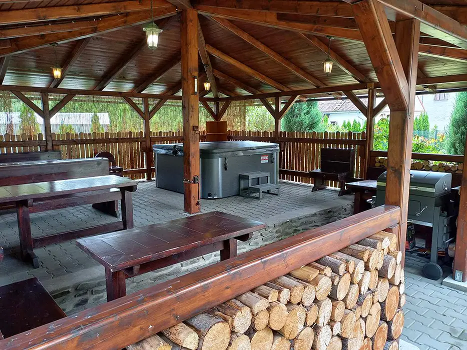 Na oplocené a okrasné zahradě - velké kryté posezení - lavice a stoly, zde je umístěna vířivka, gril, pro děti - prolézačky, skluzavka, houpačky, bazén