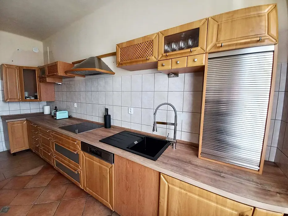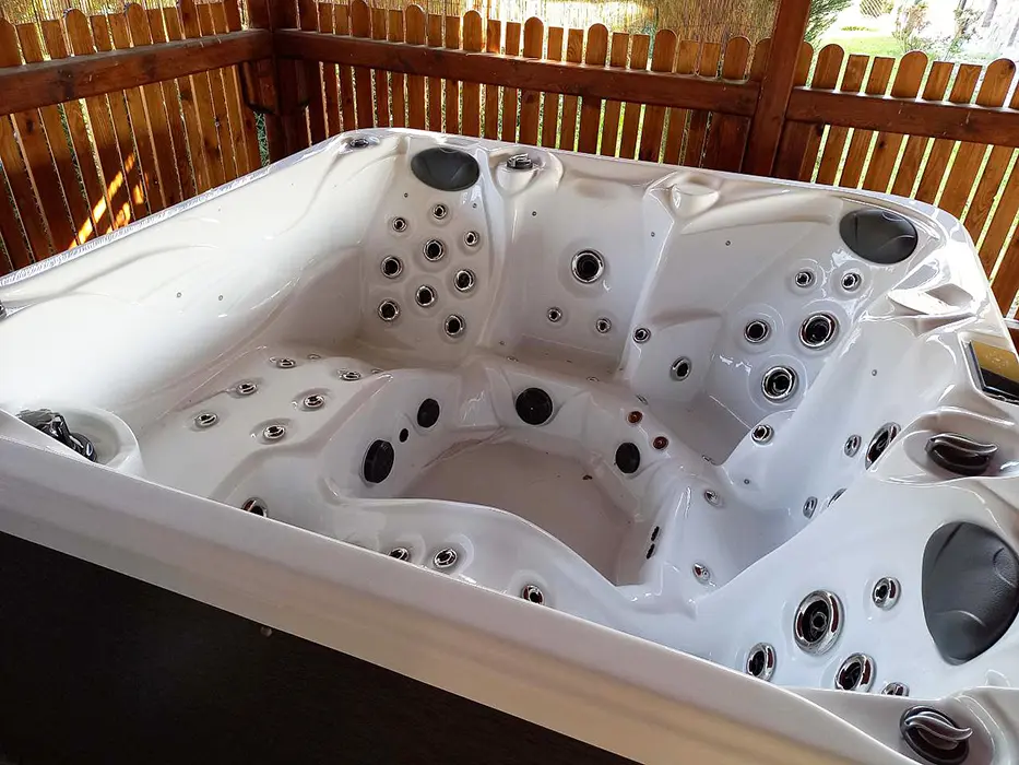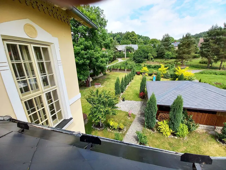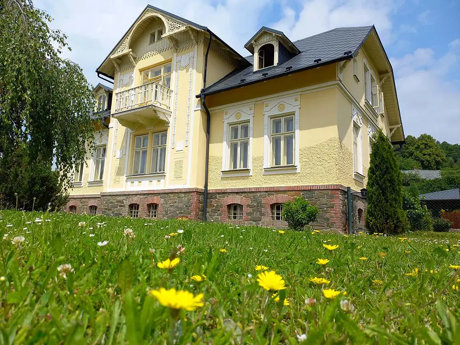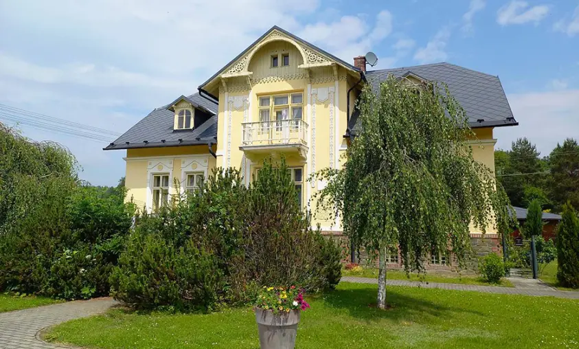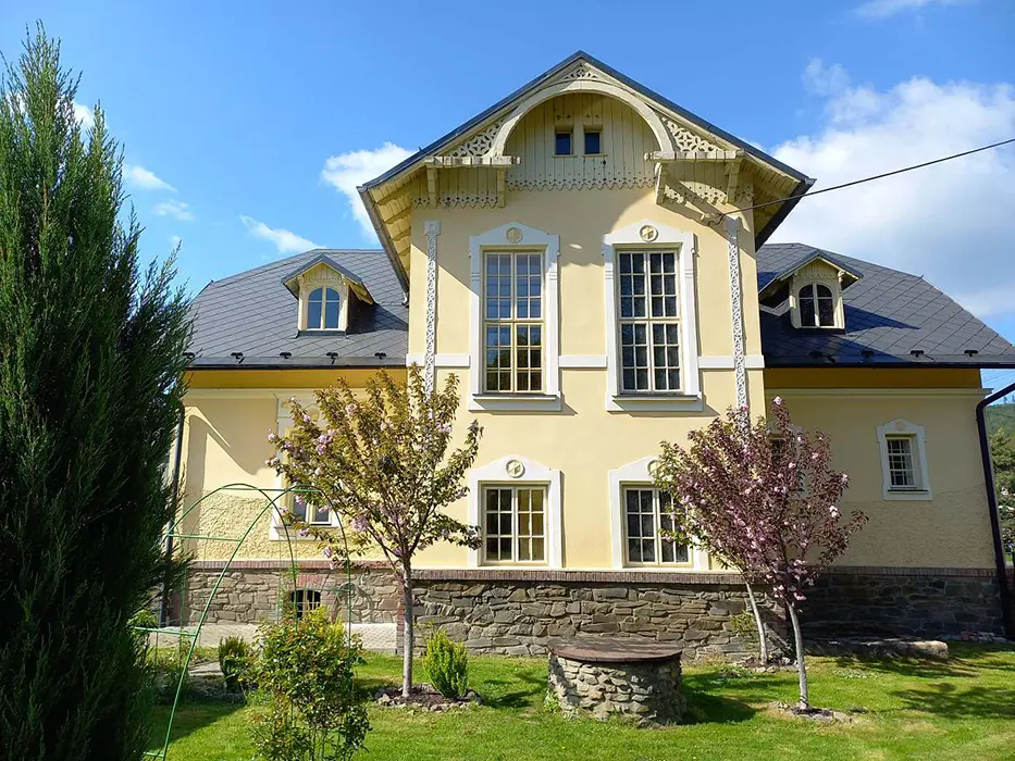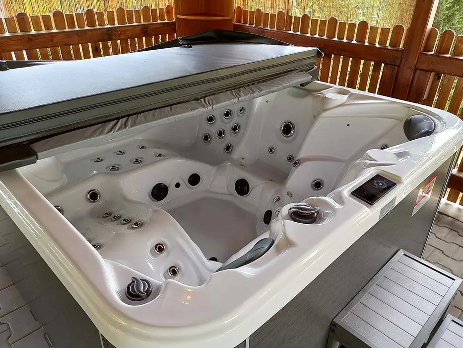 Na oplocené a okrasné zahradě - velké kryté posezení - lavice a stoly, zde je umístěna vířivka, gril, pro děti - prolézačky, skluzavka, houpačky, bazén