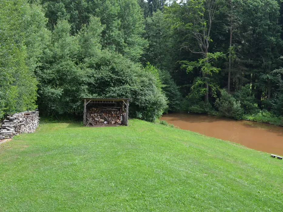 Na neoploceném pozemku zahradní posezení, přenosný gril, ohniště, pískoviště, rybník s možností koupání pro nenáročné
