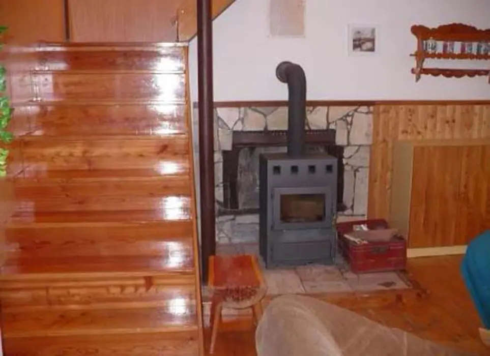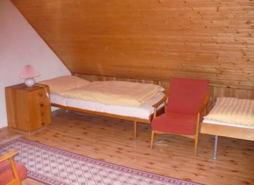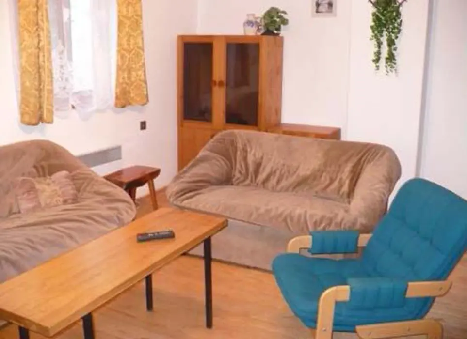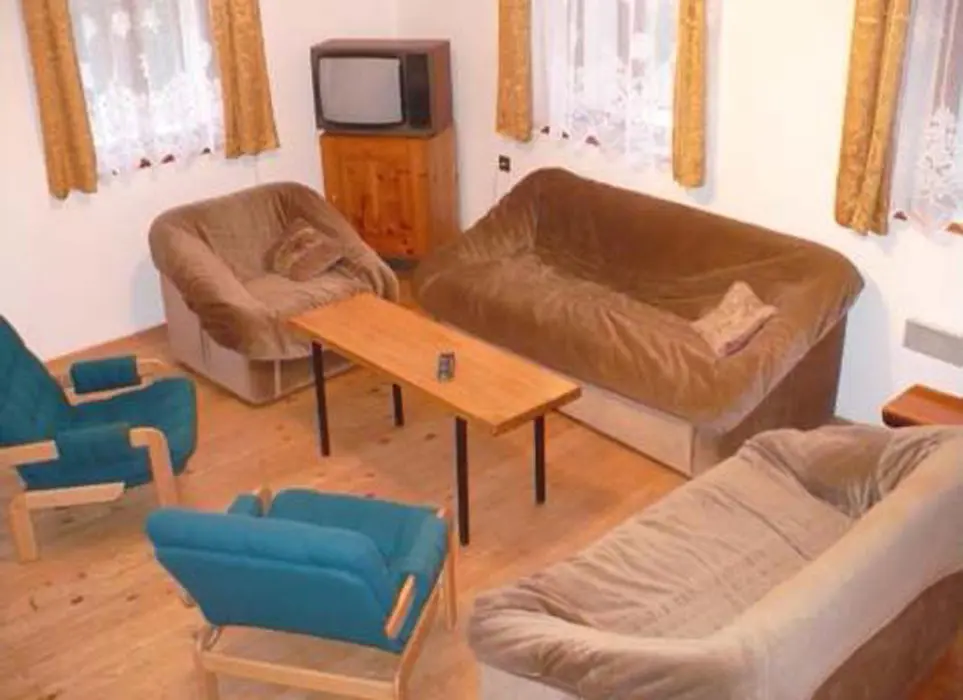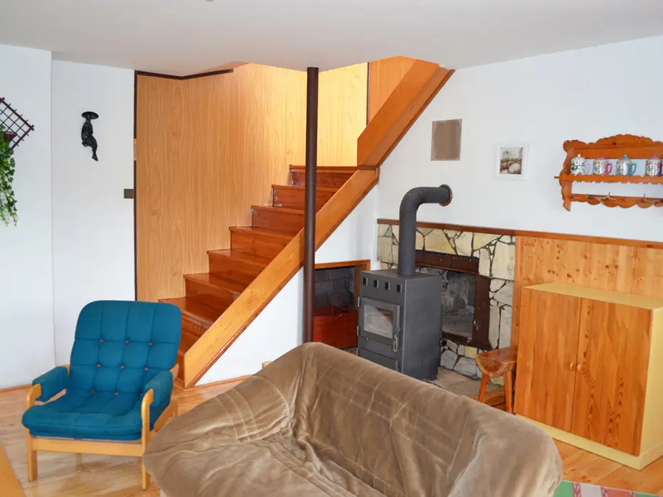 V přízemí obývací pokoj s krbovými kamny - sedací souprava, TV+SAT, jídelna s kuchyní - krbová kamna, lednička s 50 l mrazáčkem, el. sporák, myčka nádobí, varná konvice, kávovar, mikrovlnka, toustovač, nádobí. V patře 2 ložnice 2x4 lůžka. Soc. zařízení - sprcha, umyvadlo, samostatné WC. Topení - krbová kamna + el. přímotopy