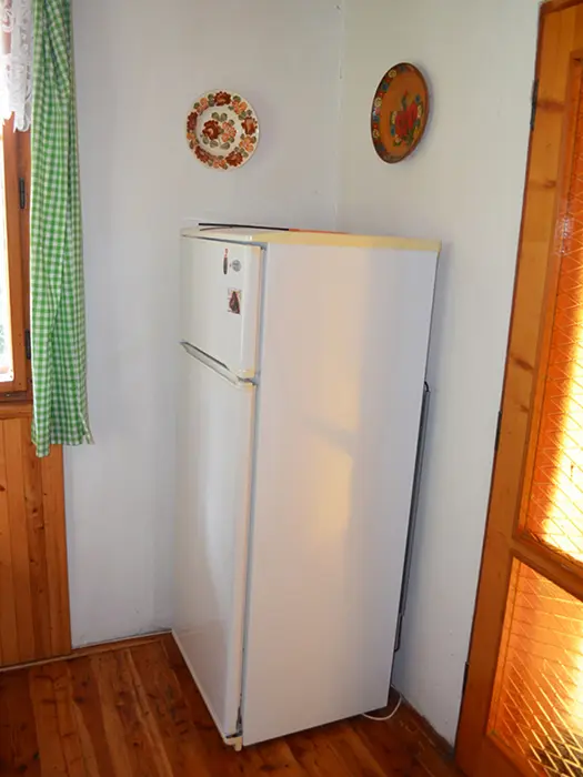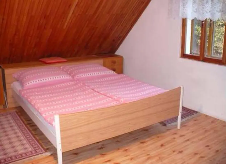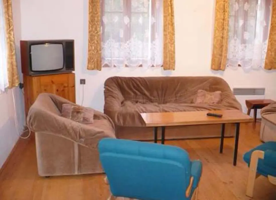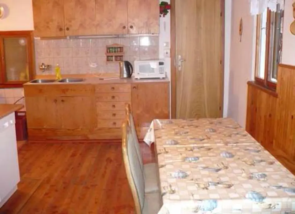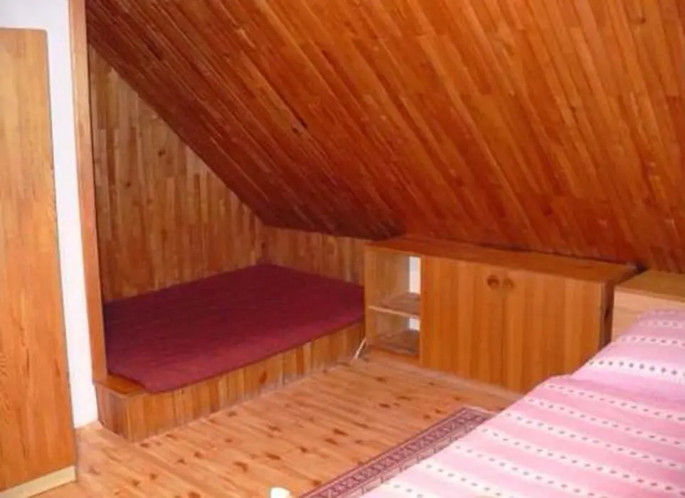V přízemí obývací pokoj s krbovými kamny - sedací souprava, TV+SAT, jídelna s kuchyní - krbová kamna, lednička s 50 l mrazáčkem, el. sporák, myčka nádobí, varná konvice, kávovar, mikrovlnka, toustovač, nádobí. V patře 2 ložnice 2x4 lůžka. Soc. zařízení - sprcha, umyvadlo, samostatné WC. Topení - krbová kamna + el. přímotopy