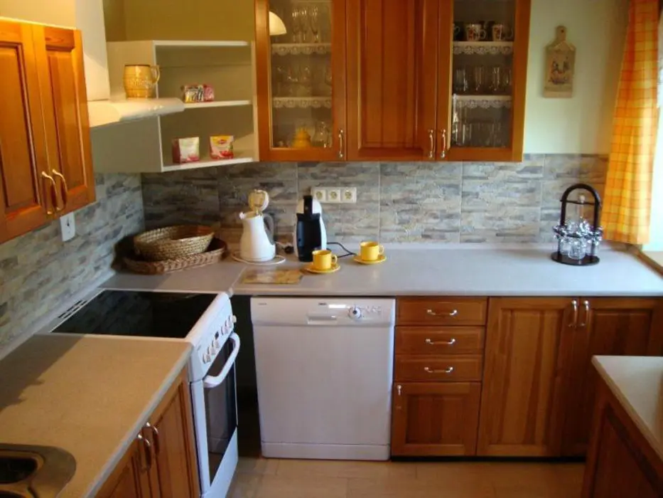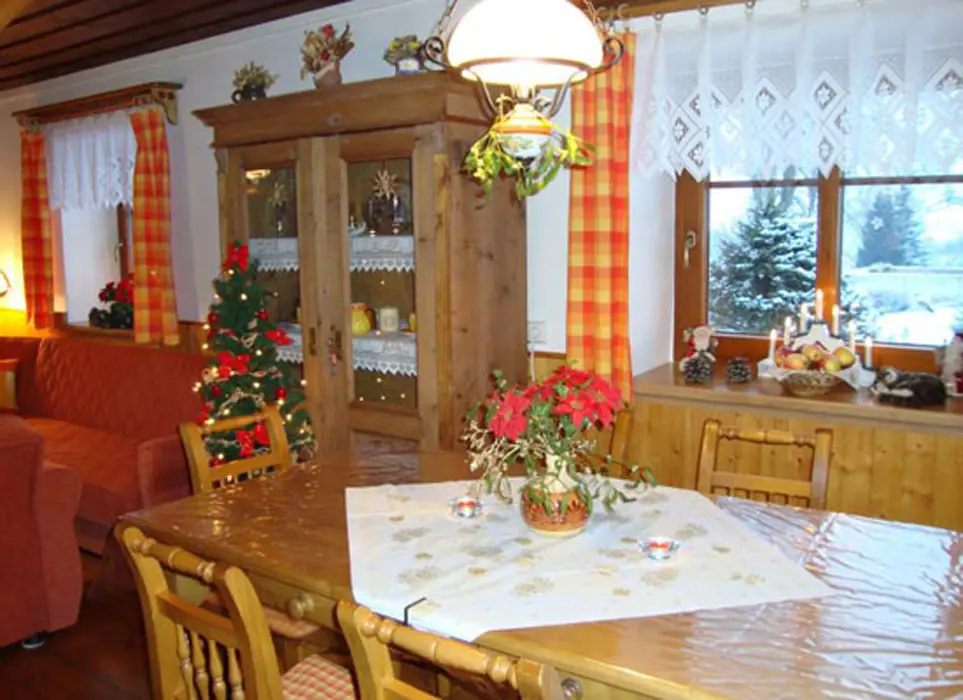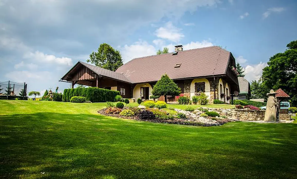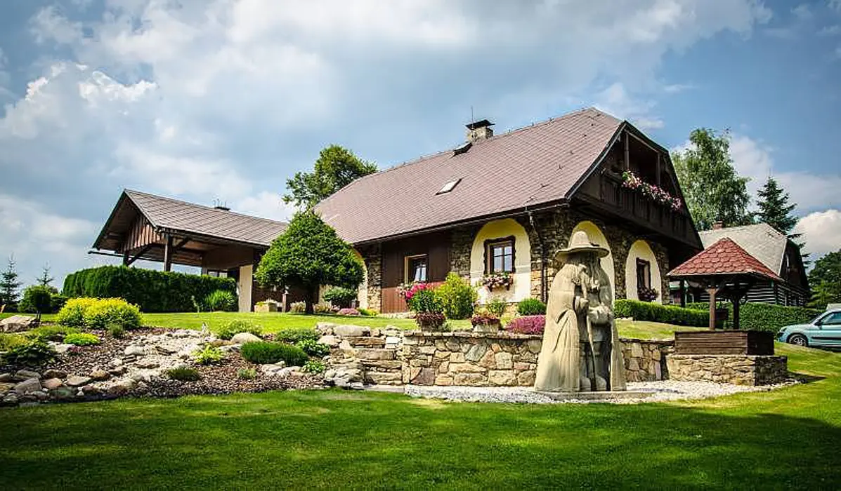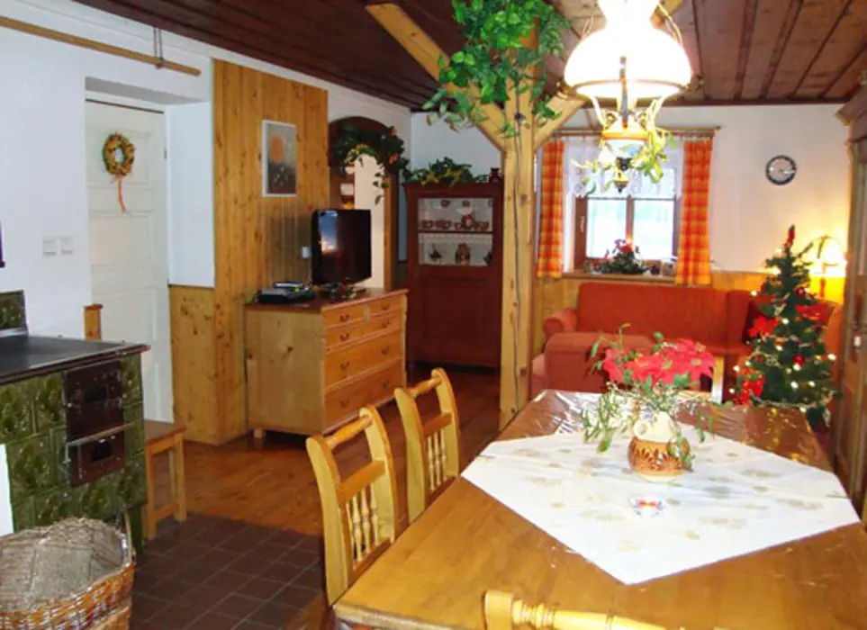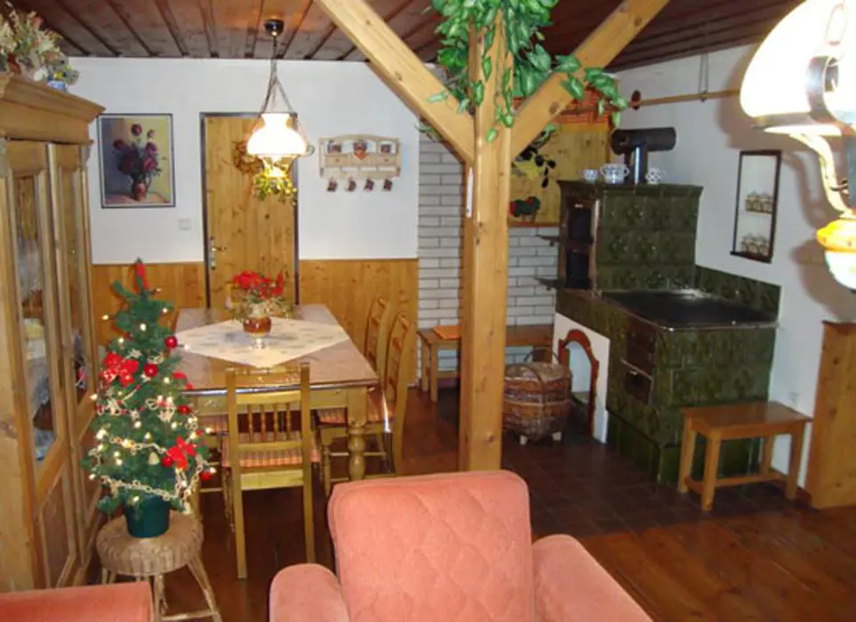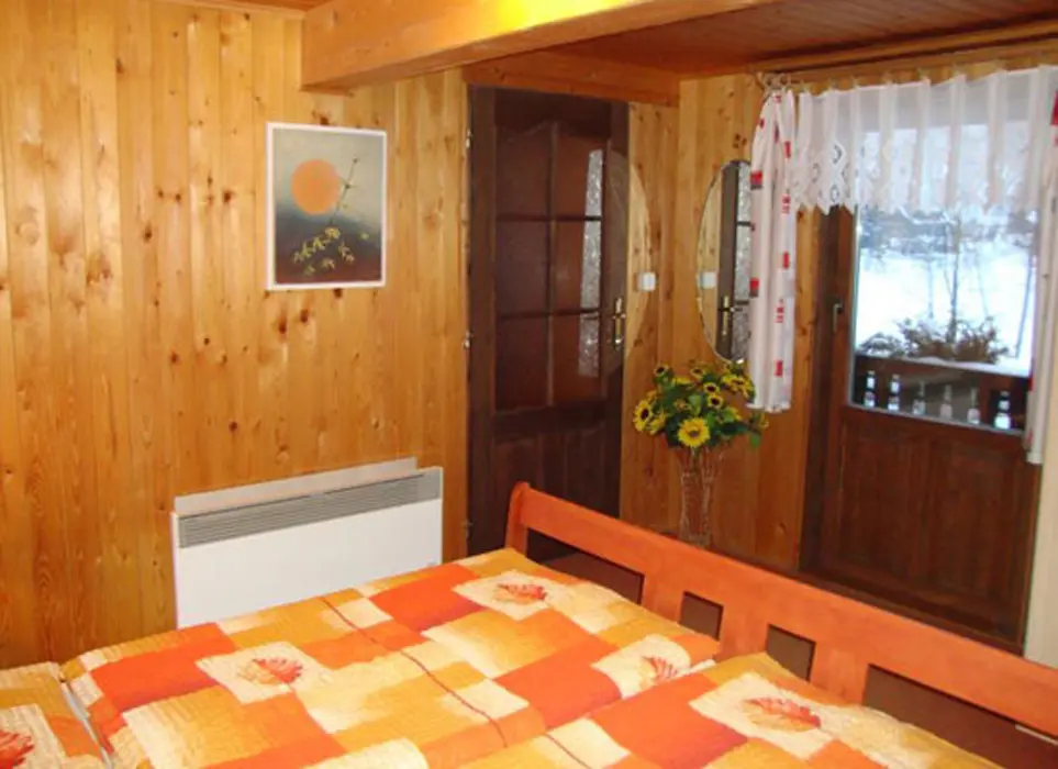 Vstupní veranda, v přízemí společenská místnost s kachlovými kamny s troubou a plotnou, rádio, BTV, SAT, LCD, DVD. Kuchyňka s lednicí a mrazicím boxem, sklokeramická varná deska, el. trouba, kávovar, mikrovlnka, varná konvice, myčka a digestoř. V podkroví 3 ložnice 3x2 lůžka, k dispozici dětská postýlka. Z jedné ložnice je vstup na balkon. 1x2 - dětský pokoj - rozkládací sedačka - 2 přistýlky, fotbálek, kuželky, stavebnice, autíčka a dětská židlička. V každé ložnici je televize. 2x koupelna, 2x sprchový kout, 2x WC, jednou samostatné. Místnost s masážní vanou 32 trysek, které lze různě nastavit. Masážní vana má 4 sedáky, 1 lůžko, je osvětlená. Topení v podlaze + el.přímotopy