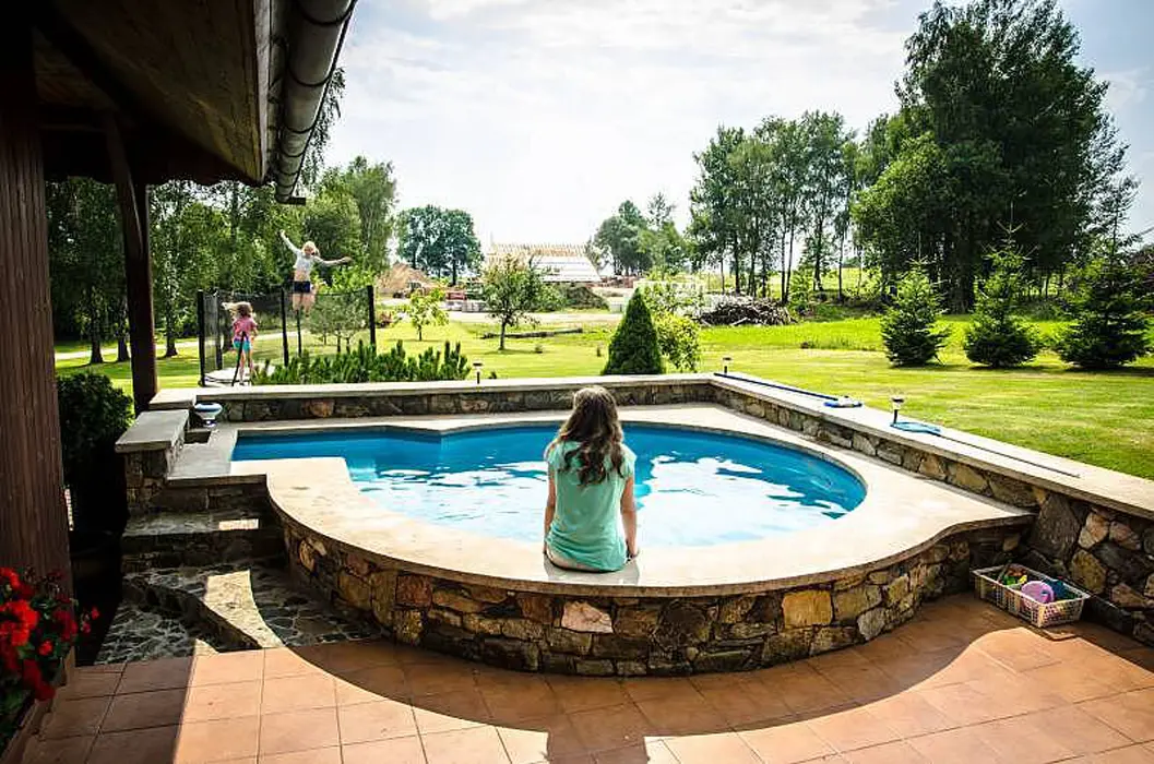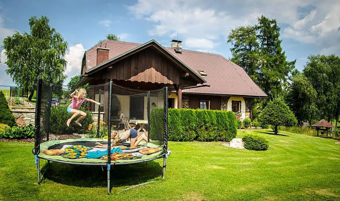 2x posezení u venkovního bazénu a pod venkovní přístavbou. V okrasné zahradě je trampolína o průměru 3 m, branky na fotbal, venkovní stolní tenis, dětská houpačka, pískoviště s hračkami. Venkovní posezení u krbu se zastřešením ( stůl, židle, 2 lehátka ). V přístavbě u bazénu ruský kulečník, posilovací stroj zn. Kettler, krb, el. gril, šipky, rádio