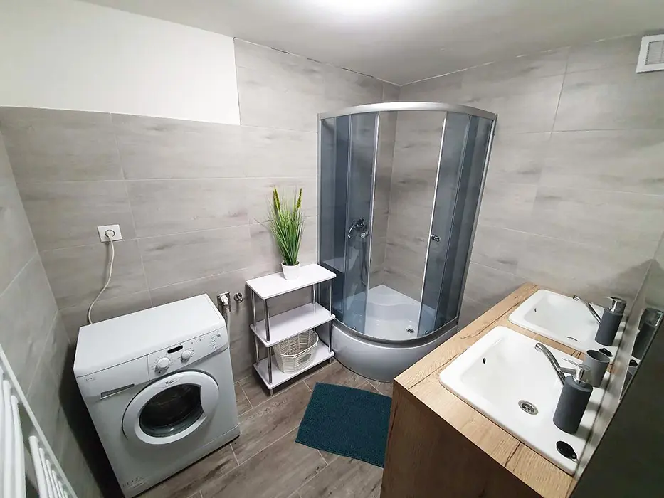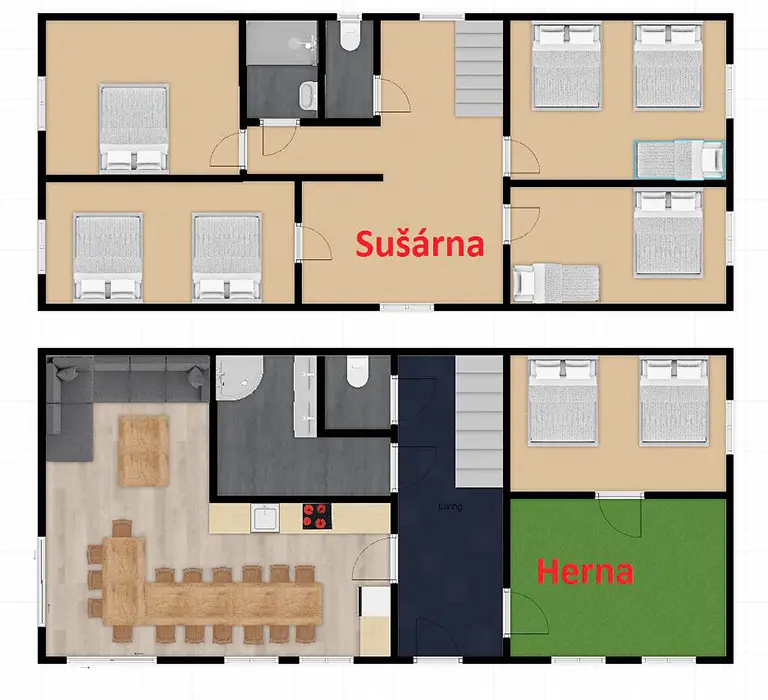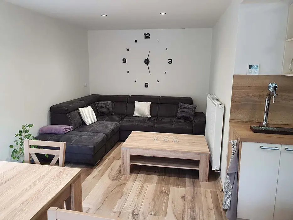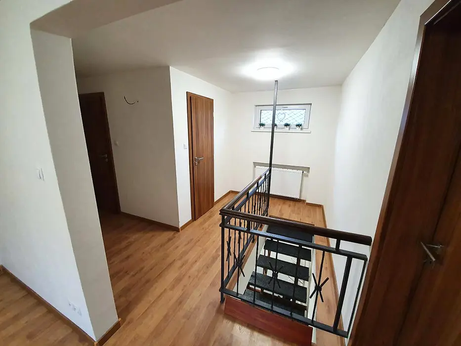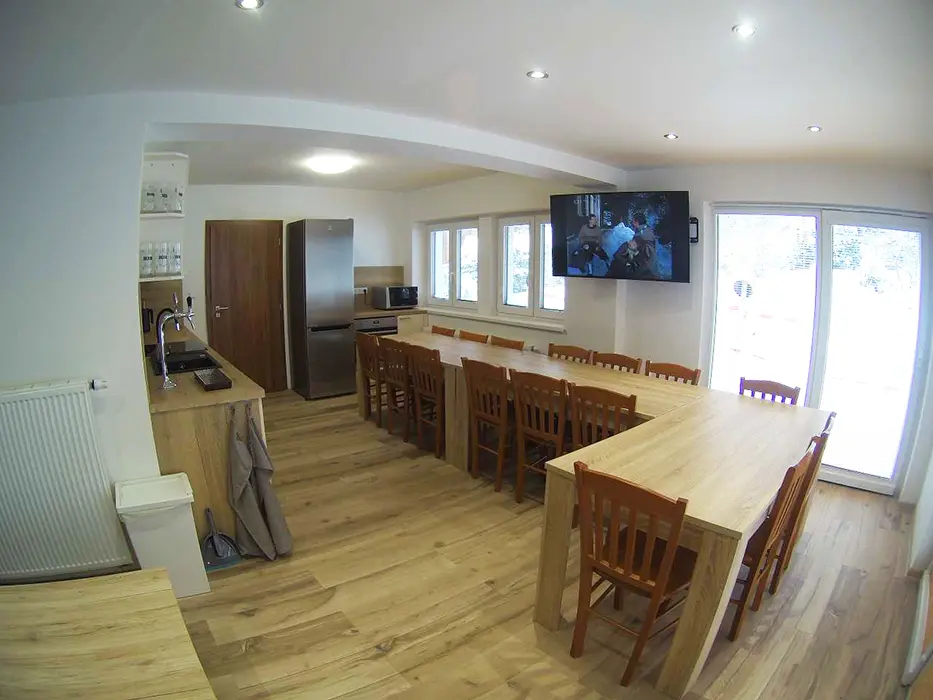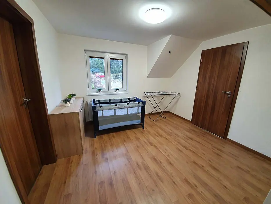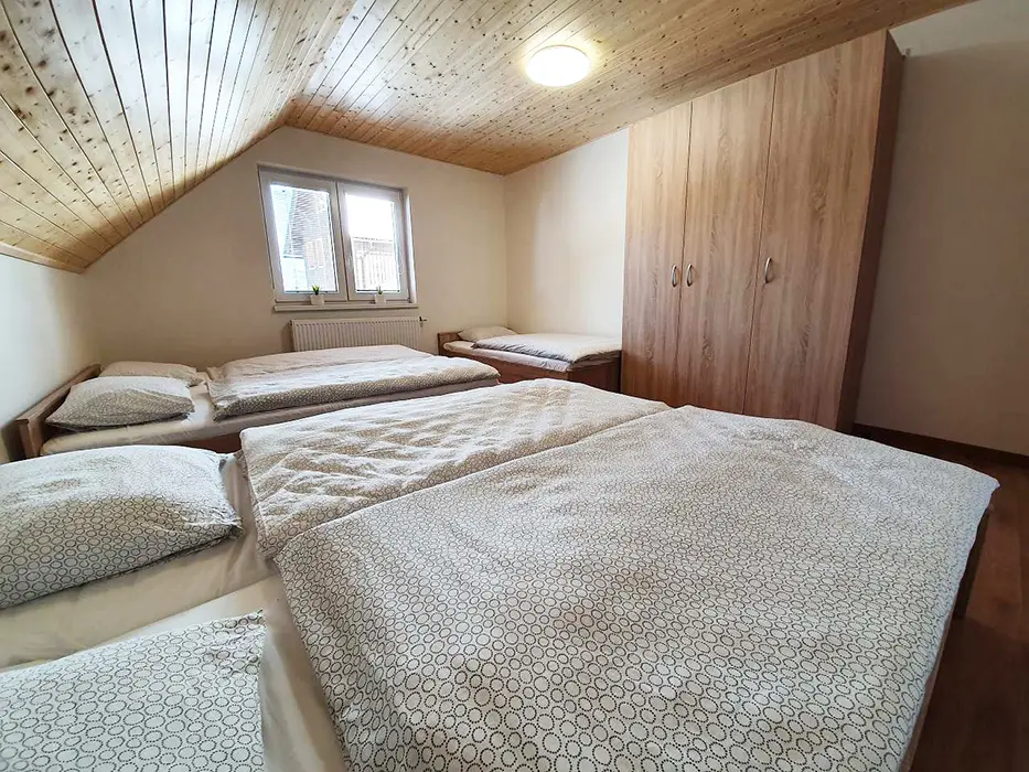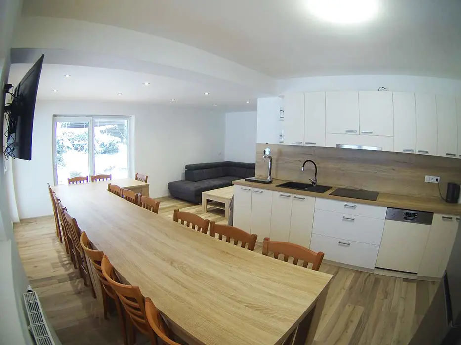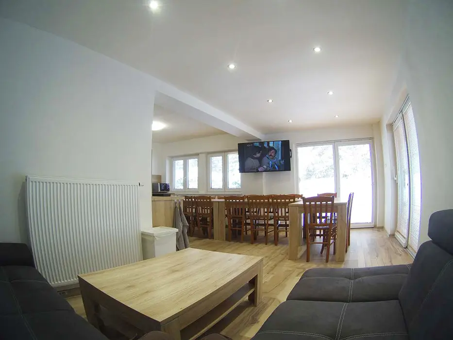 V přízemí prostoná obytná místnost spojená s kuchyní - stůl a židle pro 18 osob, sedací souprava, LCDTV, výčepní zařízení, vybavení kuchyně - veliká lednice s mrazákem, indukční varná deska, horkovzdušná trouba, myčka, mikrovlnka, varná konvice, nádobí. 5 ložnic - v přízemí - 1x4, v patře - 1x2, 1x3, 1x4, 1x5 lůžek. Soc. zařízení - v přízemí koupelna se sprchovým koutem, samostatné WC, v patře - sprchový kout s WC. Topení - vytápění i ohřev teplé vody - nízkonákladové tepelné čerpadlo, v každé koupelně je žebříkový radiátor, ve vstupní místnosti sušák na boty a lyžáky pro 12 párů bot, jednotlivé pokoje jsou vyhřívány radiátory