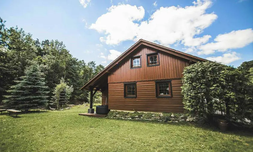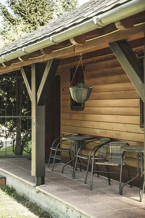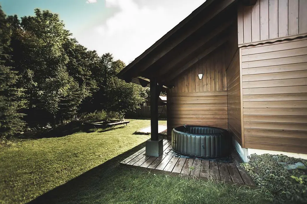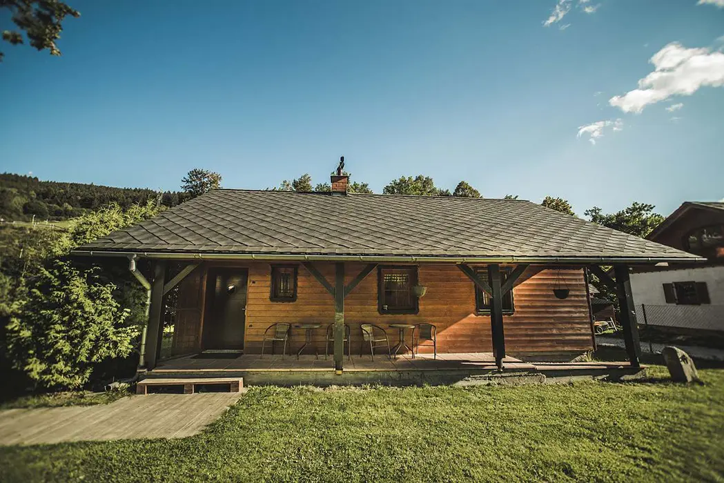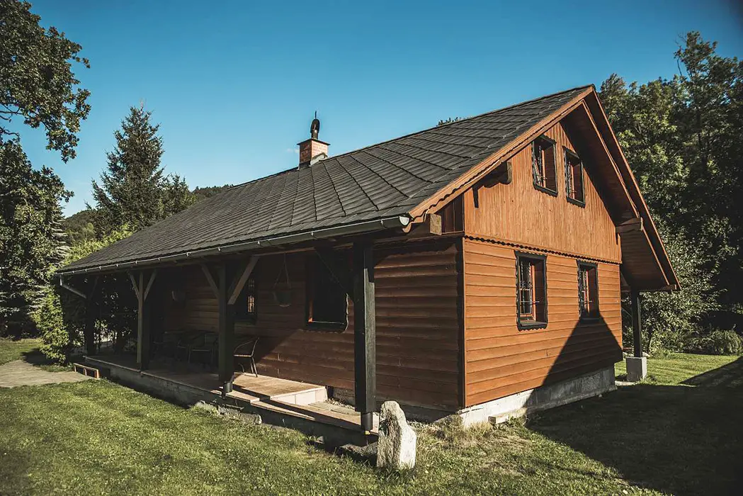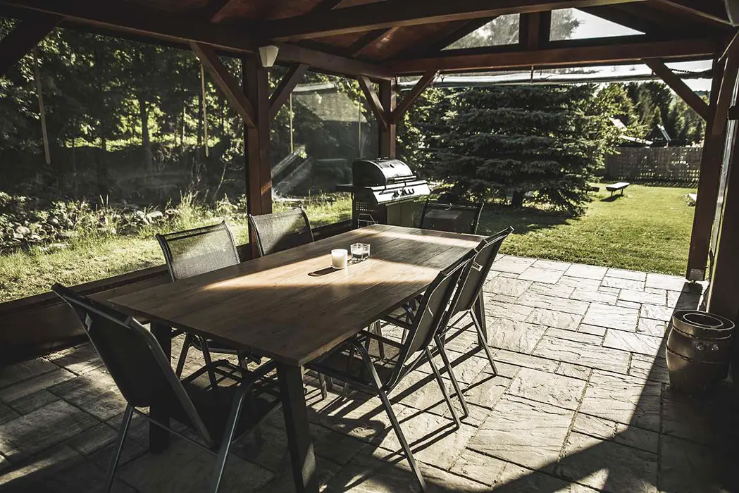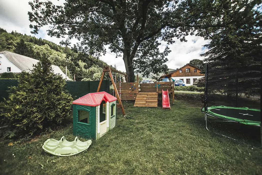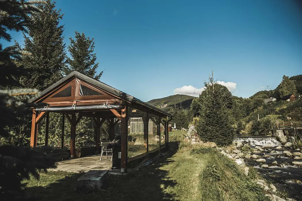 Kryté venkovní posezení, ohniště s možností grilování, řeka lemující pozemek, vířivka, trampolína, prolézačka pro děti