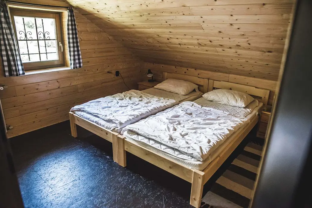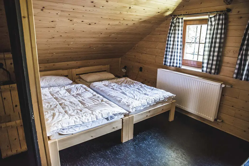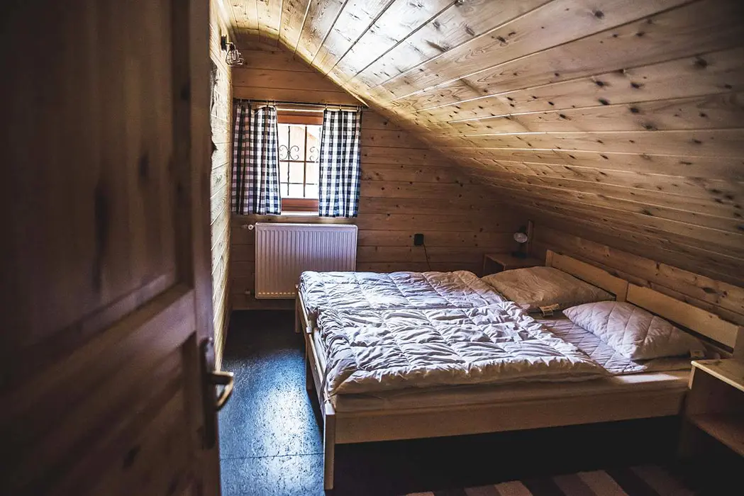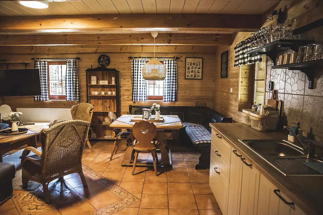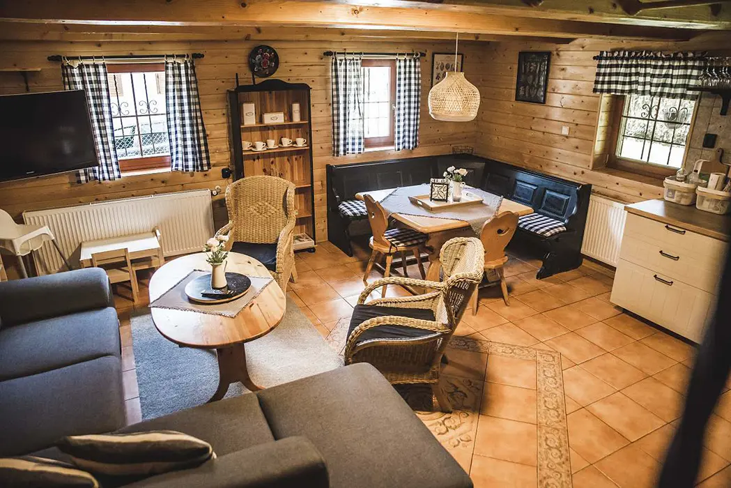 Obývací pokoj spojený s kuchyní, TV, SAT, sedací souprava, krbová kamna. Kuchyňská linka - el.sporák, lednice, nádobí, jídelní kout. 3 ložnice 1x2, 2x4 lůžka. Sociální zařízení - velký sprchový kout, 2x WC. Topení - ústřední topení + elektrický kotel + krbová kamna