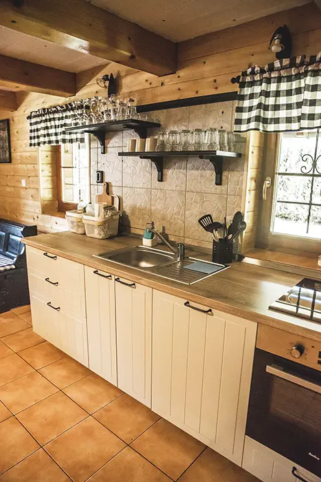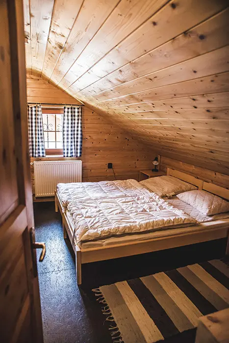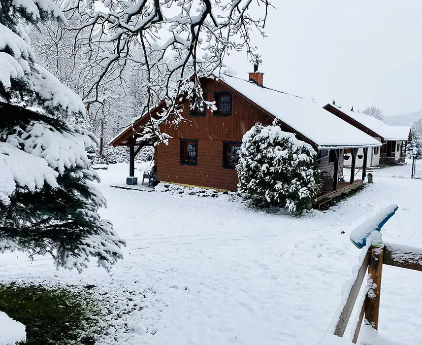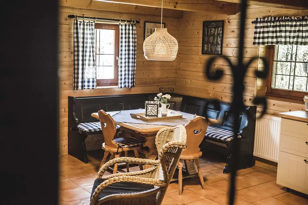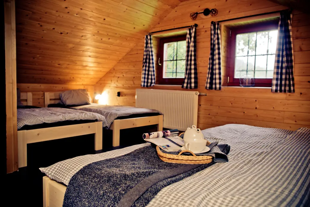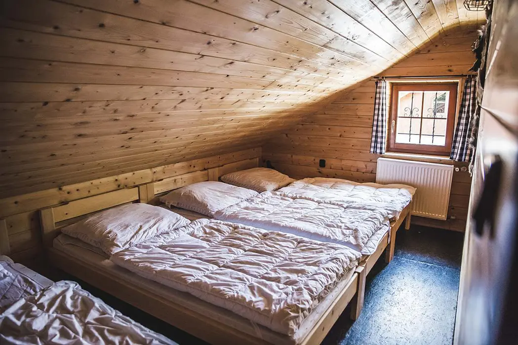Obývací pokoj spojený s kuchyní, TV, SAT, sedací souprava, krbová kamna. Kuchyňská linka - el.sporák, lednice, nádobí, jídelní kout. 3 ložnice 1x2, 2x4 lůžka. Sociální zařízení - velký sprchový kout, 2x WC. Topení - ústřední topení + elektrický kotel + krbová kamna