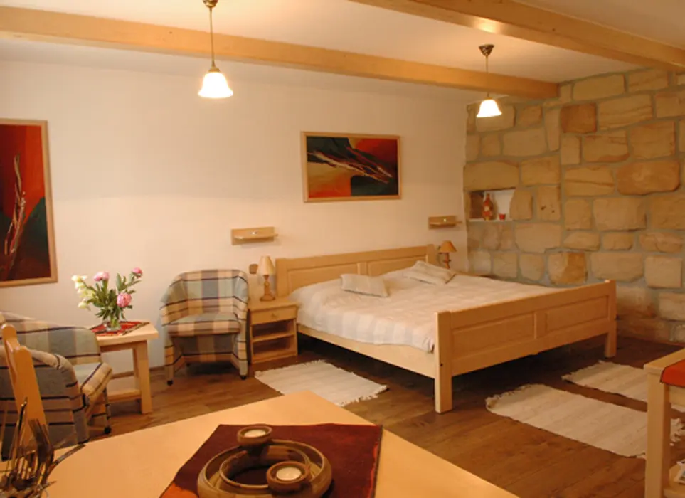 Velká prostorná obytná místnost - sedací souprava, LCD, SAT, 2 lůžka + 1 přistýlka, kuchyně - sklokeramická varná deska, lednice, varná konvice, mikrovlnka, stůl a židle, základní nádobí. Koupelna - sprchovací kout, samostatné WC. Topení el. přímotopy