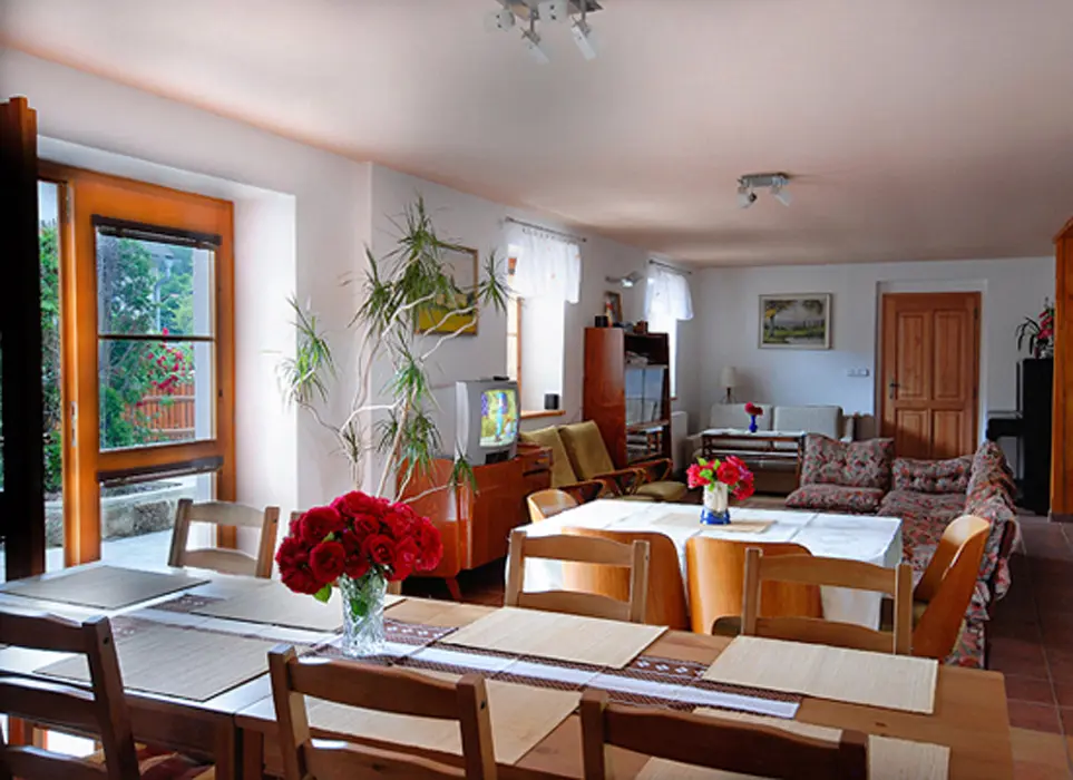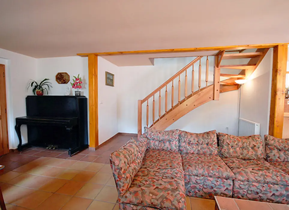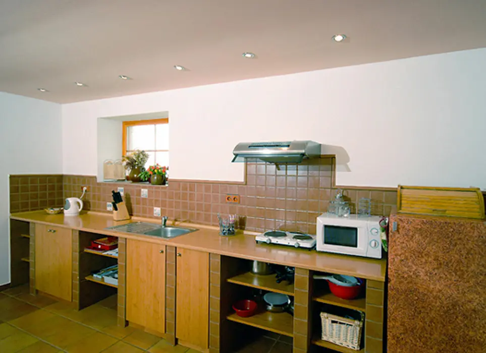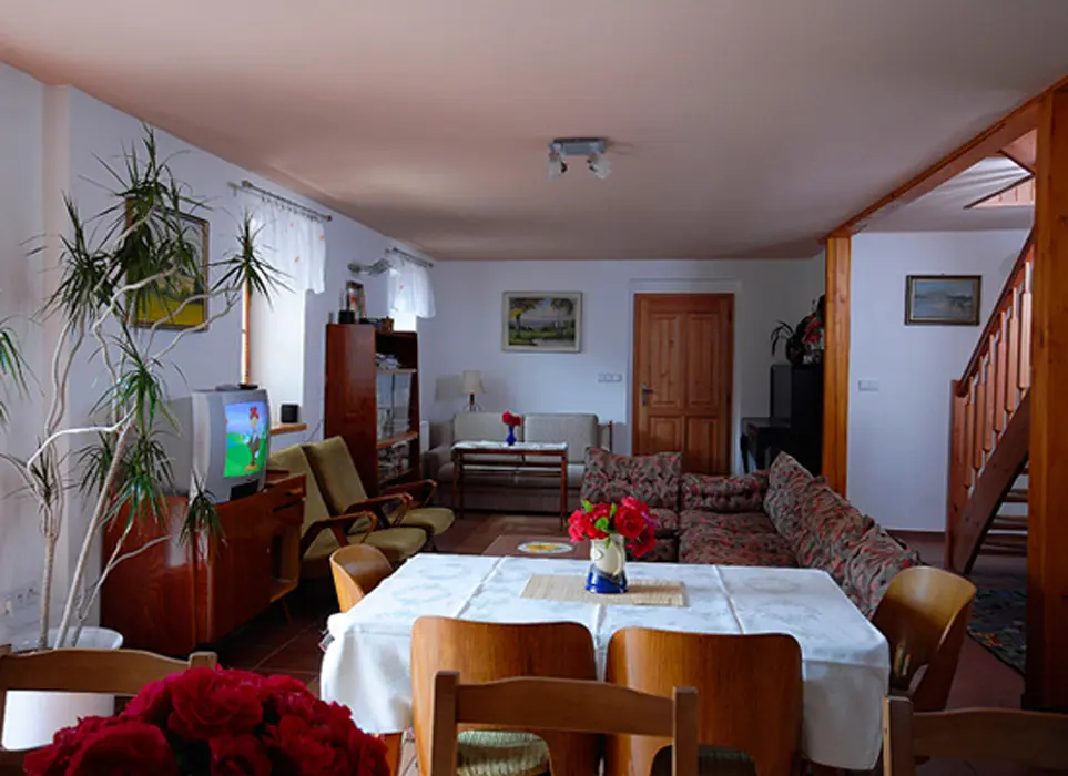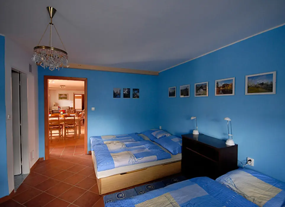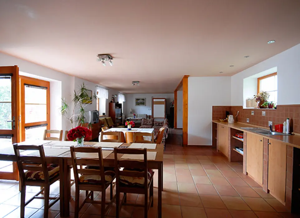 V přízemí veliká šatna, společenská místnost s posezením, TV, DVD, domácí kino, knihovna, filmotéka a klavír. Kuchyňský kout - lednice, mikrovlnka, sklokeramická 4 plotýnková deska, 3x dvou plotýnkový vařič, myčka, rychlovarná konvice a základní nádobí. V patře - 3 ložnice 3x4 lůžka s možností přistýlky, jídelní stůl a židle, každá ložnice má vlastní koupelnu se sprchovým koutem + WC. U společenské místnosti WC s umyvadlem. Topení centrální