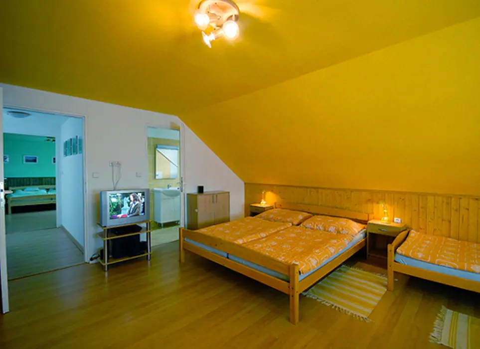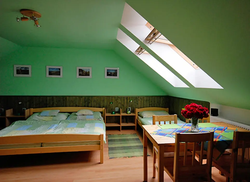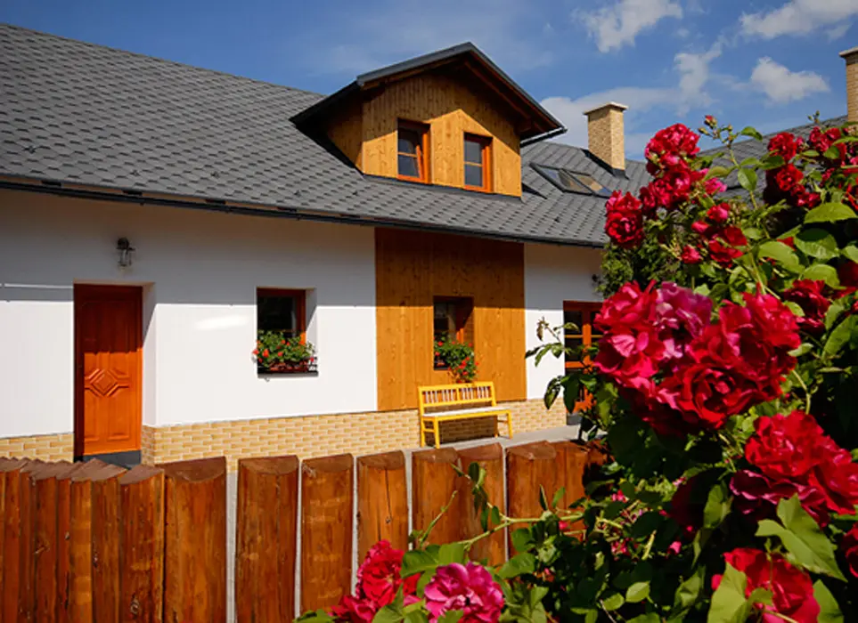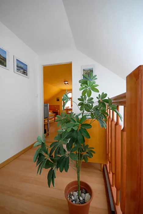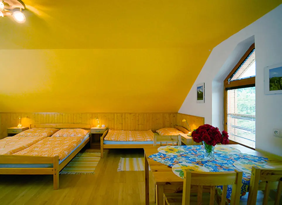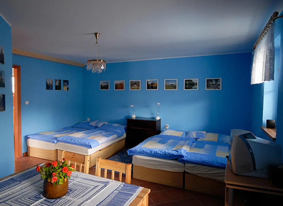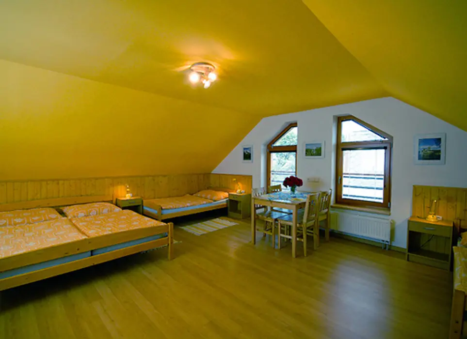 V přízemí veliká šatna, společenská místnost s posezením, TV, DVD, domácí kino, knihovna, filmotéka a klavír. Kuchyňský kout - lednice, mikrovlnka, sklokeramická 4 plotýnková deska, 3x dvou plotýnkový vařič, myčka, rychlovarná konvice a základní nádobí. V patře - 3 ložnice 3x4 lůžka s možností přistýlky, jídelní stůl a židle, každá ložnice má vlastní koupelnu se sprchovým koutem + WC. U společenské místnosti WC s umyvadlem. Topení centrální