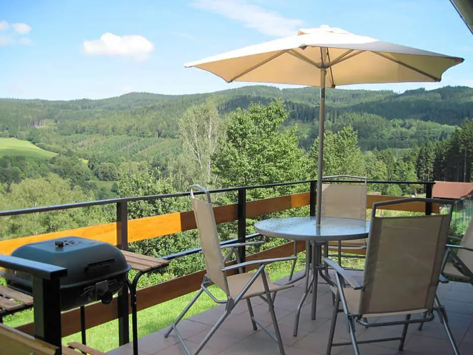Venkovní terasa s výhledem na údolí - posezení, gril, slunečník, ohniště, K uzamykatelná kolna na uschování kol