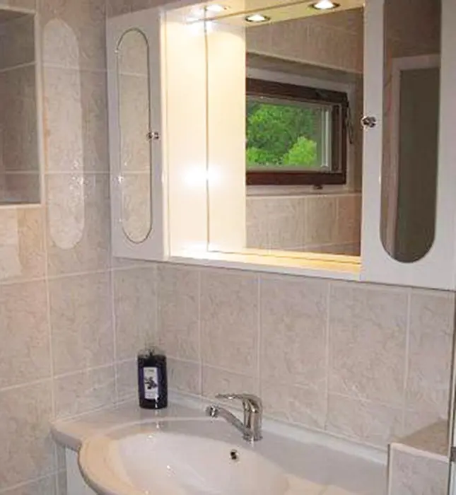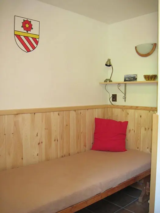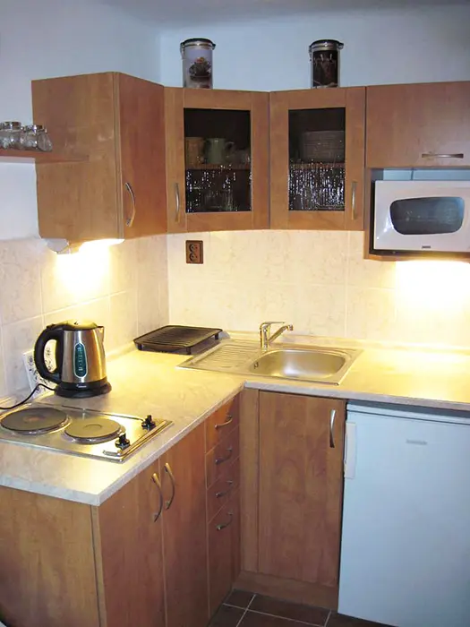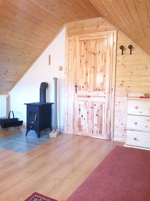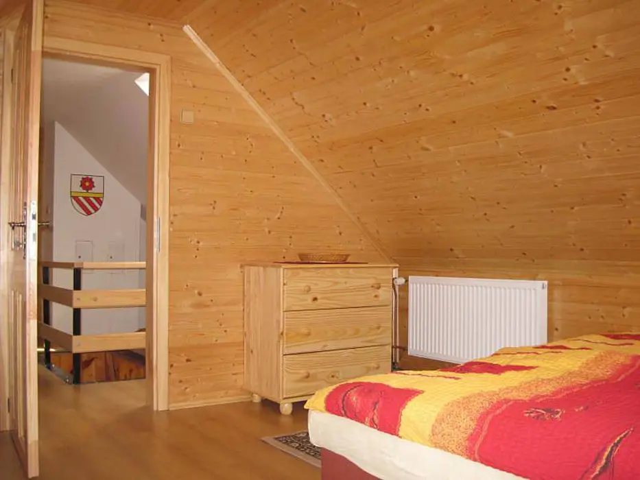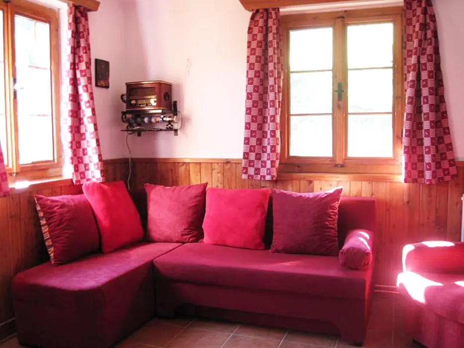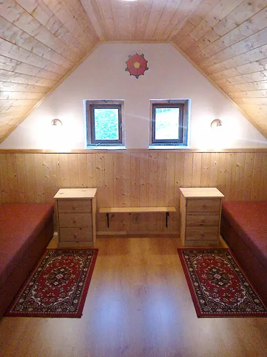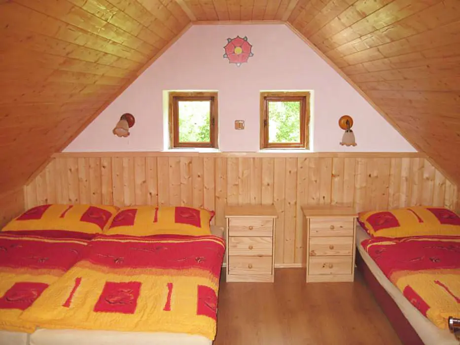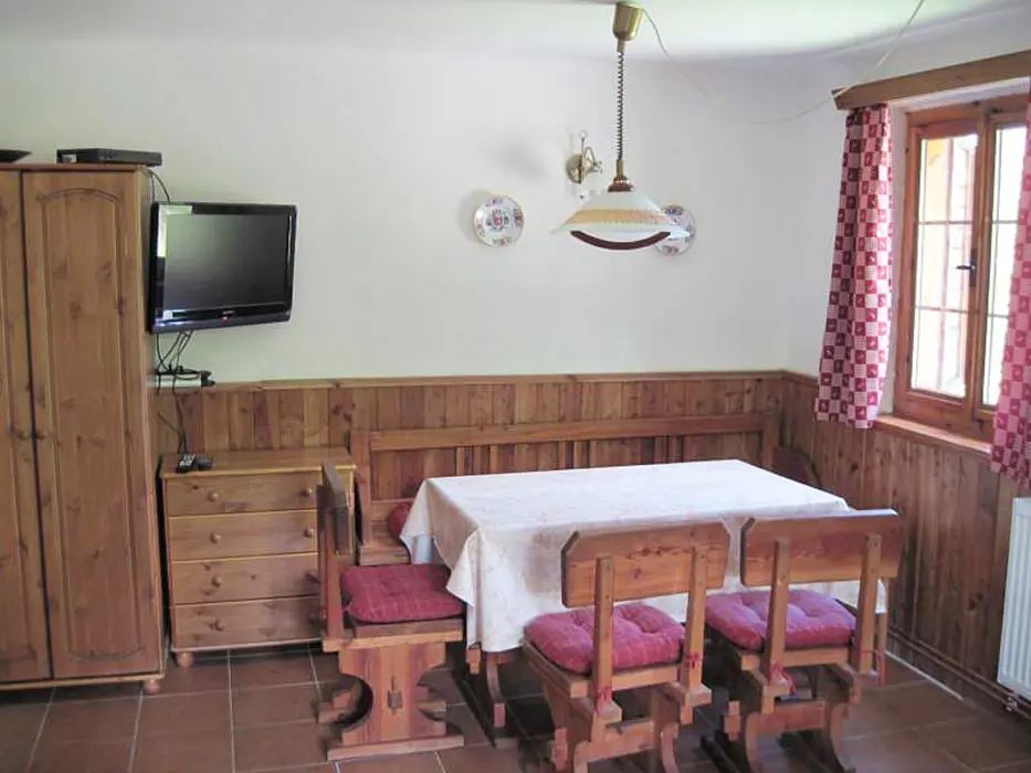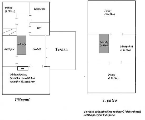 V přízemí - vstupní chodba, obytná část spojená s kuchyní - sedací souprava, krb, LCD televize + satelit, rádio s CD a MP3, jídelní stůl a židle, vybavení kuchyně - indukční dvouplotýnkový vařič, lednice, mikrovlnná trouba, varná konvice, remoska, žehlička. 3 ložnice - v přízemí 1x1, v patře - 1x2, 1x3 lůžka. Soc. zařízení - koupelna se sprchovým koutem, autom. pračka, samostatné WC. Topení - elektrický kotel - rozvod do radiátorů, krb - tuhá paliva