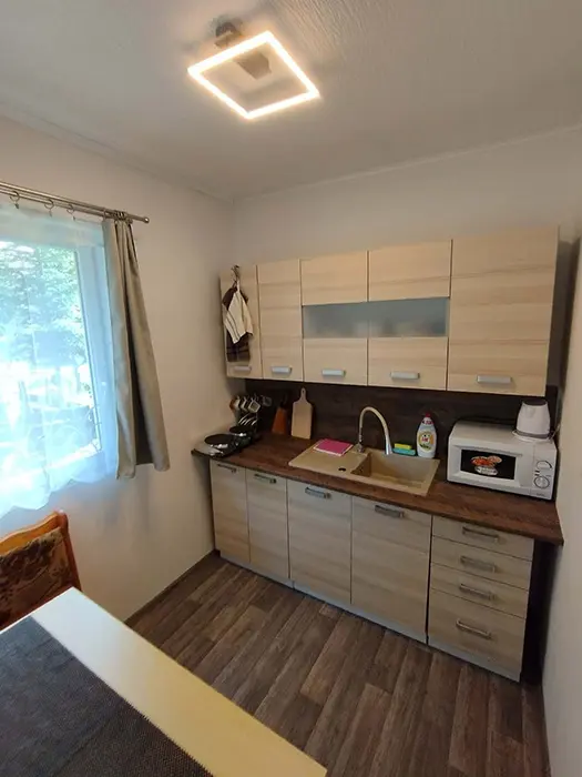 Kuchyňský kout - lednice s mrazákem a ledovačem na tvorbu ledu, vařič, varná konvice, mikrovlnka, nádobí, TV, kuchyňský stůl, rozkládací gauč - 1 lůžko. 2 ložnice - 2x2 lůžka. Soc. zařízení - sprcha + WC. Topení - el. přímotopy