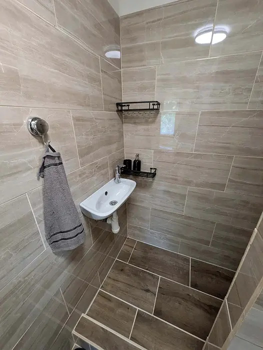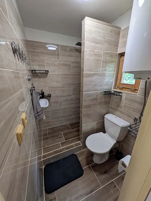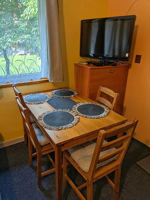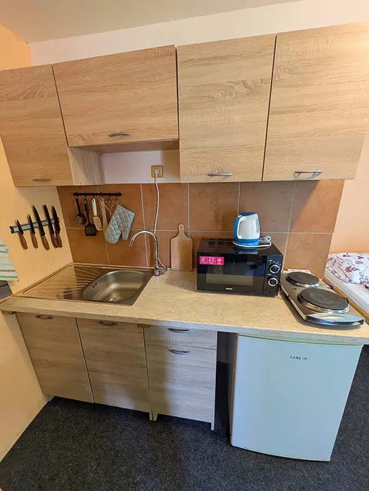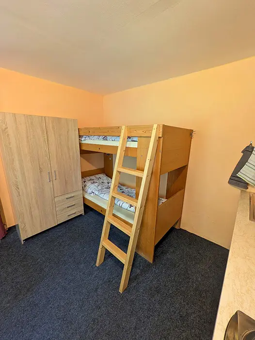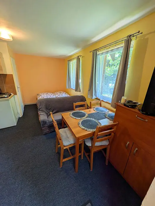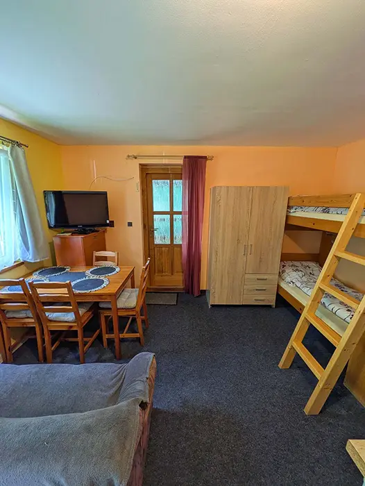 V jedné místnosti je kuchyňský kout - lednice, vařič, varná konvice, nádobí, TV, jídelní stůl a židle, dvoulůžko + patrová postel. Sociální zařízení - sprcha, WC. Topení - el. přímotopy