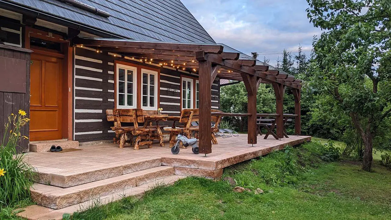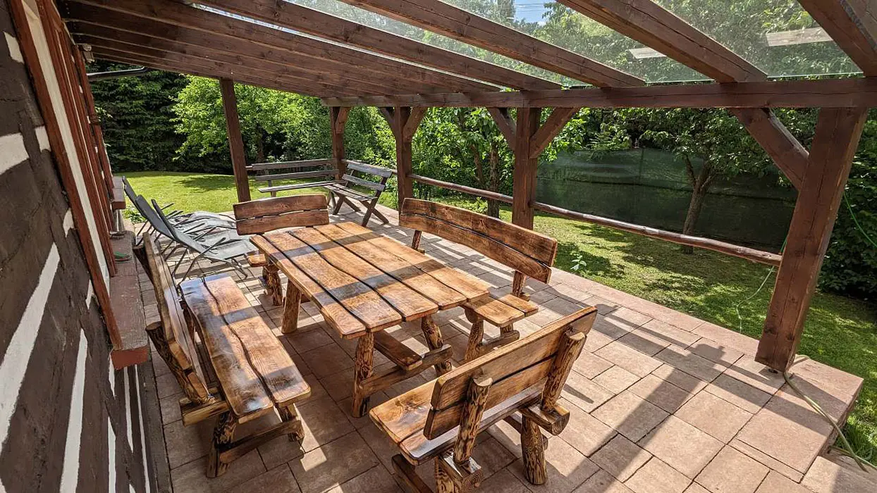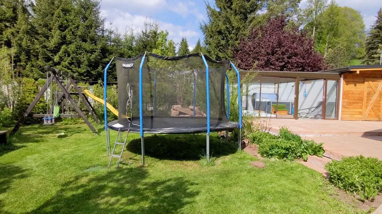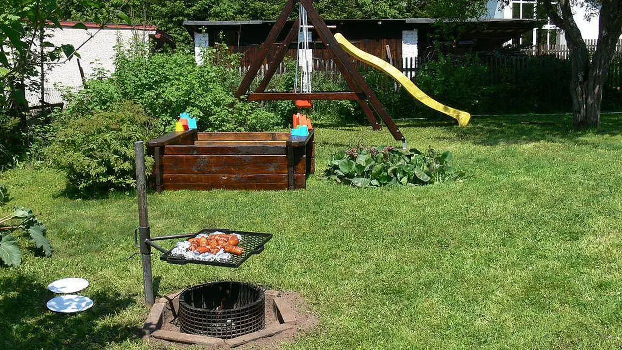 Venkovní posezení v zahradě, ohniště, gril, dětské hřiště, trampolína, pískoviště, venkovní vyhřívaný bazén, vířivka, finská sauna