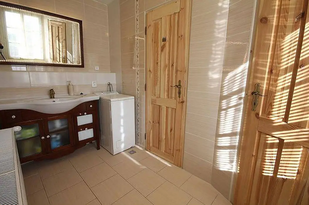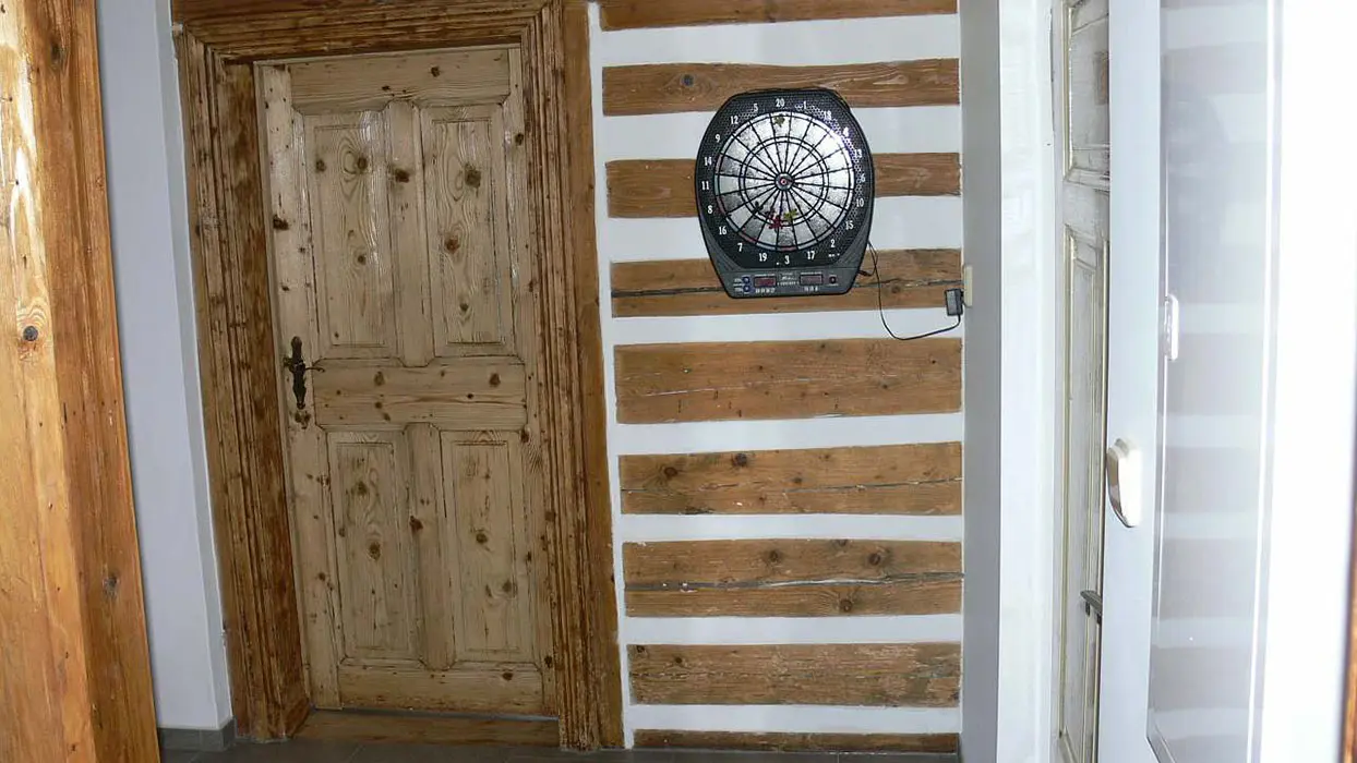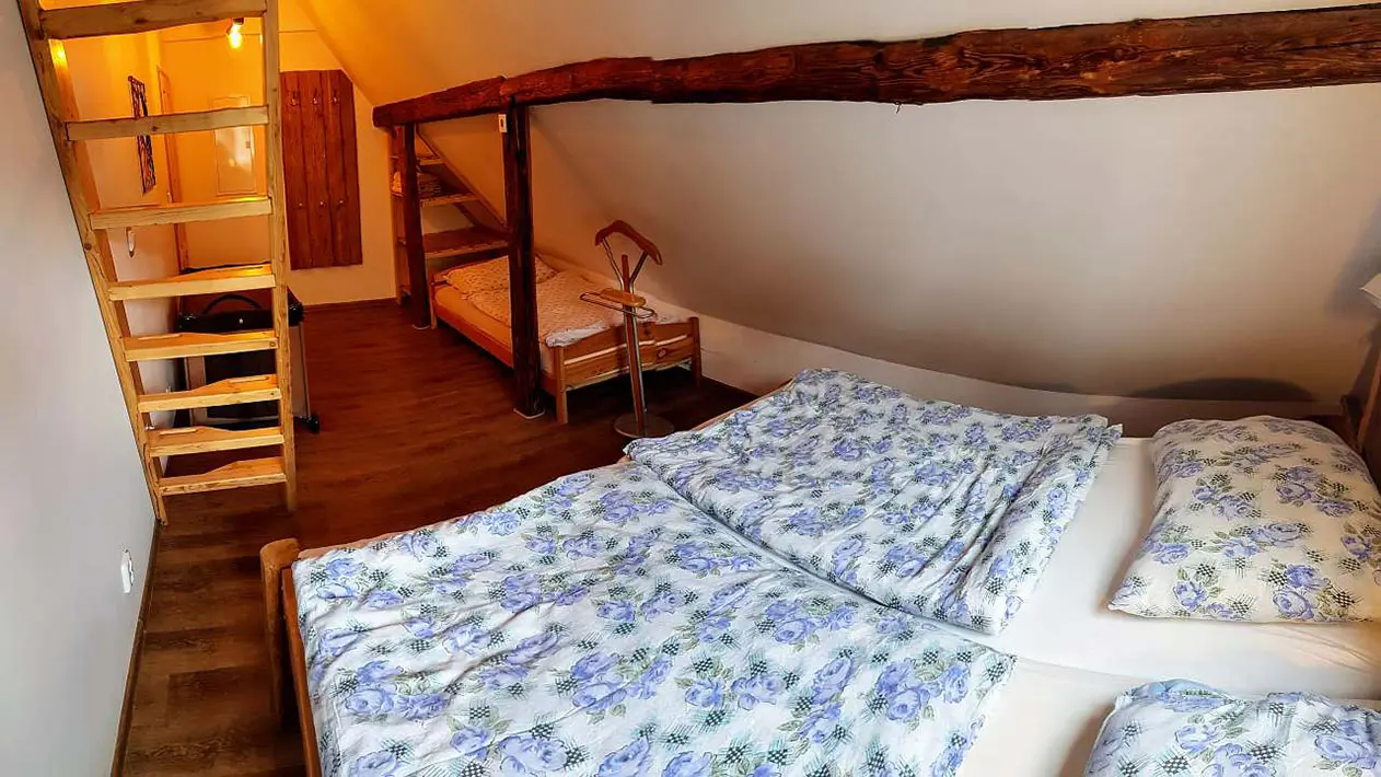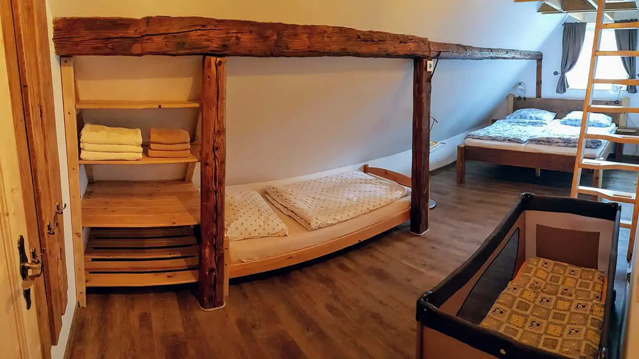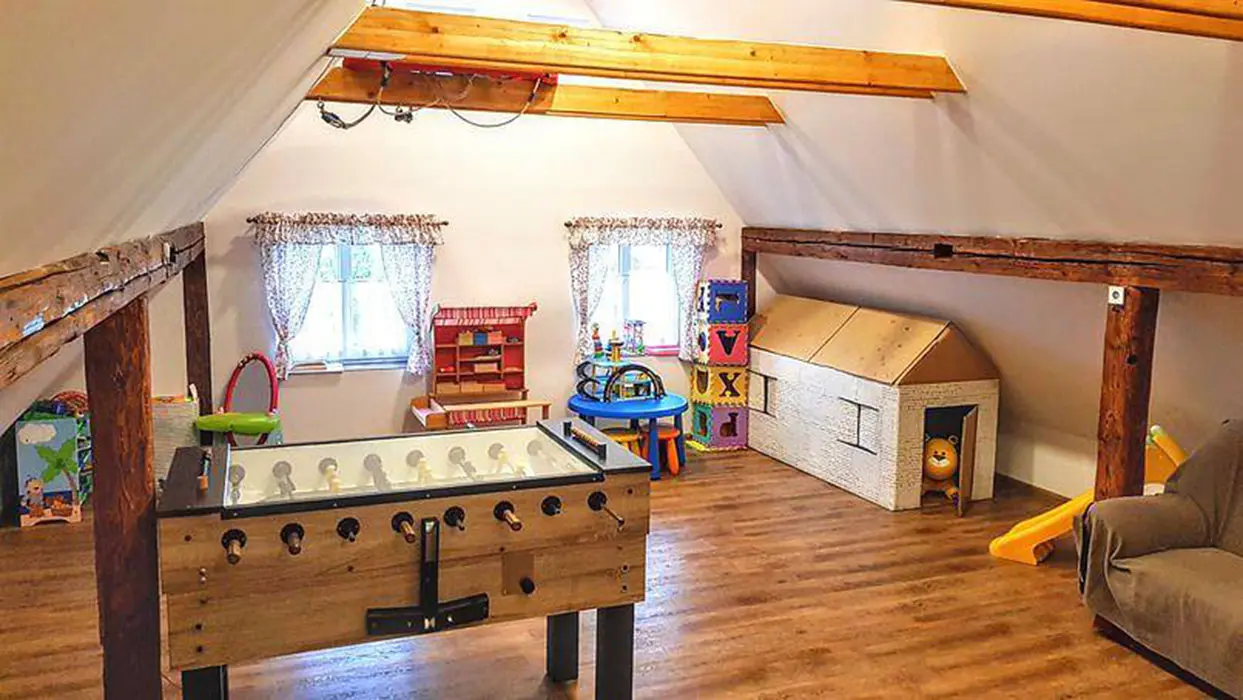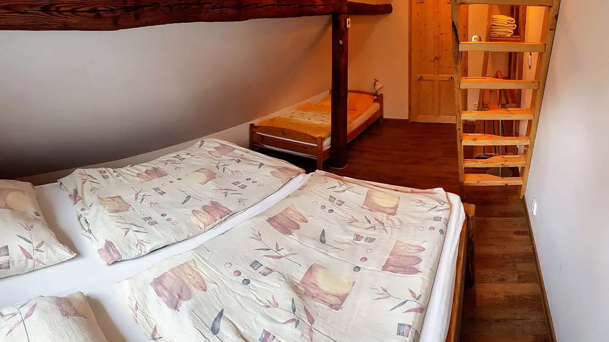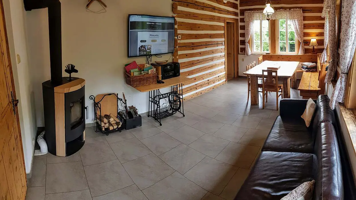 Společenská místnost - jídelní kout, posezení, LCDTV, krbová kamna, vybavená kuchyně - el.sporák se sklokeramickou deskou, lednice s mrazákem, mikrovlnná trouba, myčka, kávovar, topinkovač, nádobí. 4 ložnice - v přízemí 2x2, v patře 2x4 lůžka, k dispozici 2x postýlka. V patře je herna 60m2. Soc. zařízení - v přízemí, je rozdělena na umývárnu s velkým umyvadlem a pračkou, samostatné WC a druhé WC s velkým sprchovým koutem, v podkroví - 1x WC a umyvadlo. Topení - podlahové topení, krb, el. kotel, zásobník teplé vody 200 l