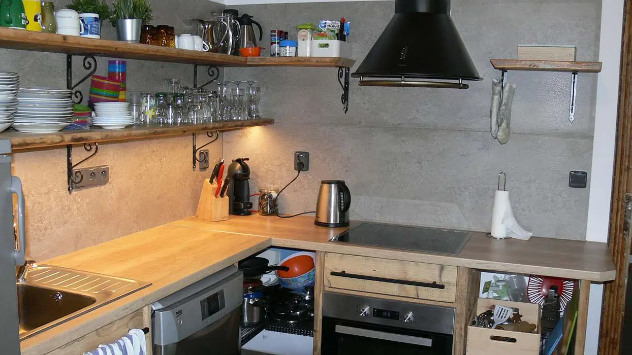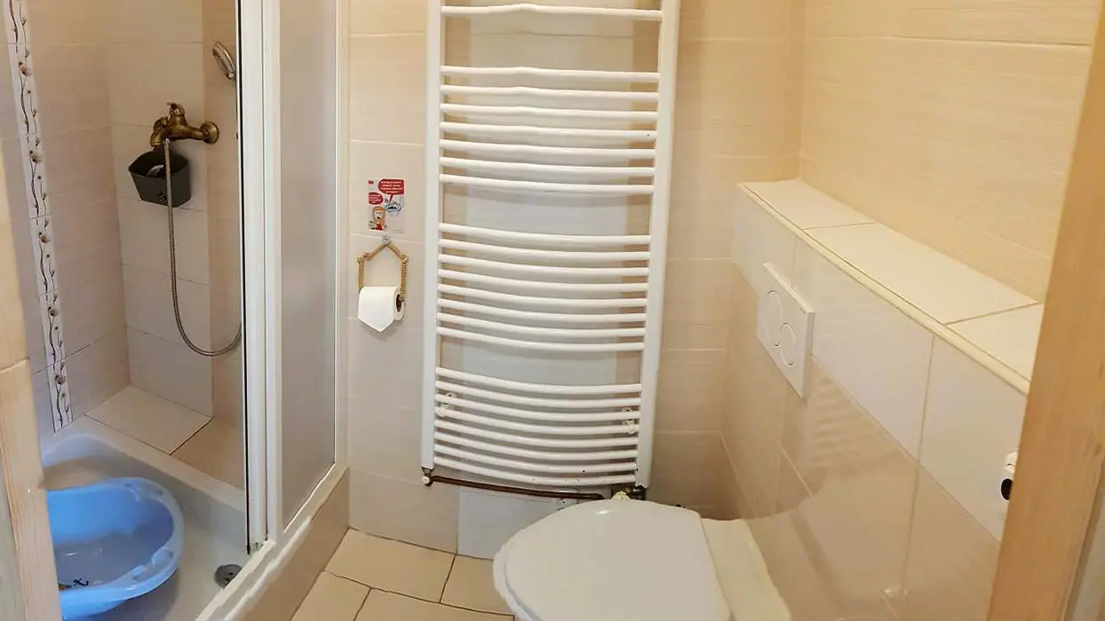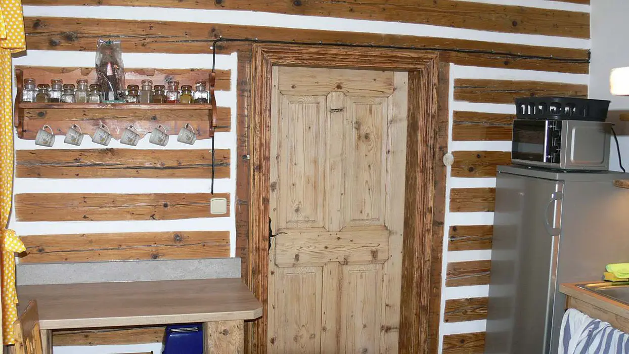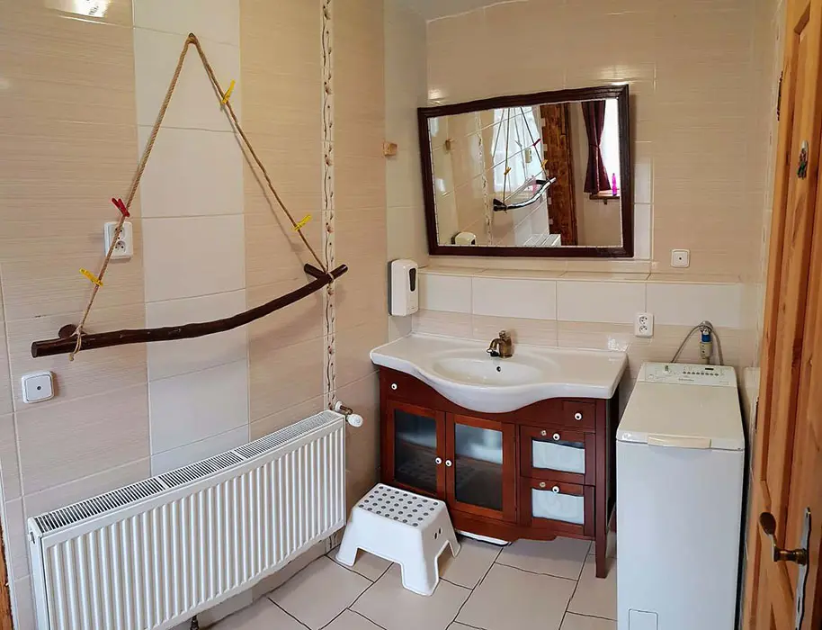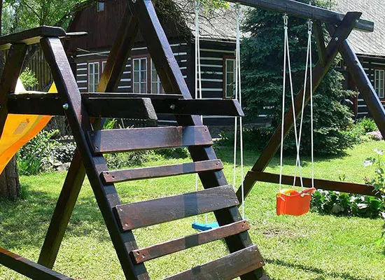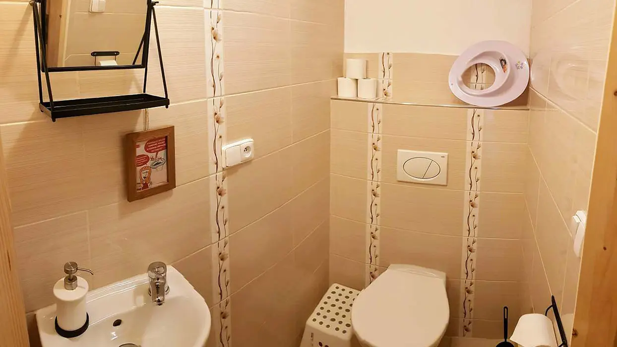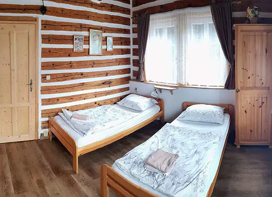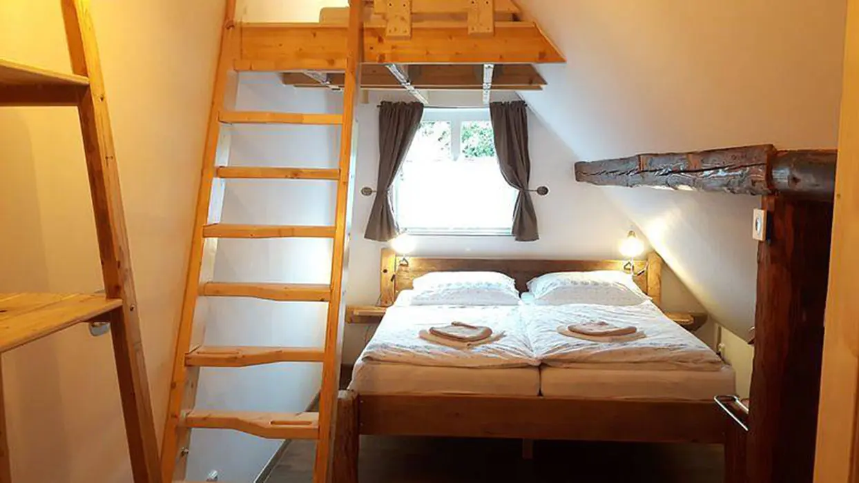 Společenská místnost - jídelní kout, posezení, LCDTV, krbová kamna, vybavená kuchyně - el.sporák se sklokeramickou deskou, lednice s mrazákem, mikrovlnná trouba, myčka, kávovar, topinkovač, nádobí. 4 ložnice - v přízemí 2x2, v patře 2x4 lůžka, k dispozici 2x postýlka. V patře je herna 60m2. Soc. zařízení - v přízemí, je rozdělena na umývárnu s velkým umyvadlem a pračkou, samostatné WC a druhé WC s velkým sprchovým koutem, v podkroví - 1x WC a umyvadlo. Topení - podlahové topení, krb, el. kotel, zásobník teplé vody 200 l