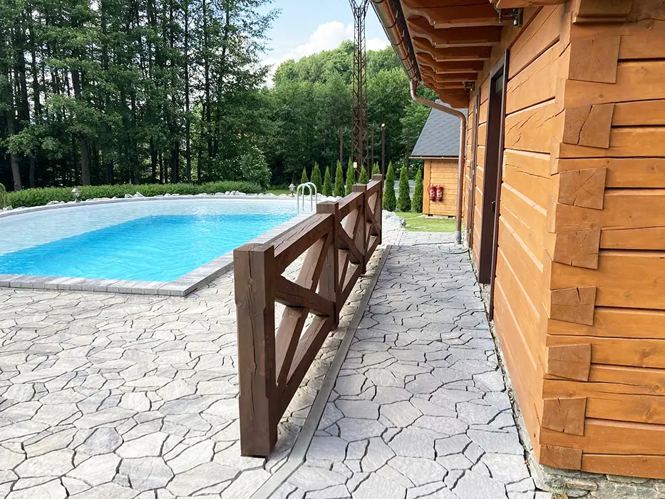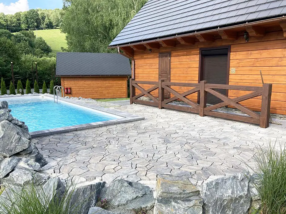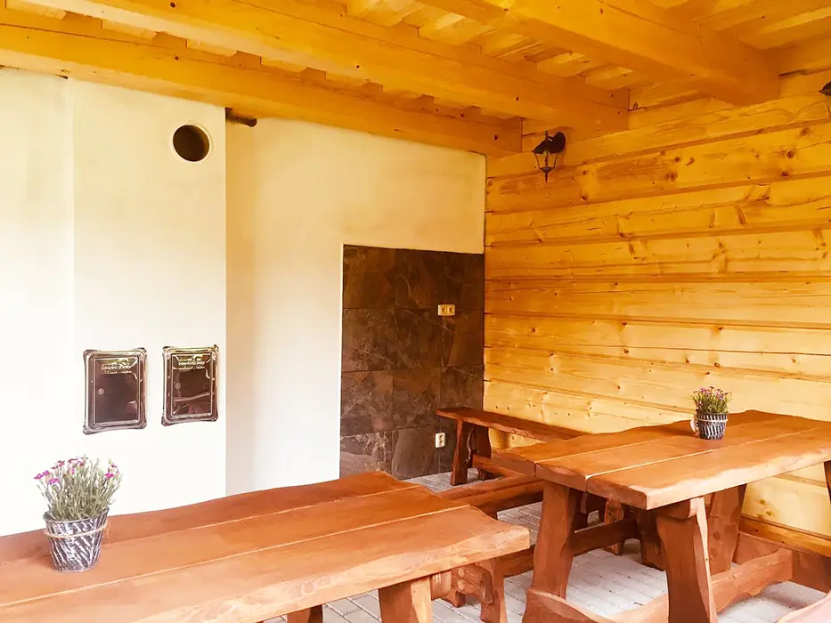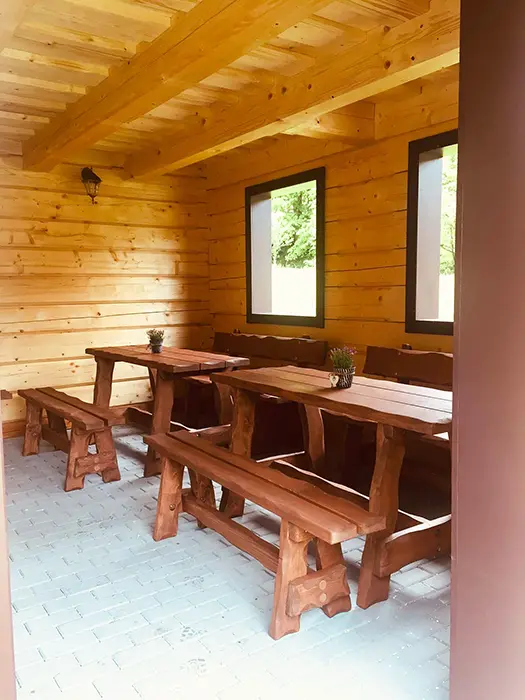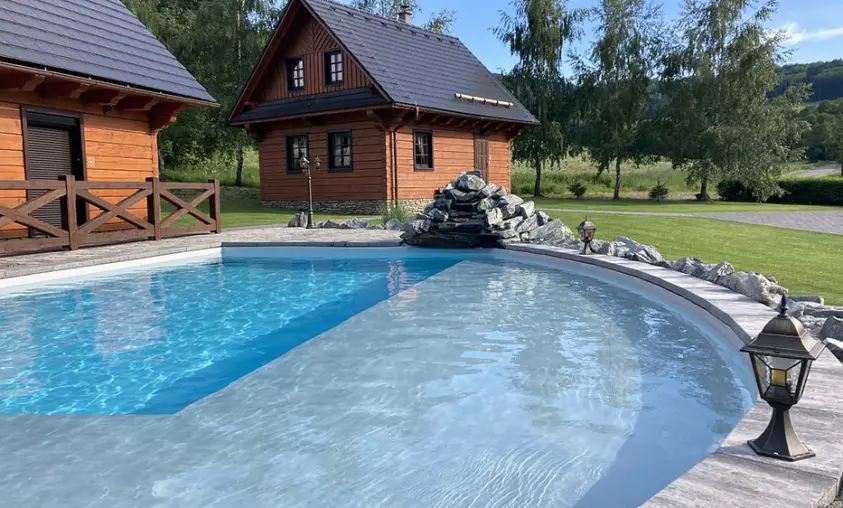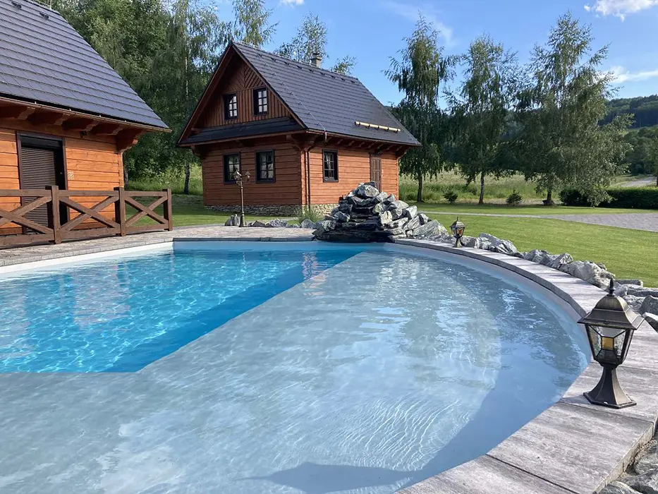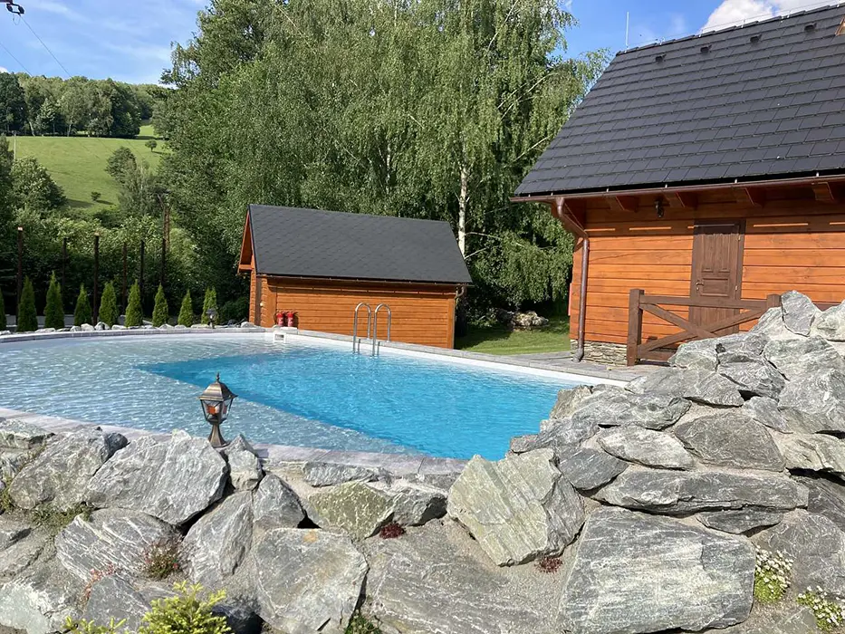 Posezení u chaty + u ohniště, v jedné z roubenek - sauna, posezení, gril - společné pro obě roubenky, bazén 10x4x1,4 m