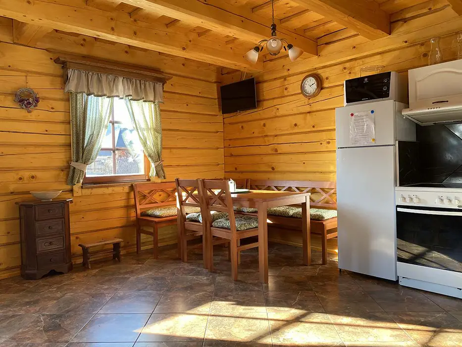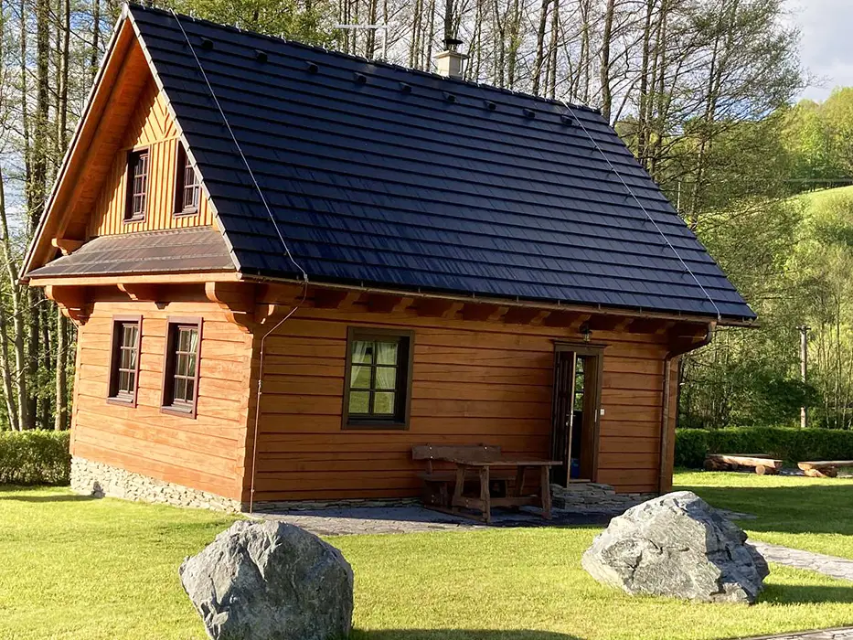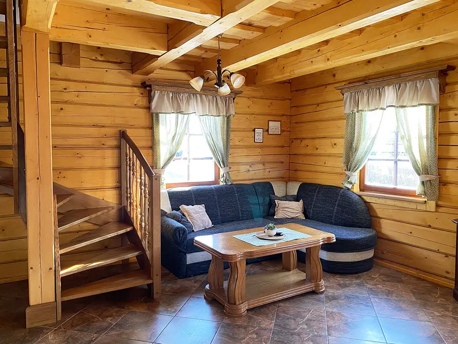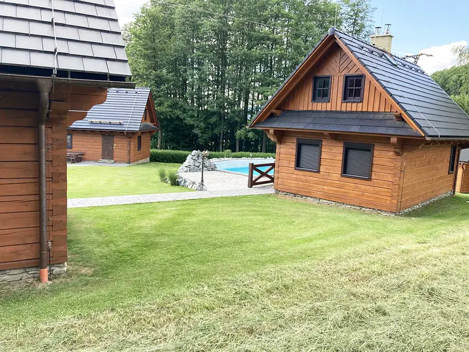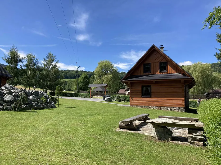 Na jednom pozemku stojí 3 roubenky - 1x - jen posezení, sauna, gril, další dvě: v přízemí obytná část s posezením - sedací souprava, krbová kamna, jídelní stůl a židle, vybavená kuchyně - el. sporák, lednice, mikrovlnka, myčka, presovač, varná konvice, nádobí. V patře 2 ložnice 1x3, 1x4 lůžka, TV. Soc. zařízení - v přízemí koupelna - sprch. kout, WC, pisoár. Topení - elektrokotel, kachlová kamna, podlahové topení