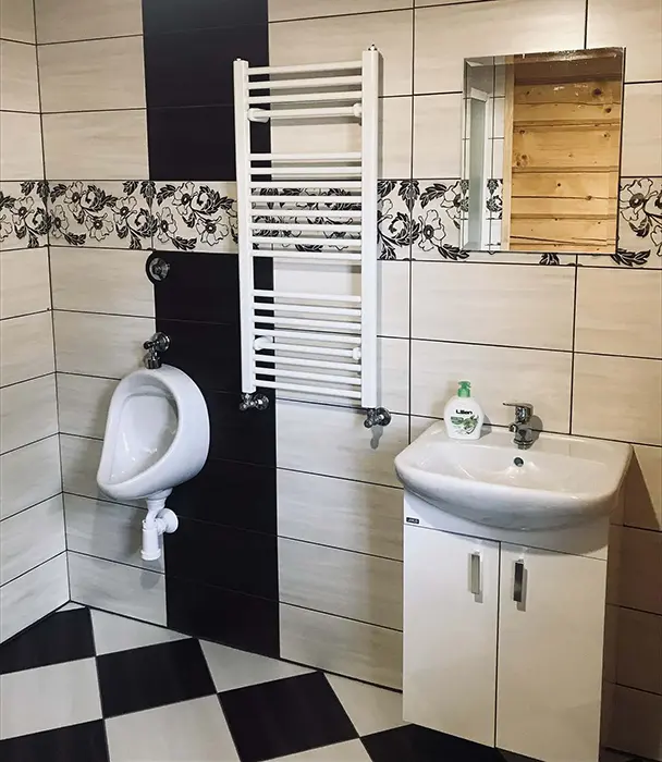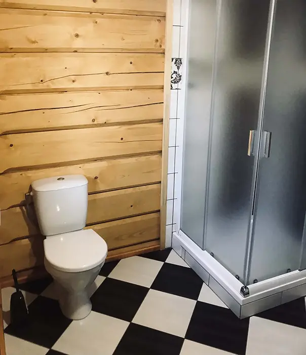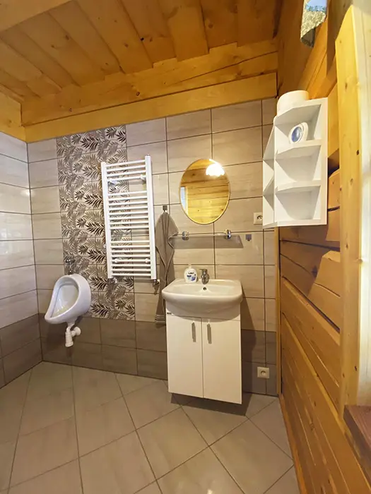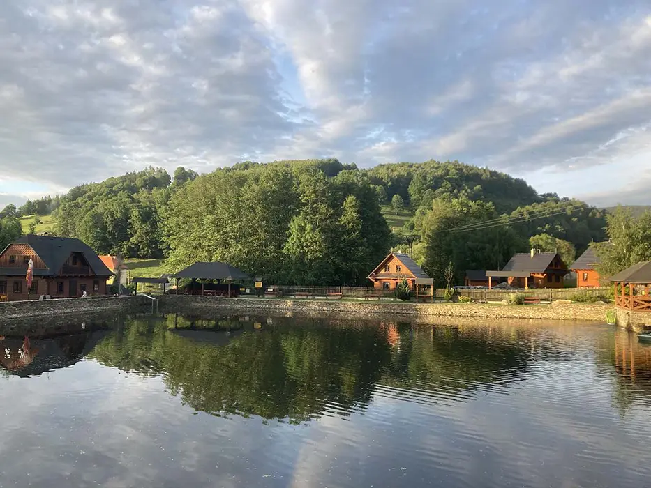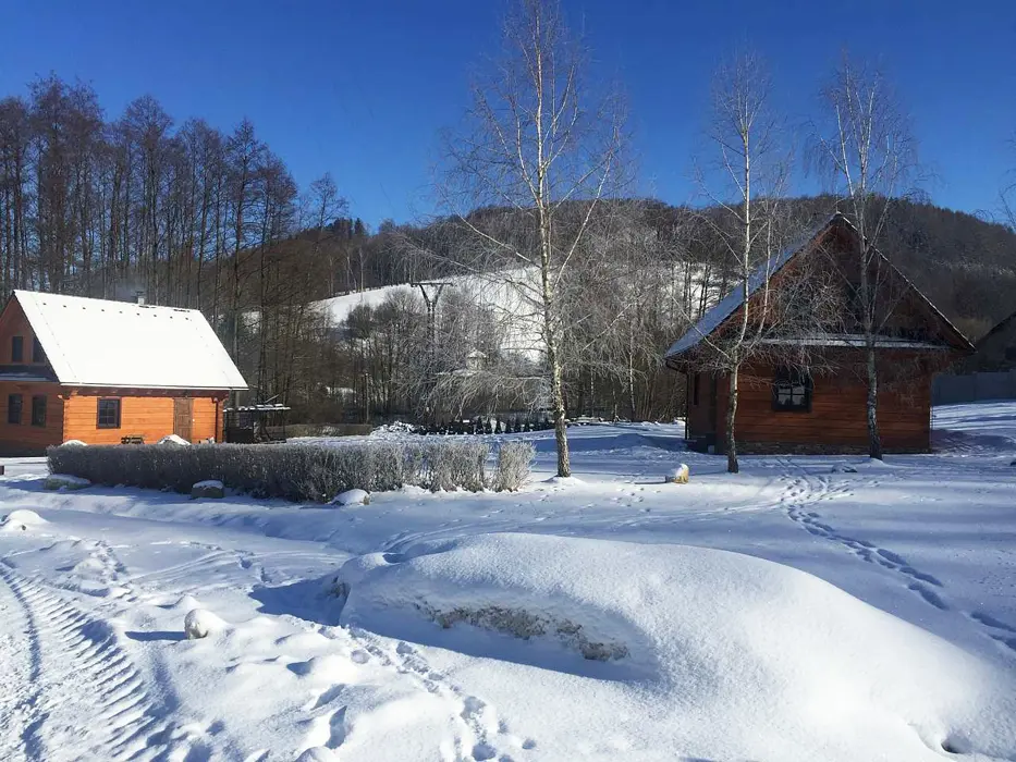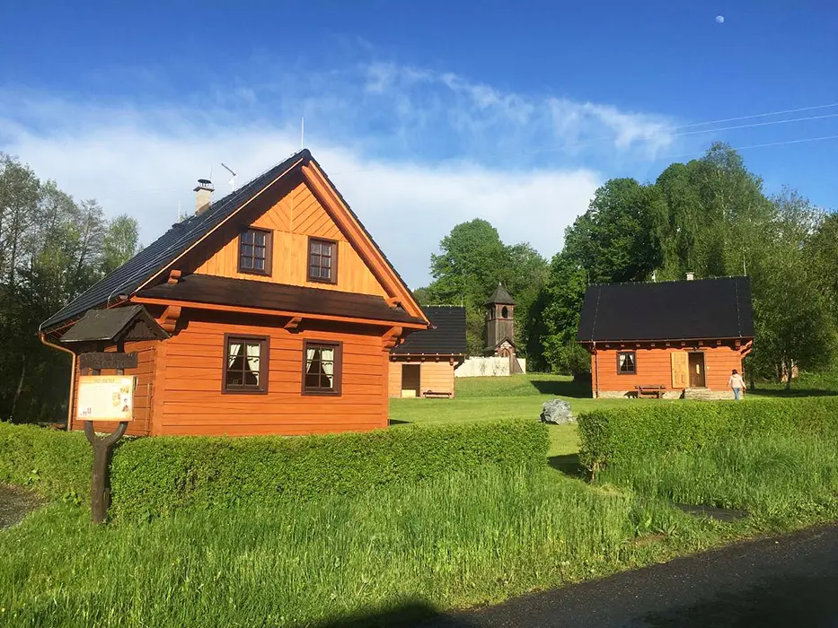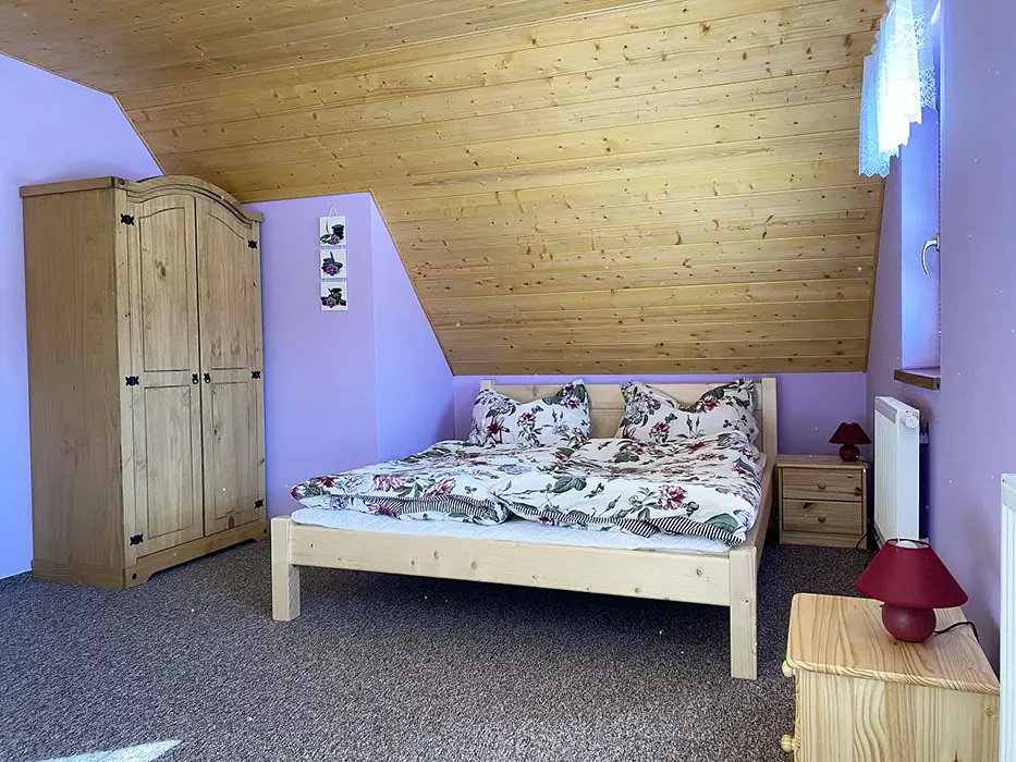 Na jednom pozemku stojí 3 roubenky - 1x - jen posezení, sauna, gril, další dvě: v přízemí obytná část s posezením - sedací souprava, krbová kamna, jídelní stůl a židle, vybavená kuchyně - el. sporák, lednice, mikrovlnka, myčka, presovač, varná konvice, nádobí. V patře 2 ložnice 1x3, 1x4 lůžka, TV. Soc. zařízení - v přízemí koupelna - sprch. kout, WC, pisoár. Topení - elektrokotel, kachlová kamna, podlahové topení