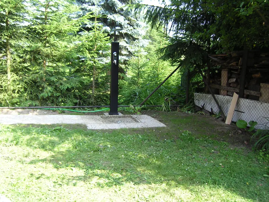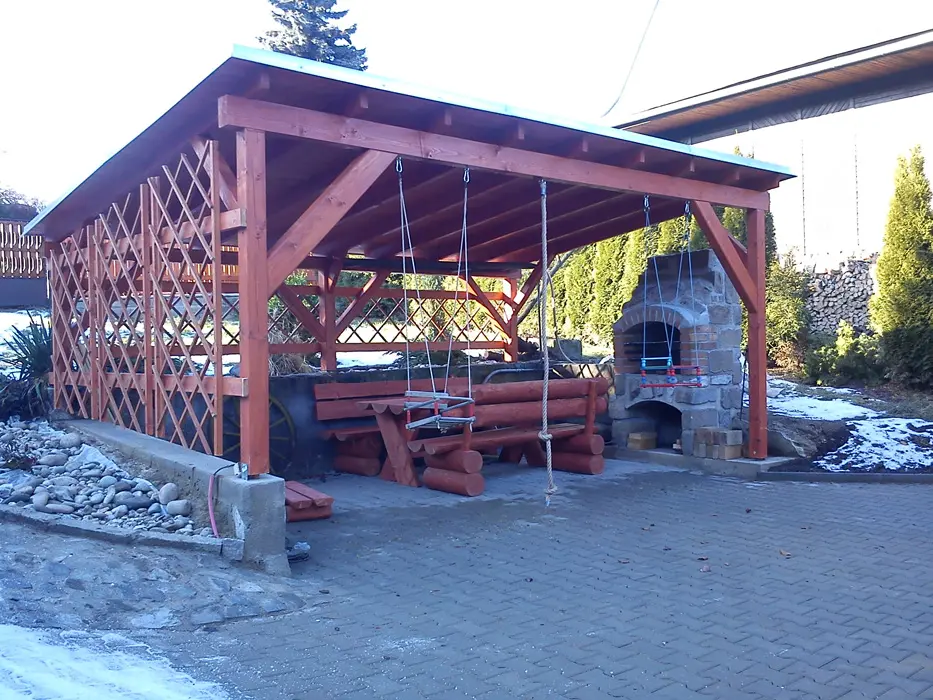 Venkovní zastřešená terasa, krb, ohniště, venkovní solární sprcha, pro děti houpačka
