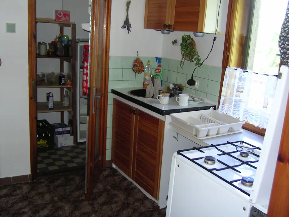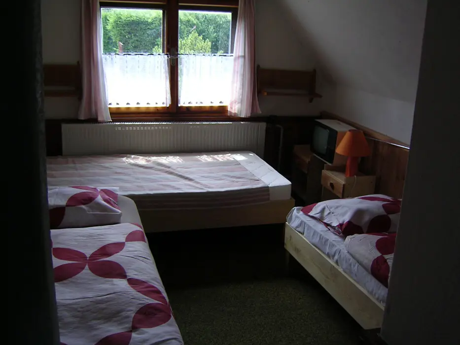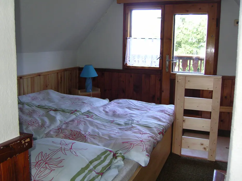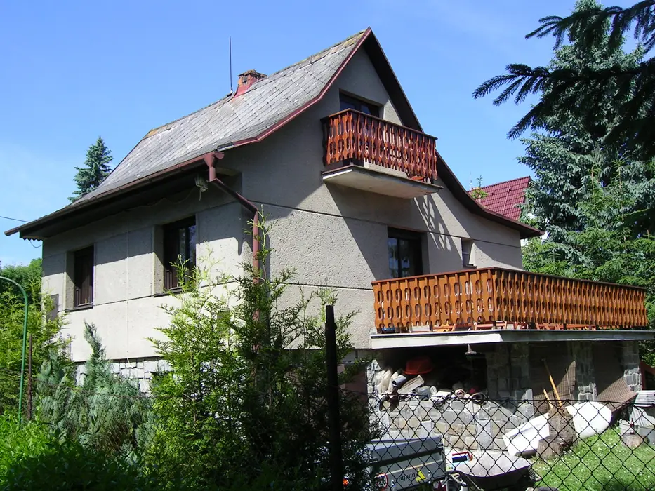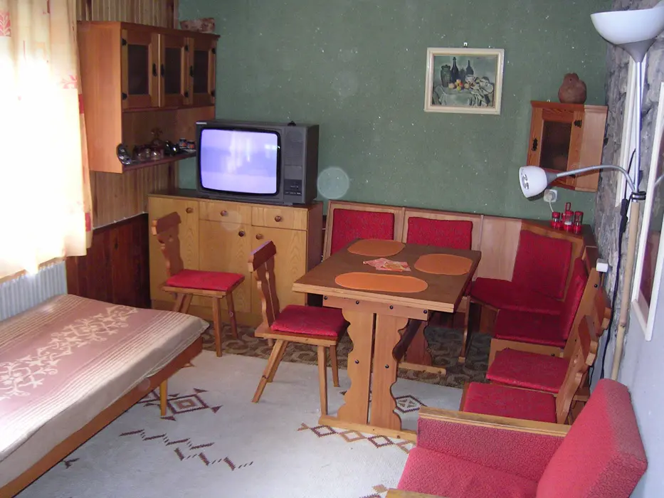 Obývací pokoj s posezením, TV, 3 pohovky - přistýlky. Kuchyně vybavena lednice, plynový sporák s troubou, mikrovlnka, varná konvice, překapávač, topinkovač a základní nádobí. Do patra vedou strmé schody, nahoře 2 ložnice 1x2 - průchozí a 1x3 lůžka - ložnice s balkonem. Na vyžádání - dětská postýlka. Koupelna s vanou, 2x samostatné WC, vždy s umyvadlem, na jedno je vstup ze zahrady. Topení ústřední - kotel na tuhá paliva v suterénu. Dřevo na topení je k dispozici, klienti topí sami. K dispozici také el.přímotopy
