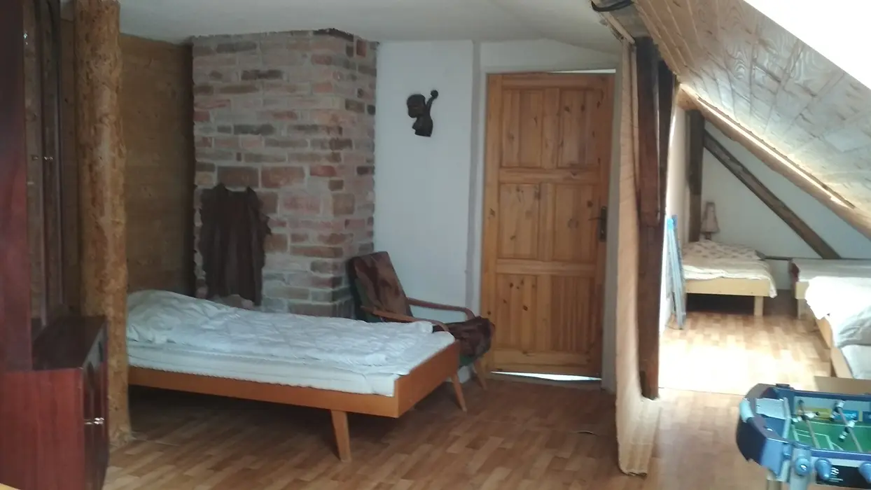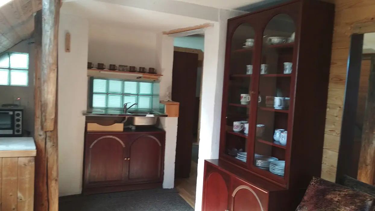 PŘÍZEMÍ: vstup na terasu, prostorná obytná část spojená s kuchyní - sedací souprava, krbová kamna, LCDTV, vybavení kuchyně - plyn. sporák, el trouba, varná konvice, veliká lednice s mrazákem, myčka, mikrovlnka, nádobí. 3 ložnice - 1x2, 2x3 lůžka. Soc. zařízení - 2 koupelny - 1x vana + sprch. kout, umyvadlo, 1x sprchový kout, umyvadlo, samostatné WC s umyvadlem. PATRO: obytná část - 5 lůžek, jídelní stůl a židle, malá kuchyňka - el. dvouplotýnkový vařič, lednice, varná konvice, mikrovlnka, nádobí. 3 ložnice - 2x2, 1x3 lůžka. K dispozici dětská postýlka a pračka. Soc. zařízení - koupelna se sprchou + WC. Topení - centrální