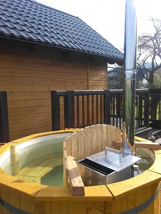 Finská koupací káď - je součástí terasy u relaxační chaty a vstupuje se do ní z terasy. Dá se používat jak na ochlazování po finské sauně, tak se v kádi topí v nerezových kamnech na teplotu 38-40 st.C a slouží pro relaxaci v teplé vodě, kapacita kádě jsou 3 osoby