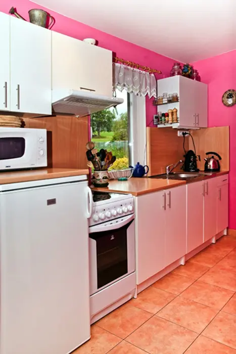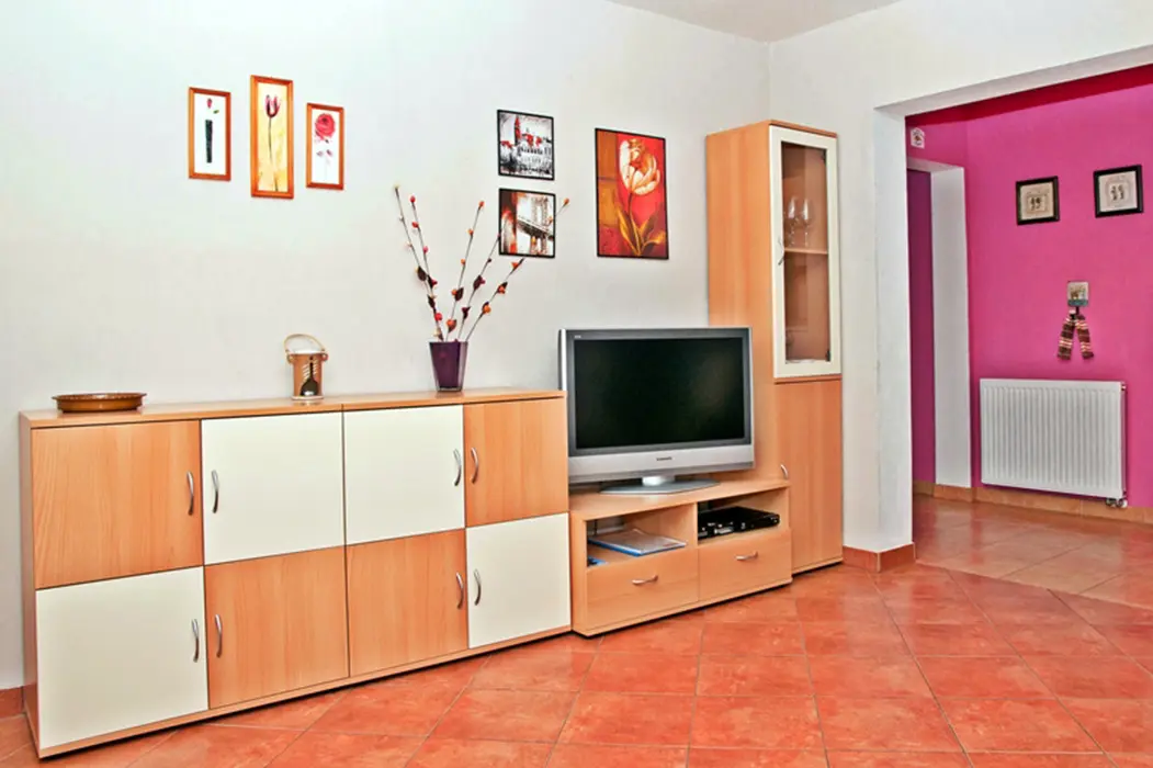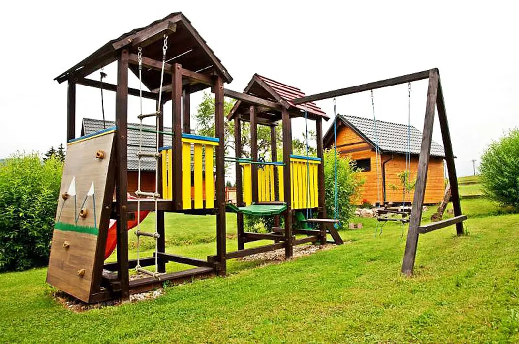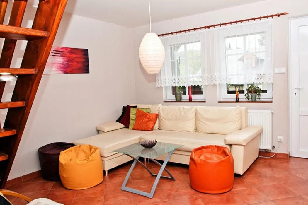 V přízemí obývací místnost - sedací souprava, BTV+SAT, DVD, kuchyně - el. sporák, mikrovlnka, varná konvice, kávovar, lednice s mrazákem, jídelna, koupelna se sprchovým koutem, samostané WC. V patře 2 samostatné ložnice - 1x2 + dětská postýlka, 1x3 lůžka. Dále technická místnost na lyže a kola, velká terasa. Vytápení je zajištěno plynovými kotli s ohřevem teplé vody.