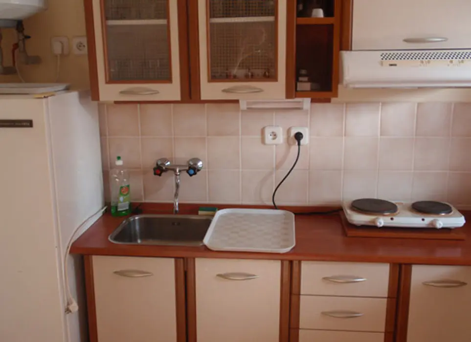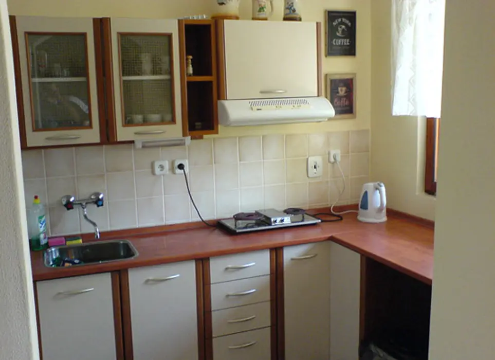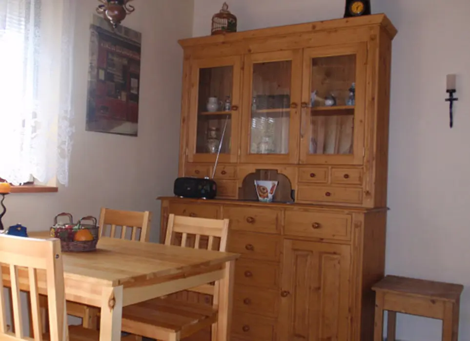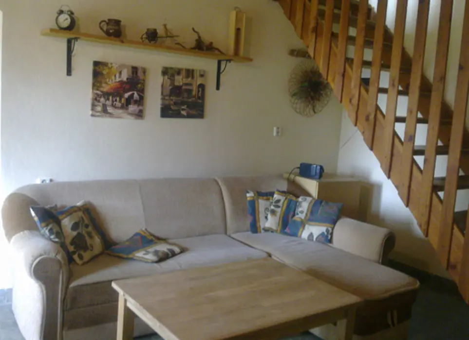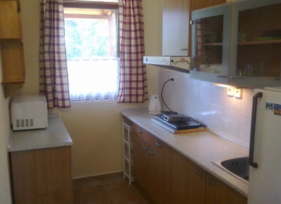 V přízemí obývací pokoj se sedací soupravou, BTV. Malá kuchyňka - el. vařič, lednice, mikrovlnka, varná konvice, nádobí, teplá voda. V patře 2 ložnice 2x3 lůžka - jedna je průchozí, možnost 2 přistýlek. Soc. zařízení - umyvadlo, sprchový kout, WC. Topení - tuhá paliva